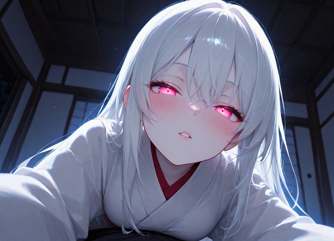 general,at bedroom,at night,darkness, 1girl,1male,pov,(from below:1.2),ghost girl,looking at viewer,imminent kiss, white hair,long hair,pink eyes,glowing eyes,white kimono,pale skin,blush,half-closed eyes,transparent,, appropriate posture,appropriate configuration,ideal ratio body proportions,perfect anatomy, <lora:Fixhands_anime_bdsqlsz_V1:1>, masterpiece,best quality,newest,absurdres,highres,ultra high res,8K UHD,hyper-detailed,