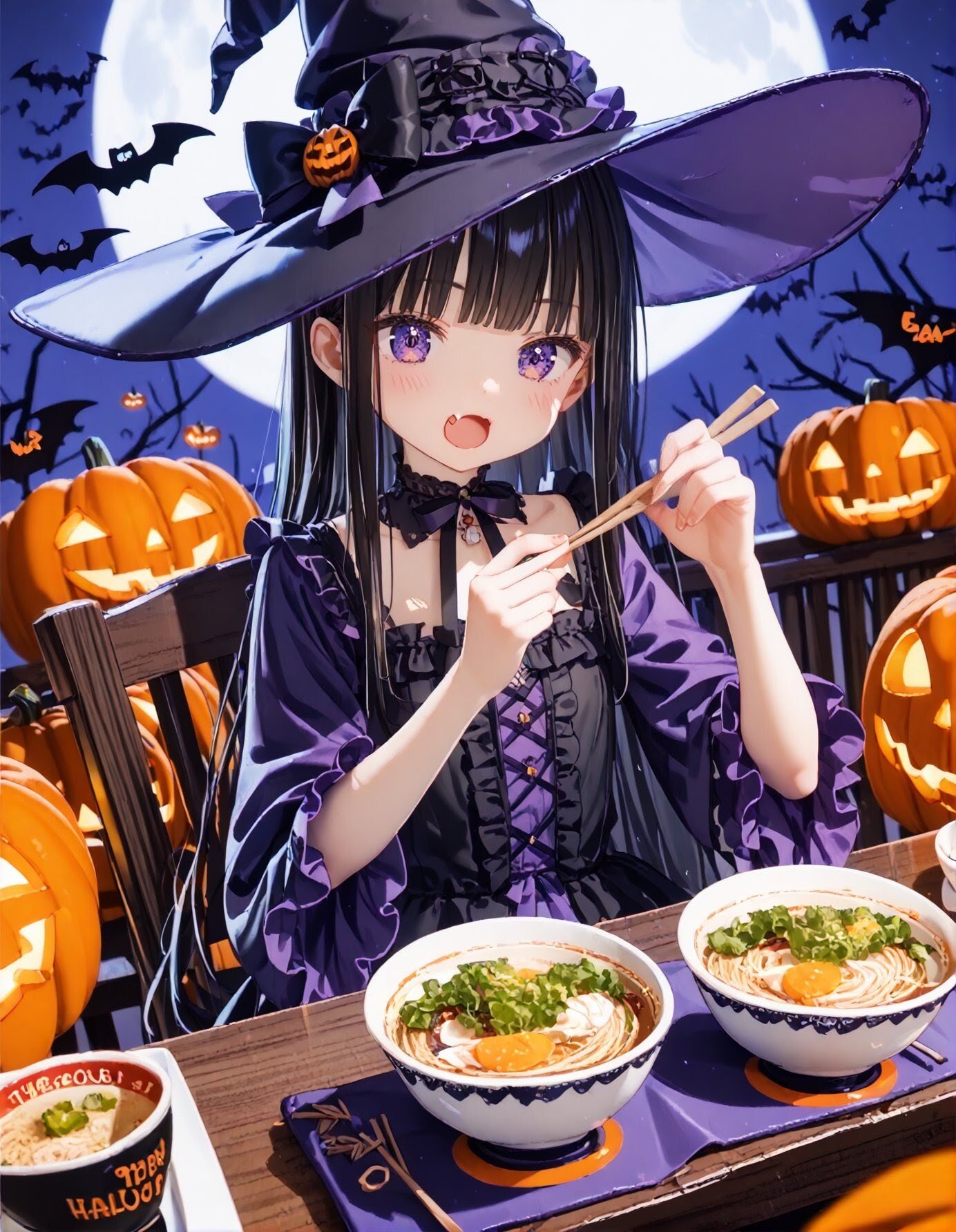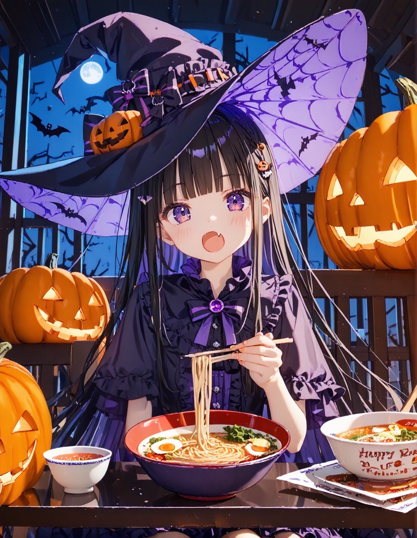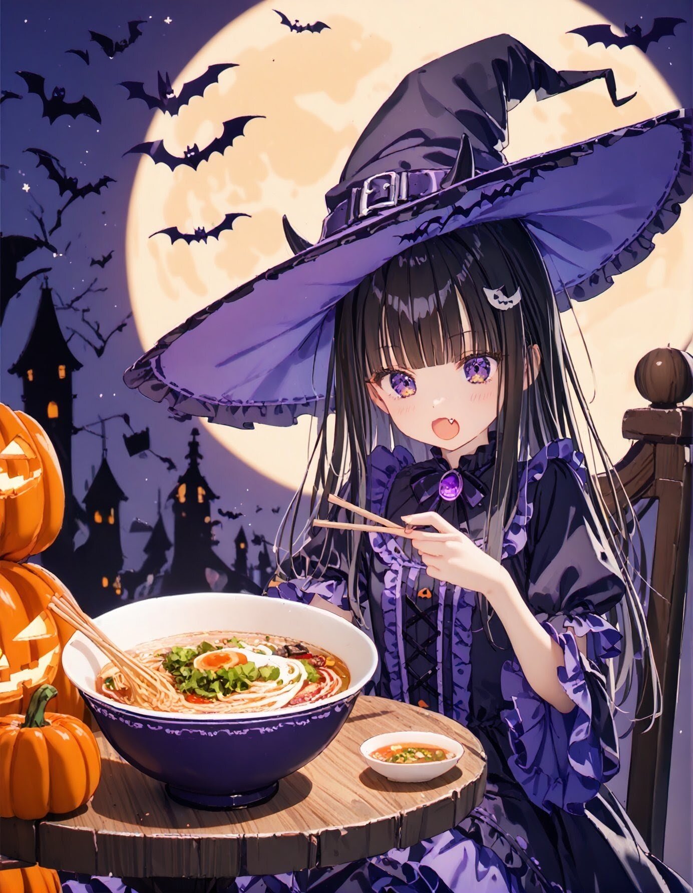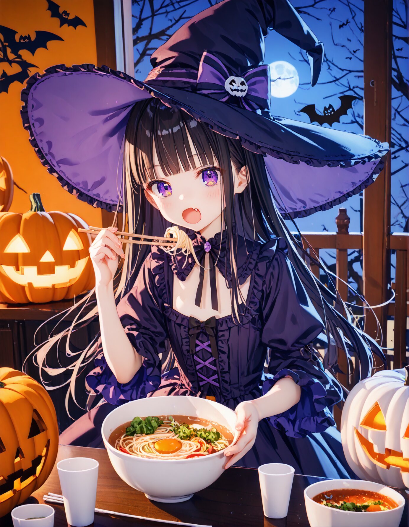 score_9, score_8_up, score_7_up, score_6_up, score_5_up, score_4_up, rating_safe, masterpiece, best quality, high quality, highres:1.0, ultra detailed, incredibly absurdres:1.0, textuer:1.0, source_anime:1.0, resized, vivid colors, perfect composition, (perfect anatomy:1.3), five fingers, beautiful detailed skin, extremely detailed clothes, detailed prism eye, (Halloween Theme:1.3), 1 cheeky girl, detailed face, cheeky face, detailed mouth, (black hair), long hair, blunt bangs, small breast, (slender), witch hat, witch costume, witch girl, (orange and purple theme:1.2), lolita fashion, frilly dress, open mouth, fang, (Eat a ramen), Hold a bowl, Holding chopsticks, sitting a chair, a ramen on a wooden table, Jack-o'-lanterns, flying bats, night time, moon lighting,