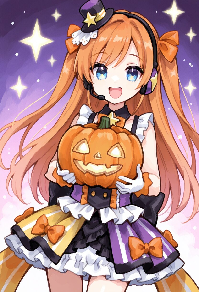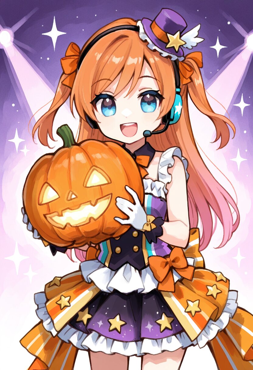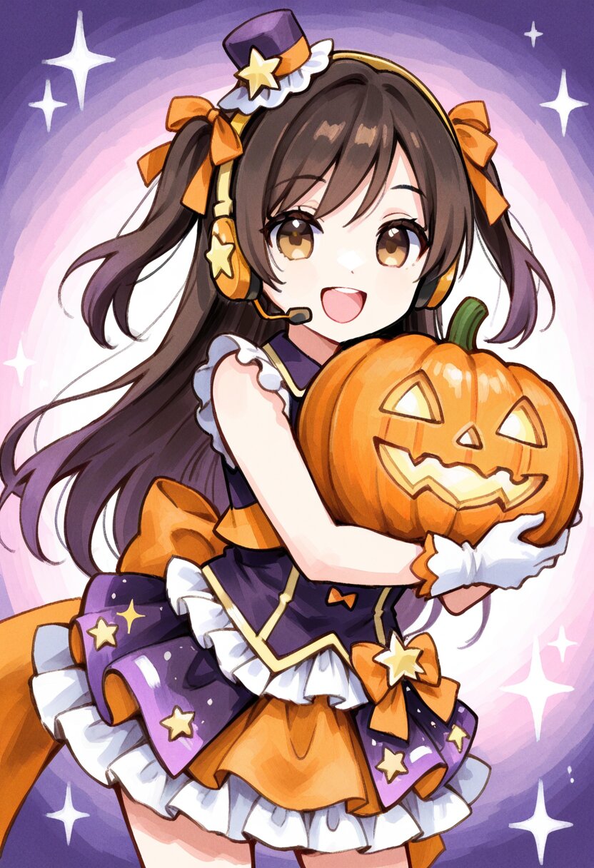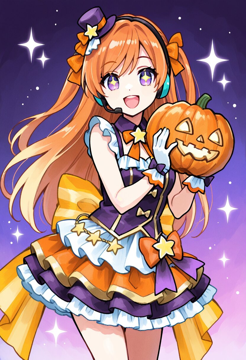 <lora:inmnstyleilxl:0.9>,best quality, masterpiece, very aesthetic, general, watercolor painting, 1girl, chibi, solo, glamorous idol costume, frilled dress in orange, purple, and white, gold decorations, short skirt with layered frills, orange ribbons and bows, gold star accessories, small hat with ribbon, detailed outfit design, smiling, holding halloween pumpkin, smile, open mouth, headset, shining stage lights, sparkling background, high detail, vivid colors, dutch angle
