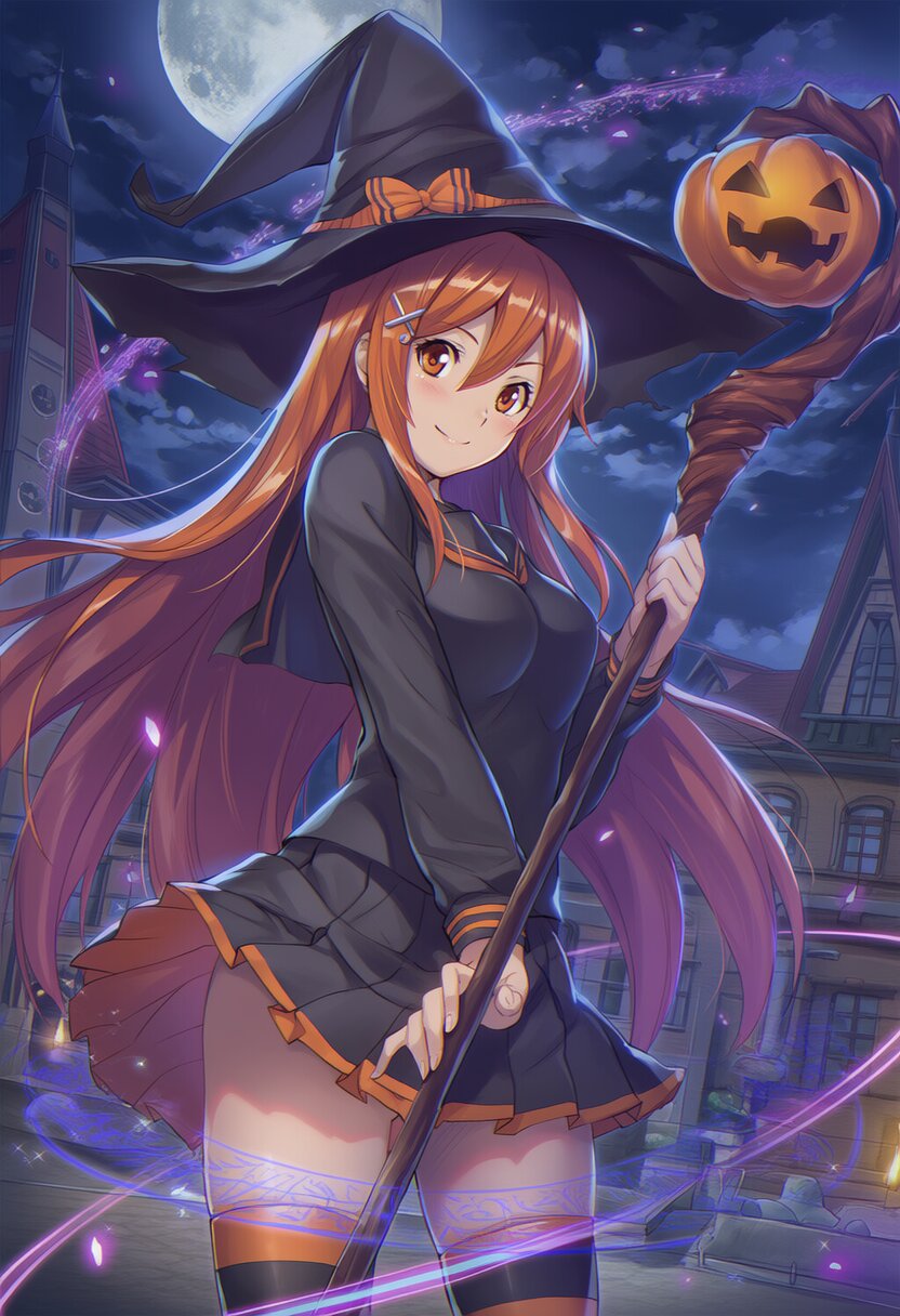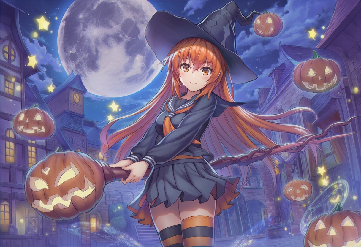 {{{highly detailed}}}, {{official style}}, {100-layer}, {{{ultra-high resolution}}}, {{{hi-vision anime}}}, {{intricate}}, {{{detailed beautiful eyes, detailed beautiful face, detailed beautiful face and eyes}}}, 1girl, solo, orange eyes, very long hair, straight hair, orange hair, hair between eyes, medium breasts, {{smile}}, blush, cowboy shot, {{halloween}}, {{school black uniform, black and orange stockings, pointy hat}}, {{carrying a pumpkin staff}}, {{{dark magic, dark magic circle}}}, pumpkin, pumpkin girl, bewitching witch, jack-o'-lantern, wandering soul, full moon night, school, brick medieval european fairy tale schoolhouse, {{{{magical fantasy effects}}}}, vibrant colors, magic lights are flying around, night, {{{{magical effect}}}}, no human, {{{masterpiece}}}, {{{best quality}}}, {{{very aesthetic}}}, {{{ultra-detailed}}}, {illustration}, {{{extremely detailed}}}, {{{an extremely delicate and beautiful}}}