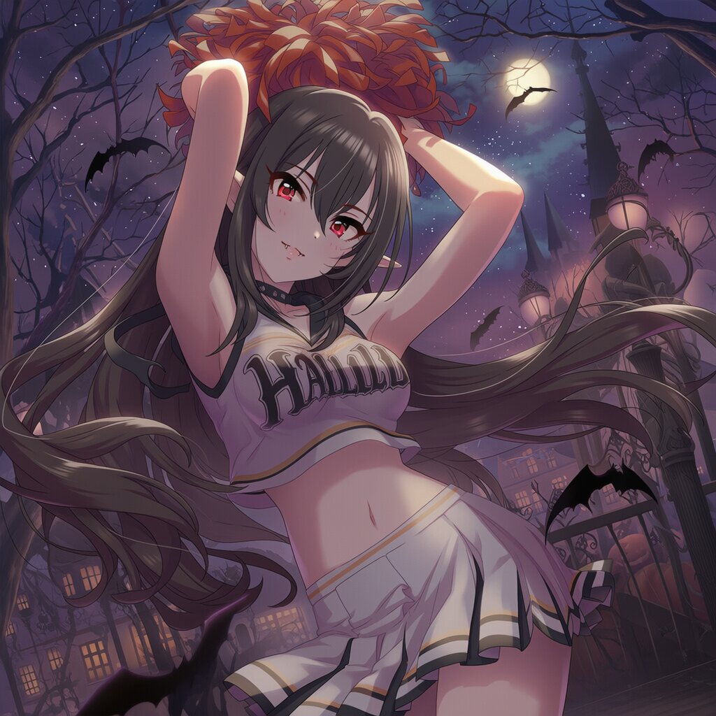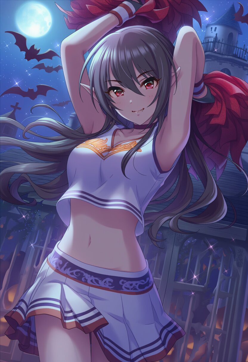 {{{highly detailed}}}, {{official style}}, {{game cg}}, {{intricate}}, {{{detailed beautiful eyes, detailed beautiful face, detailed beautiful face and eyes}}}, 1girl, solo, {{idolmaster cinderella girls}}, red eyes, long hair, black hair, hair between eyes, medium breasts, elven ears, light smile, cowboy shot, {{{halloween, halloween costume}}}, delicate and of a female vampire standing on a castle porch under a starry sky, super delicate face with dynamic angles, super feminine, {charming smile: 1.5}, navel, {{wearing white cheerleader costume, halloween costume}}, {{holding a red pompon}}, {{{arms up}}}, star-filled sky background, moon, bats flitting about, {bats: 1.5}, starry sky, {{{masterpiece}}}, {{{best quality}}}, {{{very aesthetic}}}, {{{ultra-detailed}}}, {illustration}, {{{extremely detailed}}}, {{{an extremely delicate and beautiful}}}