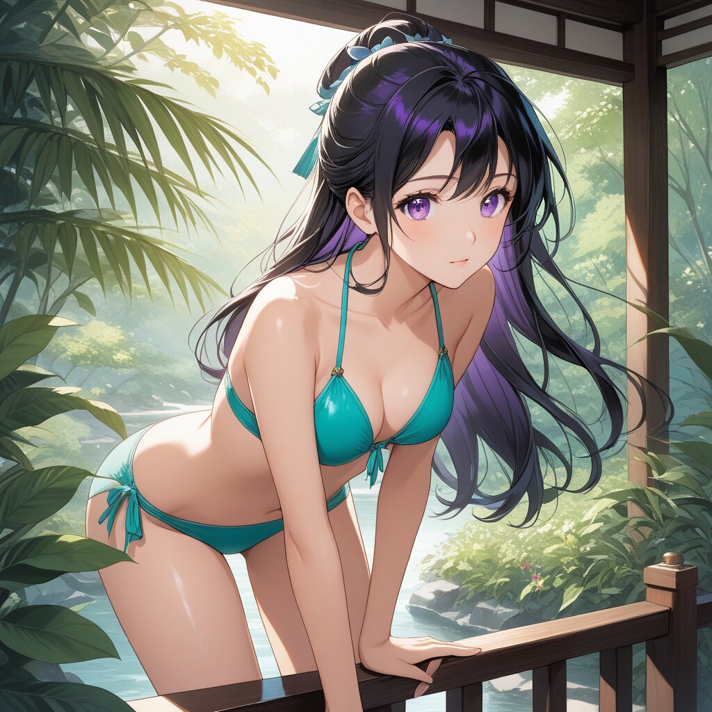A highly detailed and exquisitely rendered anime-style illustration of a young woman with long, flowing black hair and captivating purple eyes, wearing a shiny turquoise bikini. She is depicted in the same charming pose, slightly leaning forward, with a gentle, inviting gaze. The lighting is soft yet highlights the subtle sheen on her skin and the fabric of her swimsuit, emphasizing a delicate glow. The background subtly suggests a traditional Japanese-style veranda with lush greenery in the distance, maintaining the original composition and atmosphere.
