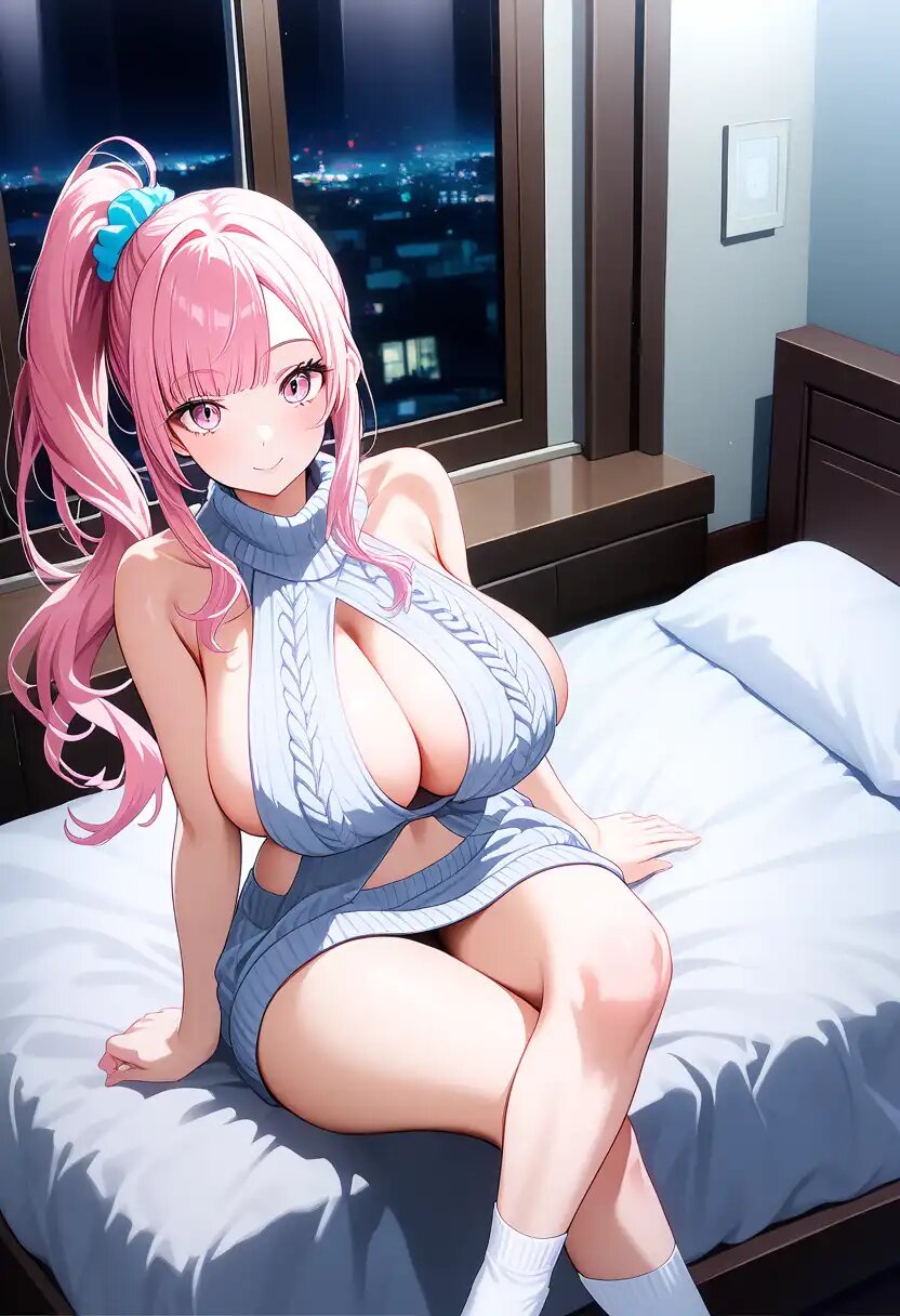 [virgin killer sweater]++, [beautiful girl]++, [huge breasts]++, perky breasts, hanging breasts, curvy, cleavage, bare shoulders, bare arms, hair scrunchie, [crossed legs]++, [sitting on bed]++, midriff, bare legs, socks, [full body]++, [Beautiful skin]++, tall, [long hair]++, shiny, shiny skin, [big eyes]++, [shining eyes]++, [Beautiful legs]++, [beautiful face]++, smile, blush, closed mouth, bedroom, night, indoors, window, Night view, high side ponytail,
