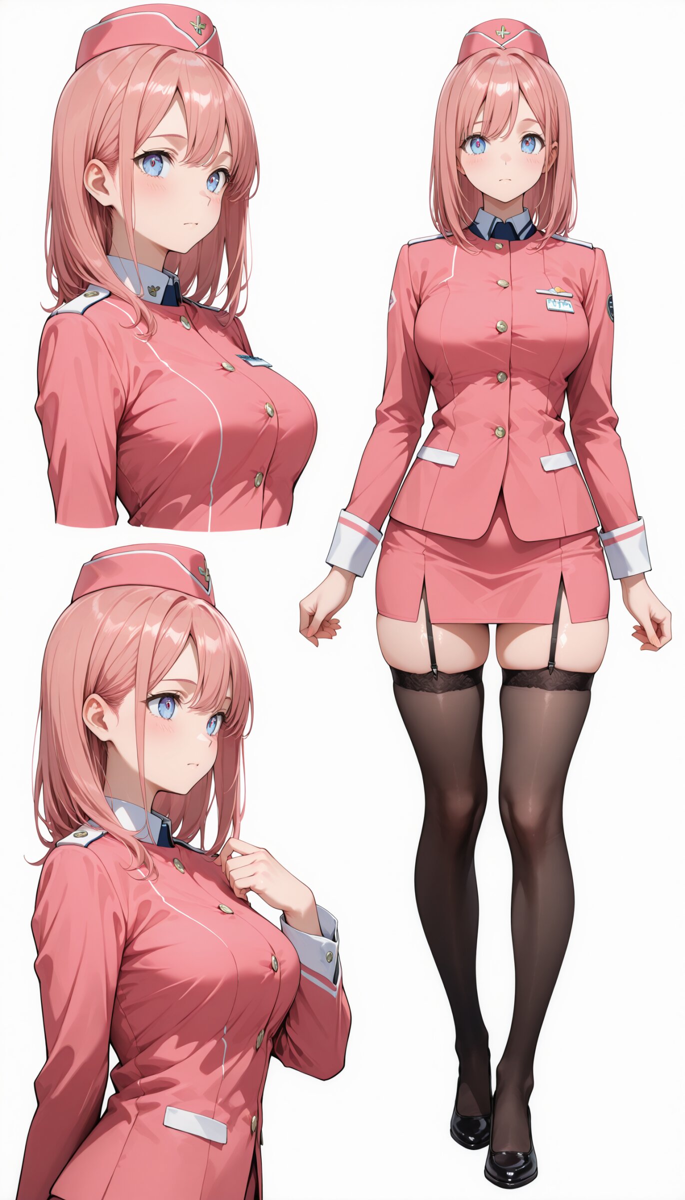 1girl,{nsfw},light blue eyes,pink flight attendant uniform,pink uniform, upper body focus,stockings,(white background), reference sheet, (((2views))),left side of image full body shot , right side of image close-up shot,standing,from forward,(((Multiples views))),best composition, (perfect body), (nice hands), (sharp focus),(perfect hands), perfect face, perfect eyes, skin indentations, shiny skin, (intricate:1.2), (anime coloring:1.5), high contrast, (masterpiece:1.2), (best quality:1.2), (very aesthetic:1.2), (absurdres:1.2), (detailed background:1.5), newest, (beautiful detailed eyes:1.2), beautiful, amazing, (intricate details:1.2), ,cinematic angle, color detail, Depth of field, long exposure, vibrant colors,cinematic angle,color detail, Depth of field, long exposure,Composition, foreshortening, positioning, pose, improved pose,body composition, facial expression, expression, masterpiece, sharp lines,