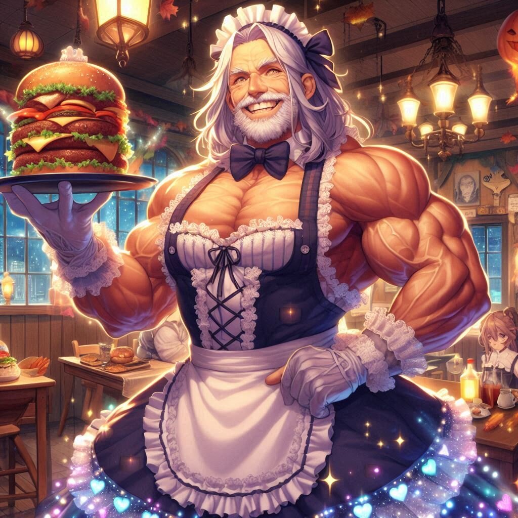 日本のアニメの画風でセミリアルな萌えヒロイン。映画のワンシーンの様な構図とアクション。ファンタジーな世界の酒場。日本のアニメのセミリアルな劇画調のシブイキャラ。マッチョの老人は歴戦のプロボディビルダー。彼は幻想的な煌めく光と光の粒子で構成された魔法のハロウィンテーマのメイド服を着て大きなハンバーガーセットが載せられたトレイを手に満面の笑顔で給仕。彼は楽しそうな笑顔で私を見つめている。夜間。