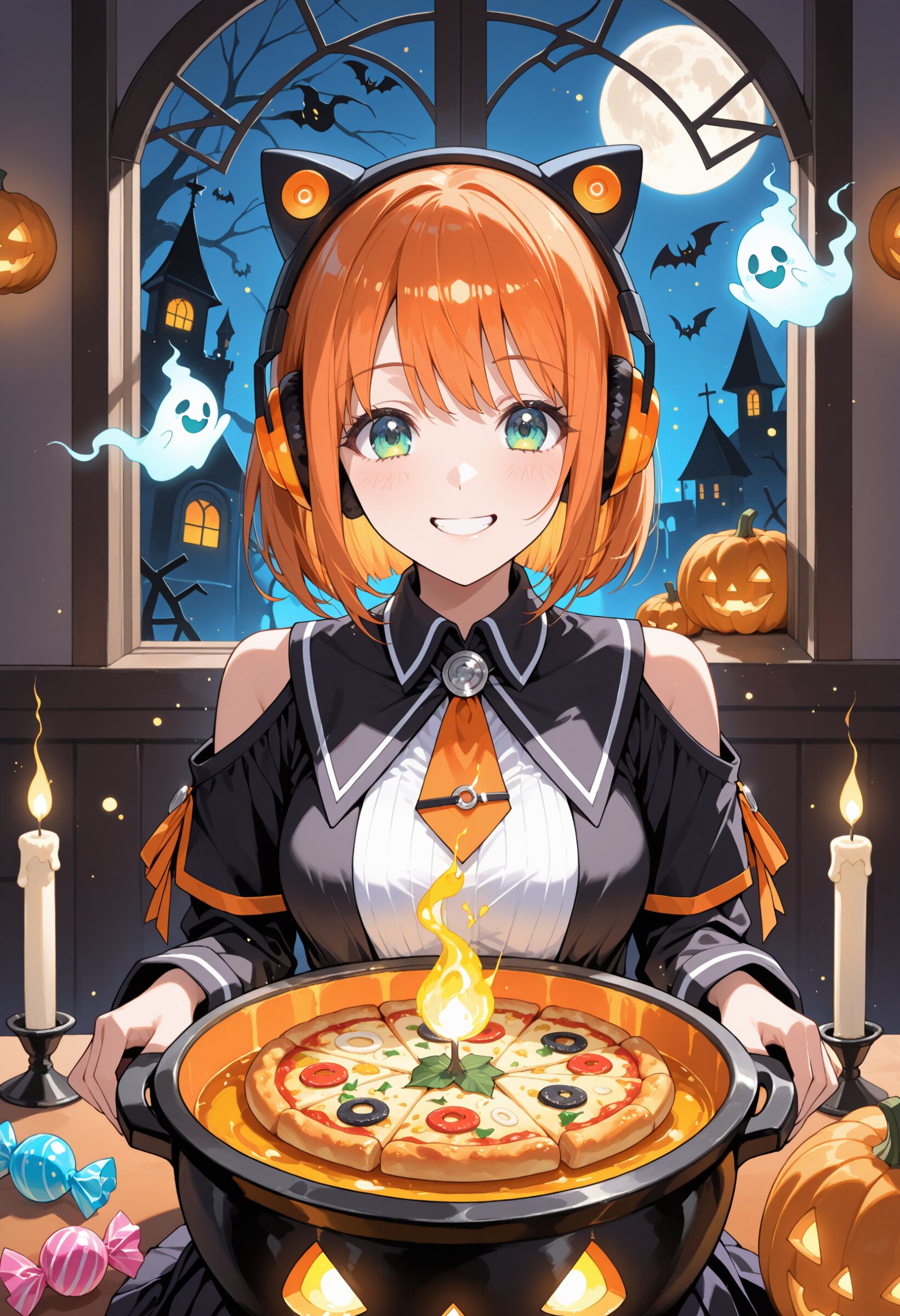 Full-body portrait of Zena, a cheerful Japanese idol student with vivid orange bob hair and matching orange headphones, wearing a cyber-pop inspired magical academy uniform in bright orange, pink, and black. Her costume has shoulder slits, a short pleated skirt, and a glowing Halloween-themed ribbon on her chest. She sits at a long table inside the grand dining hall of her magic academy, during the Halloween festival dinner. The entire hall glows with a dreamy magical light—floating candles, jack-o'-lantern lanterns, and bat-shaped holograms flutter in the air. The atmosphere feels both adorable and spooky, with a playful Halloween charm. On the table are colorful Halloween dishes designed with cute yet creepy details: – a pumpkin-shaped pizza smiling mischievously, its cheese glowing in orange light like molten magic, – black sushi rolls shaped like tiny ghosts, with glowing purple rice and candy eyeballs peeking from the center, – a pumpkin soup cauldron that bubbles with emerald light, creating small ghostly steam faces that fade into the air, – and a roasted chicken with candy-colored flames around it, carved with charming bat patterns on the skin. Each dish moves slightly, enchanted by gentle Halloween magic. When Zena takes a bite, the food sparkles with glowing particles and releases soft laughter-like sounds. She smiles brightly, eyes wide with wonder, her orange hair shining under the floating light. Her orange headphones softly pulse with magical sound waves, matching the rhythm of her excitement. Other students around her cheer and laugh, dressed in cute and spooky costumes. The walls of the dining hall shimmer with animated jack-o'-lantern faces and twinkling candy stars. A giant glowing moon is projected on the ceiling, surrounded by flying ghost lights.