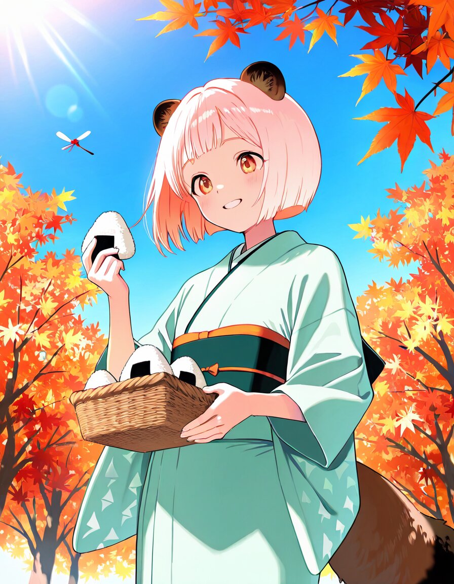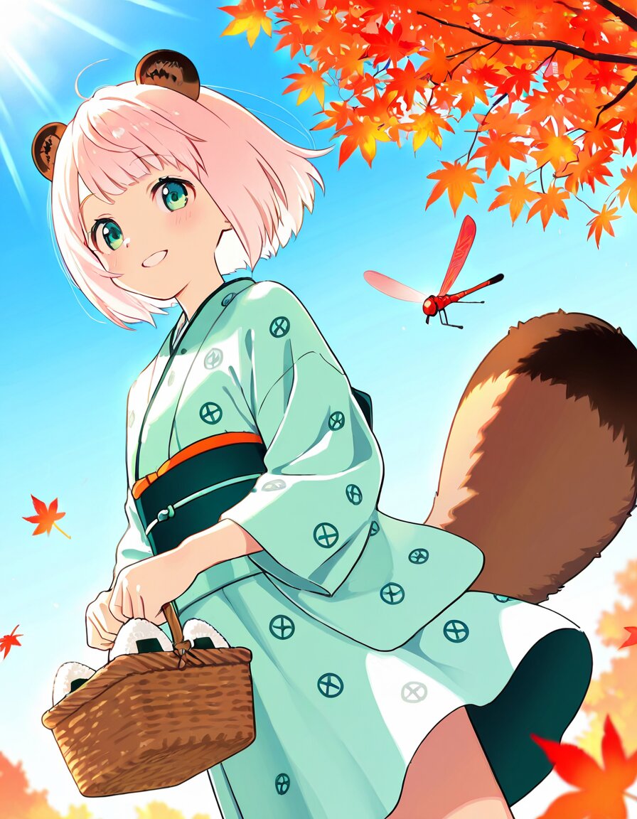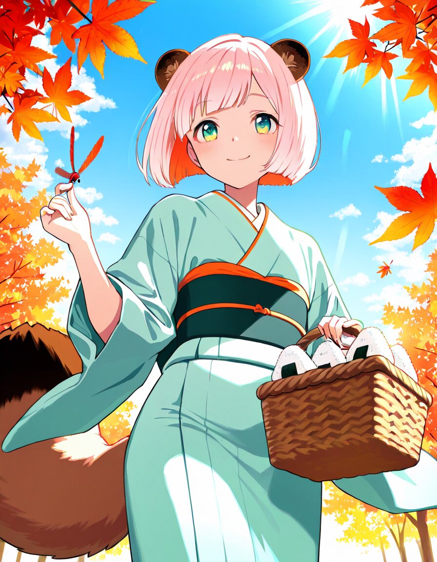 low-angle view,kawaii,flat chest,(light red short bob hair:1.4),wearing a modern style mint green pastel kimono with subtle asanoha geometric patterns,deep navy obi with thin silver line tied simply,fluffy tanuki ears and large fluffy tail spreading naturally behind her,a red dragonfly gently resting on her tail,holding an onigiri in one hand and a woven lunch basket in the other,surrounded by vibrant red and orange maple leaves,clear blue sky above,sunlight shining brightly through autumn branches,gentle smile,wind lifting maple leaves around her,bright and cheerful atmosphere,vivid colors,detailed anime shading,soft light reflections,depth of field,masterpiece,high quality,