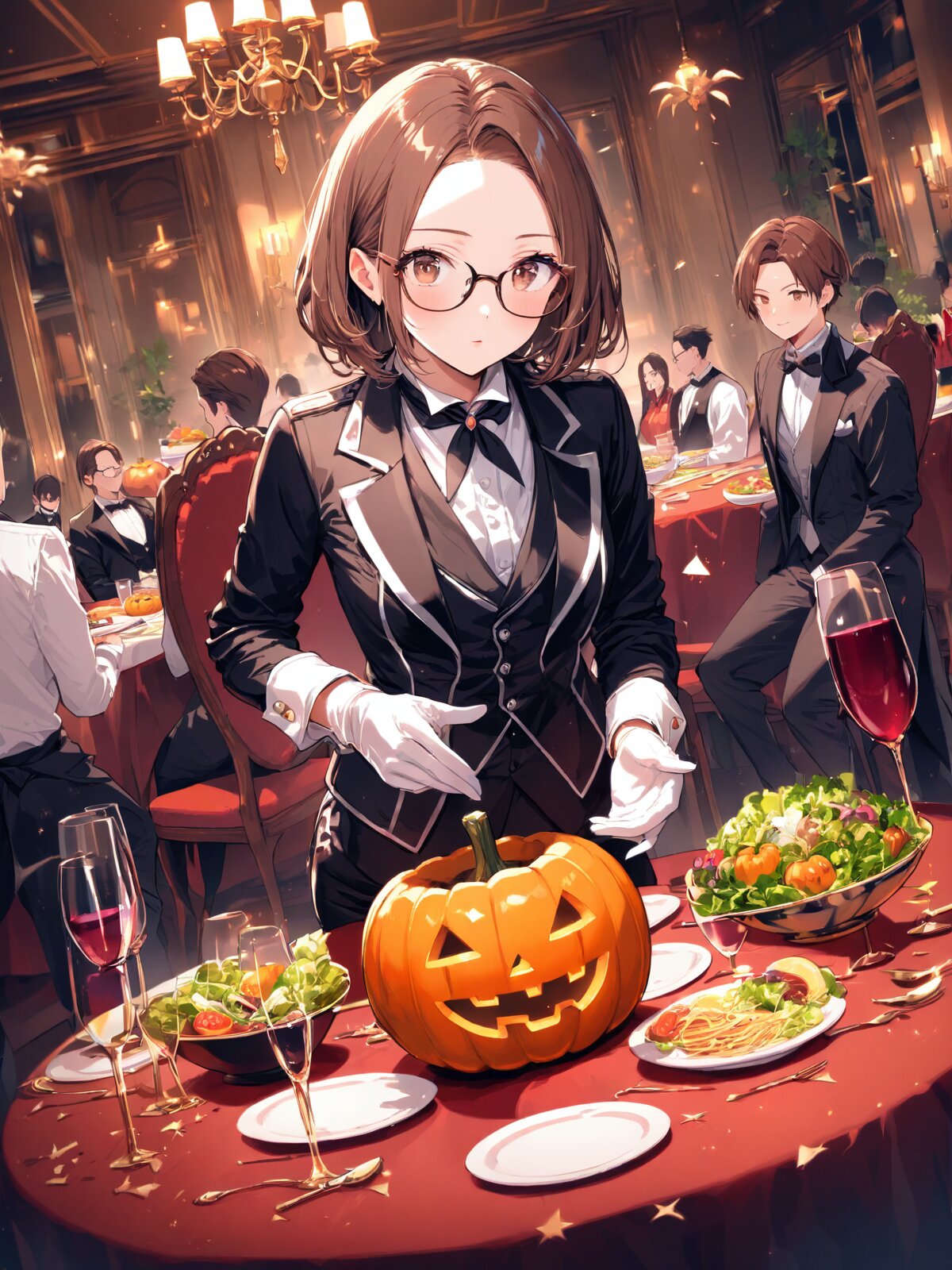 salad bowl, gorgeous dinner, butler, elegant, party, wine, table, chair, restaurant, waiter, servant, BREAK, Halloween, background pumpkin object, magic academy, woman, forehead, glasses, brown hair, brown eyes, short hair,