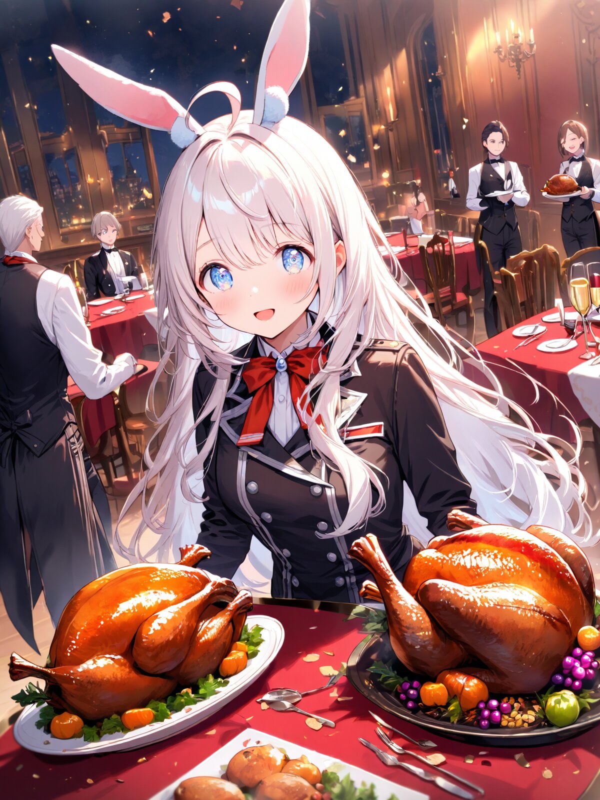 roasted turkey, gorgeous dinner, butler, elegant, party, wine, table, chair, restaurant, waiter, servant, BREAK, Halloween, magic academy, dynamic angle, light white hair, light pink inner hair, blue eyes, ahoge, long hair, tareme, Rabbit ears,