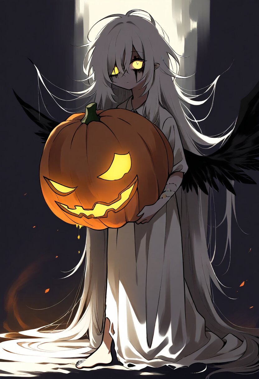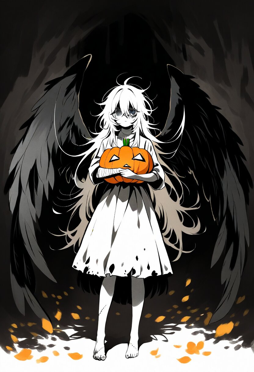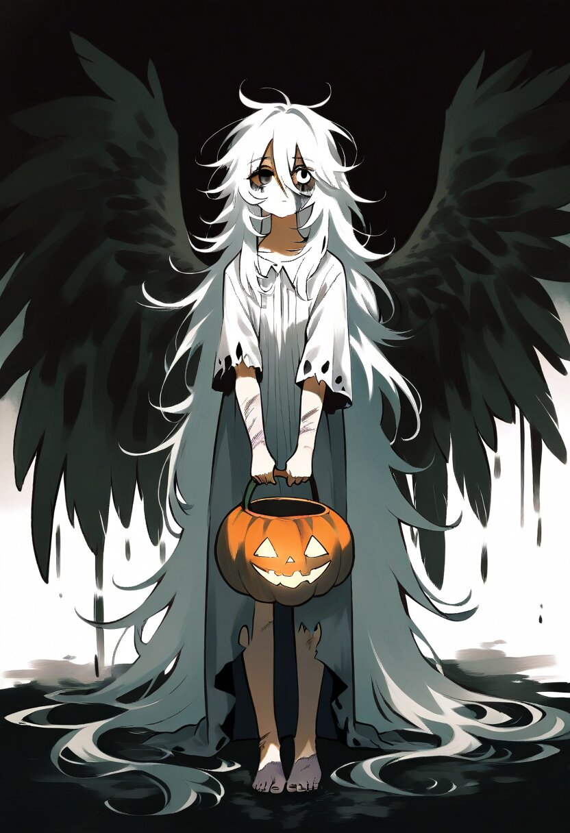 <lora:inmnsylexl4:1>best quality, masterpiece, very aesthetic, watercolor painting, general, 1girl, white hair, very long hair, messy hair, runny makeup, dripping eye, bugs under eye, dirty white dress, torn dress, large black wings, evil eyes, glowing eyes, expressionless, barefoot, stitched face, stitched foot, stitched arms, flattering feather, dark theme, holding pumpkin