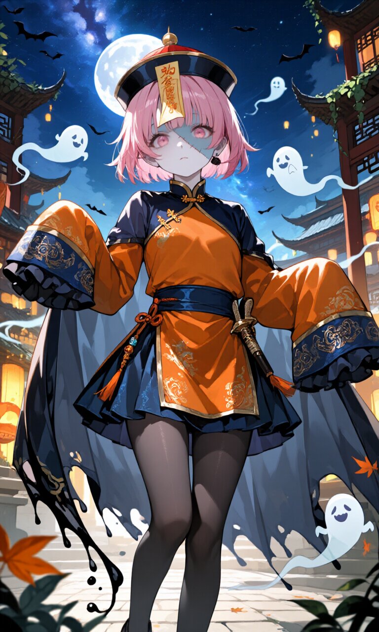 1girl, 17 years old, loli, undead jiangshi, pale white skin with intricate surface textures and faint stitching along her cheeks, short pink hair with delicate strands catching the moonlight, pink eyes void of emotion yet hauntingly beautiful, wearing a luxurious orange tangzhuang prince costume with ornate gold embroidery, paired with a navy luxurious cape flowing behind her like liquid shadow, a delicate crown resting atop her head, black luxurious tights hugging her slender legs, a mini skirt of shimmering midnight silk, traditional Chinese shoes, navy luxurious gloves with embroidered spectral motifs, and a ceremonial dagger resting at her waist. She stands alone in the courtyard of a forgotten Chinese palace at midnight beneath a full moon, surrounded by swirling bats, floating ghosts, and autumn leaves blooming in unnatural slow-motion spirals. The air shimmers with Halloween atmosphere—ethereal, romantic, and academically eerie—while moonlight glows through the arched pavilions and carved lattice windows, illuminating dust motes and spectral mist. Her face is rendered with insane detail: every pore, every eyelash, every subtle curve of her stitched cheek, every thread in her fabric, every glint on her crown. Background features intricate Chinese architecture draped in ivy and glowing paper lanterns, the Milky Way arcing above, stars trembling as if whispering ancient spells. Style: masterpiece, best quality, 16k ultra-detailed, hyper-realistic anime, cinematic lighting, volumetric fog, delicate chiaroscuro, perfect anatomy, breathtakingly beautiful, hauntingly cute.