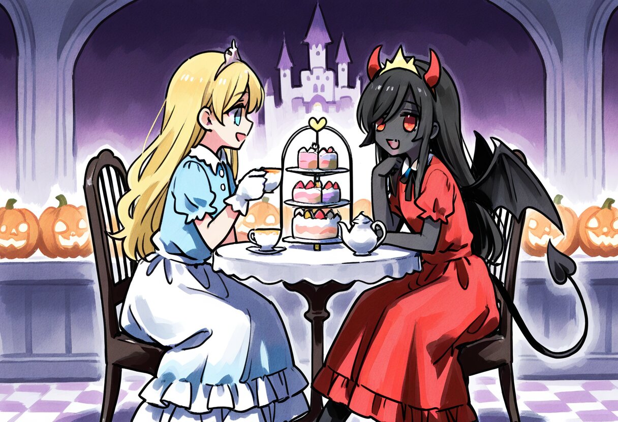 <lora:inmnstyleilxl:0.9>best quality, masterpiece, very aesthetic, watercolor painting, general, 2girls, 10 years old, tea party, table, tea set, three-tiered cake stand, castle's great hall, halloween night, pumpkin BREAK best quality, masterpiece, very aesthetic, watercolor painting, general, 2girls, 10 years old, tea party, table, tea set, three-tiered cake stand, castle's great hall, halloween night, pumpkin, princess, blonde hair, long hair, blue eyes, smile, open mouth, white frilly dress, puffsleeves, sitting on decorative chair, heart-shaped tiara, white gloves, holding tea cup BREAK best quality, masterpiece, very aesthetic, watercolor painting, general, 2girls, 10 years old, tea party, table, tea set, three-tiered cake stand, castle's great hall, halloween night, pumpkin, black skin, black hair, wavy long hair, red eyes, sitting on decorative chair, frilly black dress, devil horns, devil wings, devil tail, fang, smile, open mouth, heart-shaped tiara BREAK