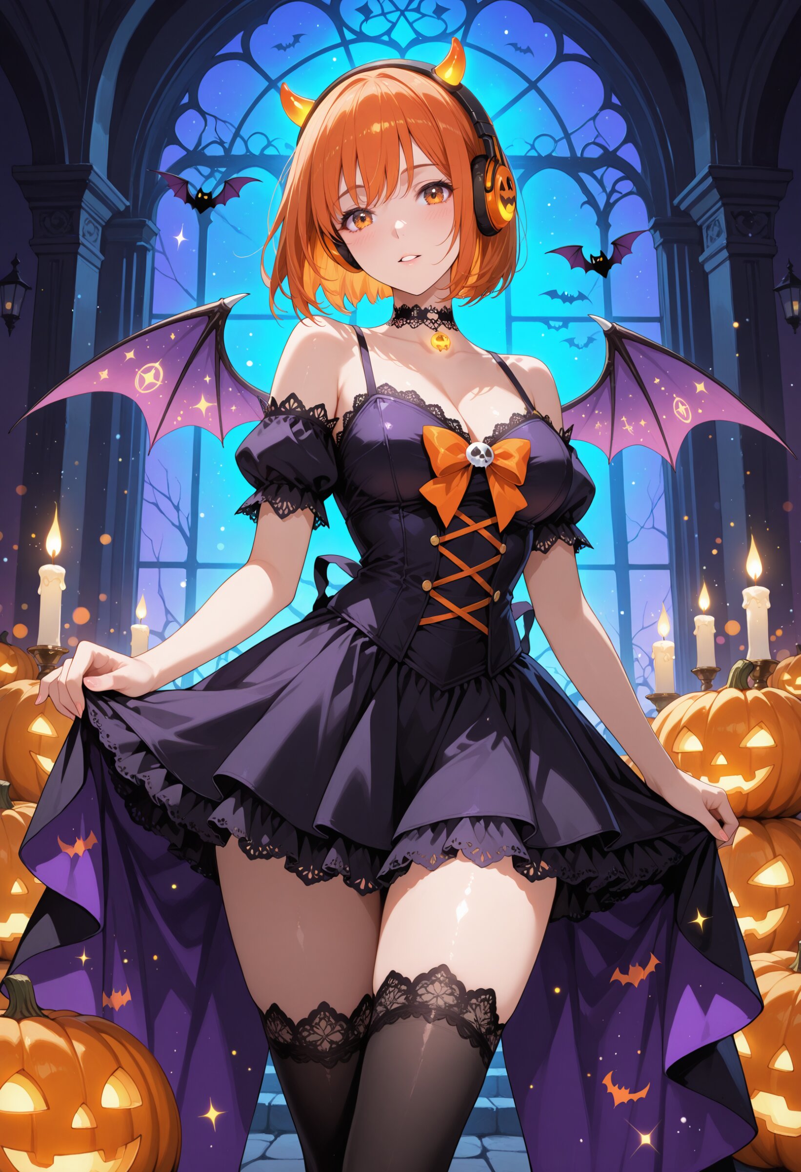 Full-body portrait of Zena, a beautiful Japanese idol student with vivid orange bob hair that glows softly like candlelight, wearing her signature orange headphones decorated with tiny bat wings and glowing runes. She stands at the Halloween festival of her magic academy, dressed in a pop-cute “Nightmare” cosplay outfit that mixes magical fantasy and idol style. Her costume is a short frilled dress in black, purple, and orange, with delicate spiderweb lace, tiny pumpkin charms, and ribbon bat wings fluttering gently behind her. The shoulders of the dress have subtle slits revealing glowing skin, while her mini-skirt swirls with translucent layers that shimmer like moonlight. A small pumpkin choker glows faintly at her neck, and her eyes sparkle like starlit amber. She’s surrounded by floating magical symbols and glowing Halloween motifs—tiny ghosts, candy bats, and flickering pumpkins that orbit around her like a dream. The air glows with magical aurora colors, purple and orange light dancing across the night sky. Behind her, the magic academy courtyard transforms into a Nightmare Wonderland, filled with glowing jack-o’-lantern lanterns, ghostly ribbons of light, and enchanted candy decorations. Despite the dark theme, her expression is warm and radiant—a little mischievous, a little dreamy, full of emotion. Her orange hair sways under the soft moonlight, while the metallic parts of her costume gleam with fine, realistic detail. The atmosphere feels like a sweet dream on the edge of a nightmare—beautiful, delicate, and gently haunting. Rendered in ultra-detailed anime-style, high resolution (8K), cinematic lighting, magical realism, soft glowing light particles, bokeh background, intricate costume textures, highly detailed face, enchanting expression, vivid color harmony of orange, purple, black, and silver.