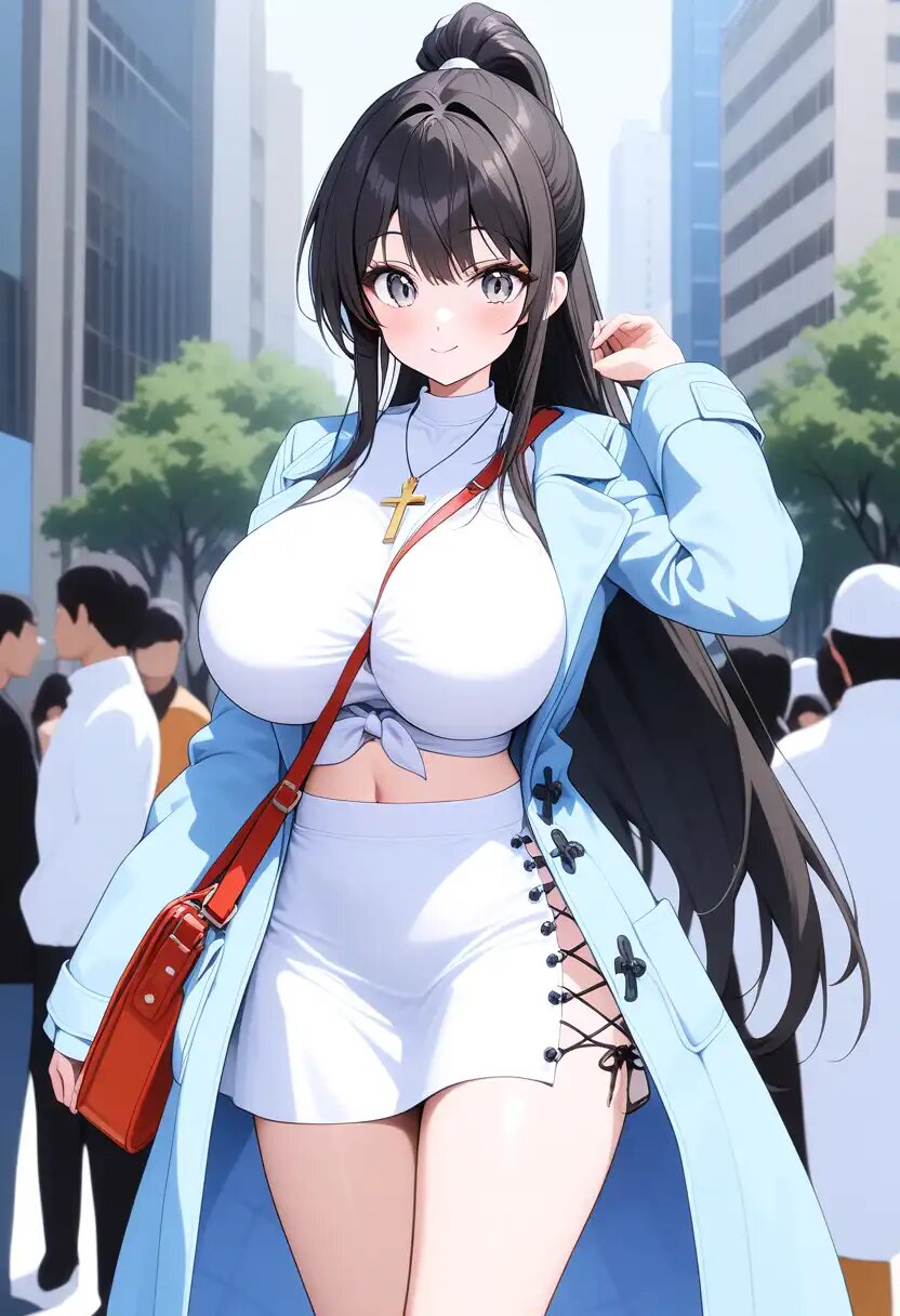 [Shoulder bag strap between breasts]++, open coat, [beautiful girl]++, [huge breasts]++, perky breasts, hanging breasts, curvy, clothes, cross necklace, long sleeves, midriff, cross-laced skirt, bare legs, cowboy shot, [Upright]++, standing, legs together, [Beautiful skin]++, tall, [long hair]++, shiny, shiny skin, [big eyes]++, [shining eyes]++, [Beautiful legs]++, [beautiful face]++, smile, blush, closed mouth, city, outdoors, day, skyscraper, sun, crowd, high ponytail,