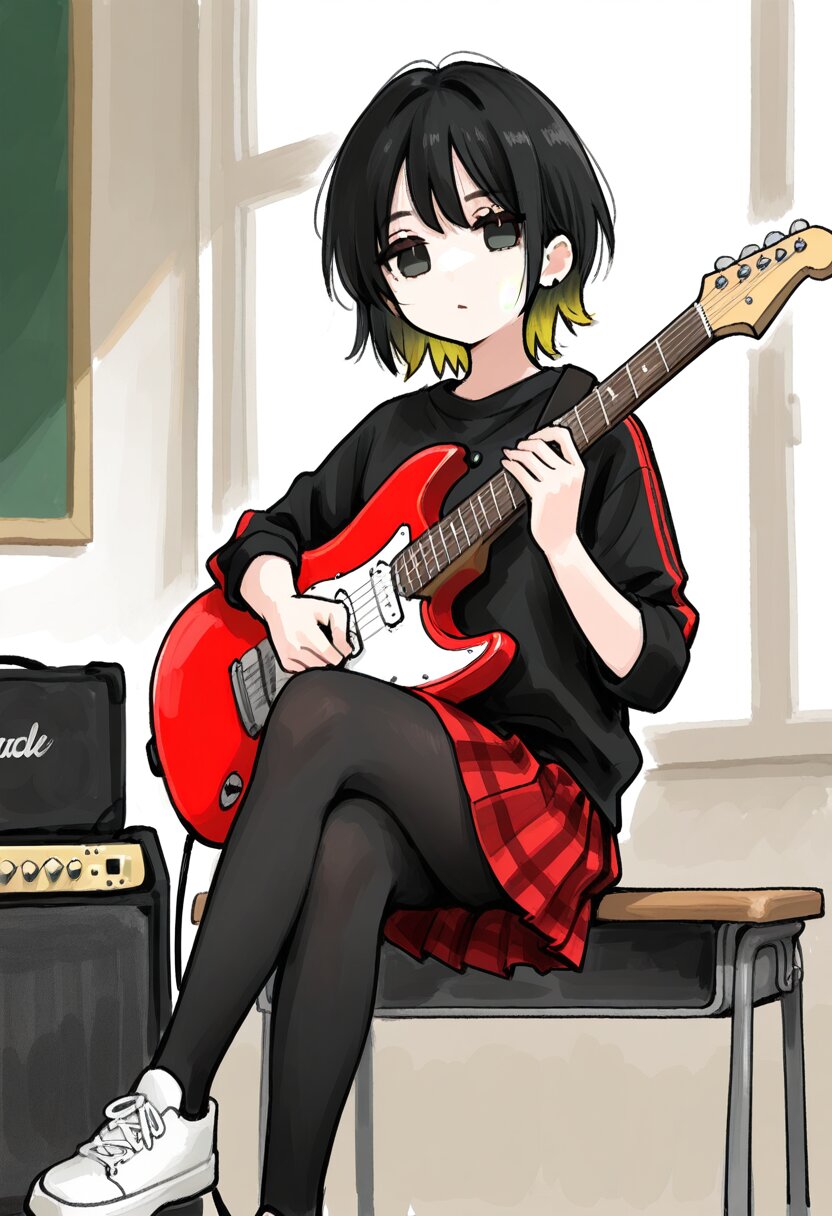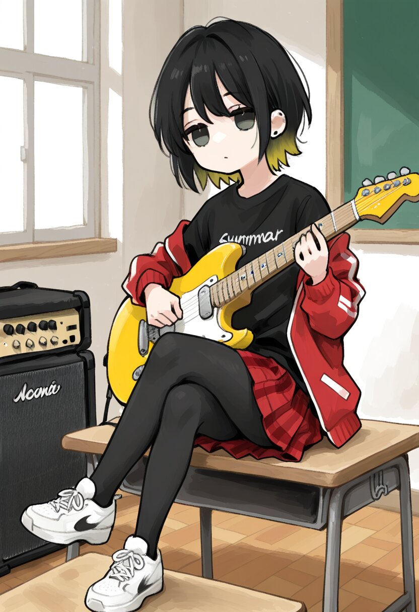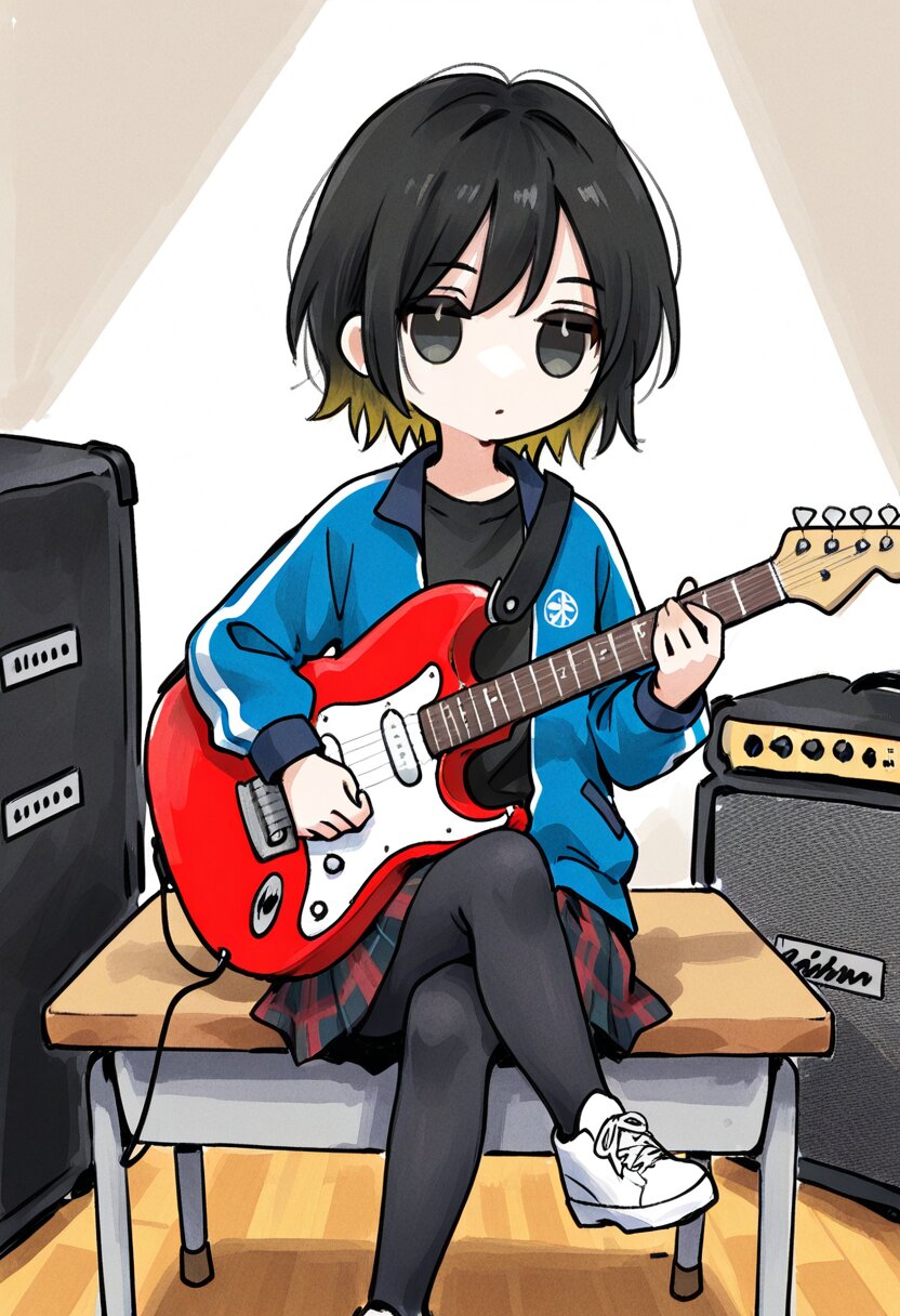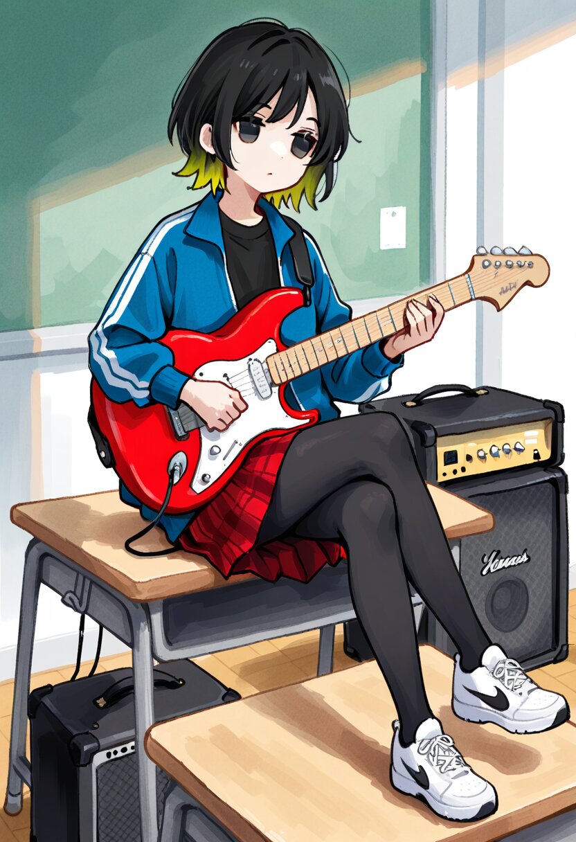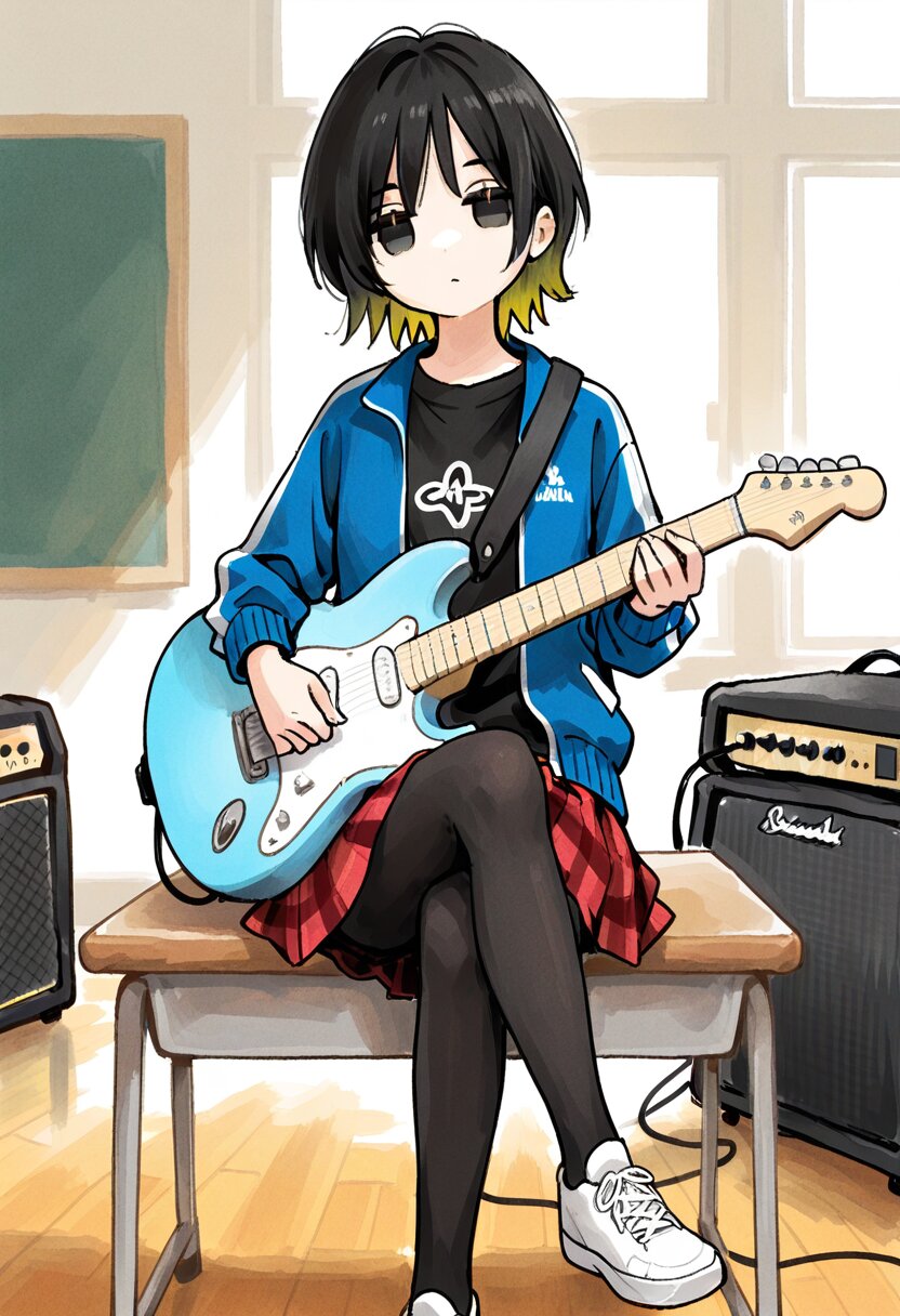<lora:inmnstyleilxl:0.9>best quality, masterpiece, very aesthetic, general, watercolor painting, 1girl, chibi, solo, short hair, black hair, yellowgreen colored tips hair, black eyes, plinted black t-shirt, loose blue track suit, red and black plaid pleats skirt, black tights, white sneaker, holding white electric guitar, amplifier, sitting on desk, crossed leg, classroom