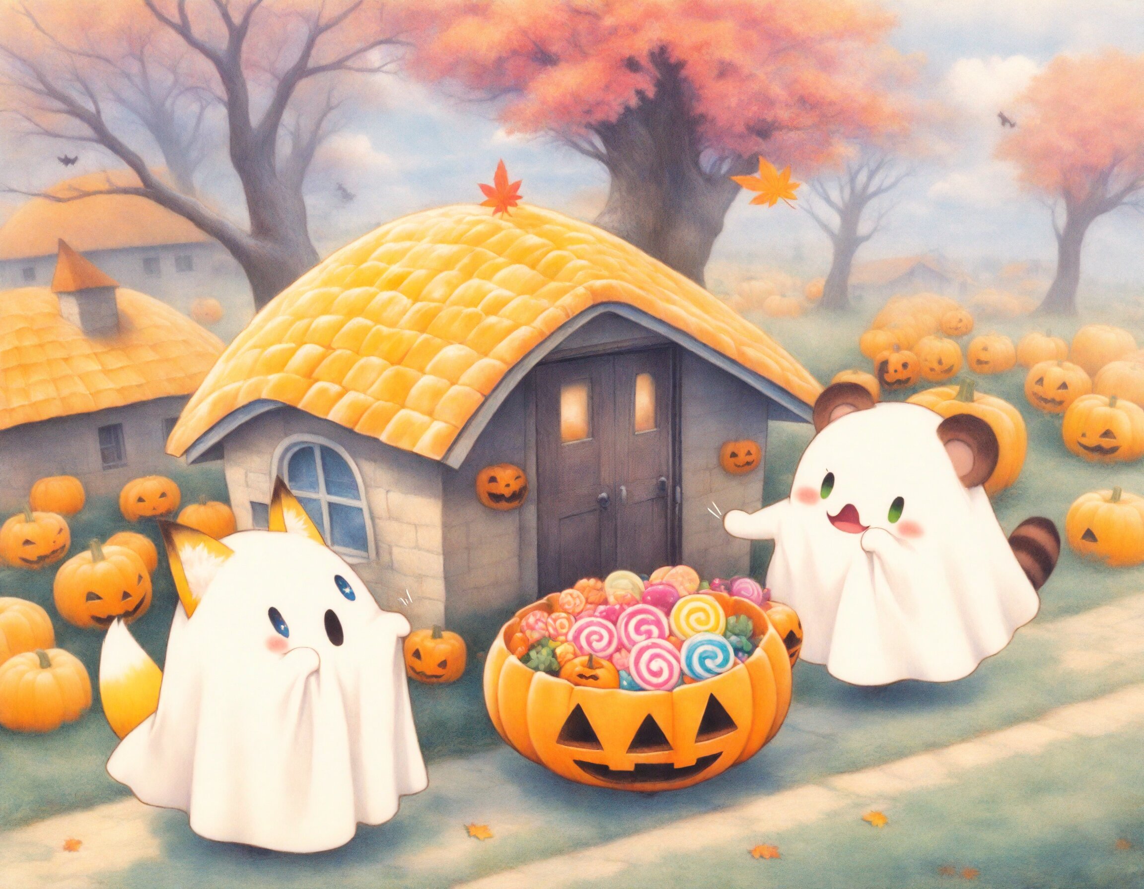 2girls, loli, chibi, mid, general, traditional media, picturebook-style, (colored pencil drawing), pastel colors, soft tone, no lineart, no outline, (drawing lines, Paper texture), cute, deformed, ultra-detailed background, Very detailed and textured costumes, (barasui:0.1), (oyari ashito:0.1), (masterpiece, best quality), dynamic angle, dynamic composition, dynamic pose, , from above , (cowboy shot:1.2), halloween, trick or treat, ghost costume, white sheet costume, wearing white sheets, Country village, house entrance, front door, halloween decorations, jack-o-lanterns, pumpkins, orange and purple decorations, bat decorations, spider web decorations, autumn trees, colorful leaves, paved road, blue sky, white clouds, sunlight, bright daylight, suburban houses, flowers, cheerful atmosphere, both expecting candy, innocent, pure, countryside girls, first halloween, kemonomimi, animal ears visible, animal tails visible, cute, heartwarming, comedy, slice of life, masterpiece, best quality, highly detailed, beautiful detailed eyes, detailed background, halloween theme, autumn atmosphere BREAK 2girls, loli, light brown hair, medium hair, choppy bangs, blue eyes, (light brown fox ears, Light brown fox tail with white tip, petite), sparkling eyes, excited expression, shy smile, nervous smile, gentle expression, fox ears poking through sheet, striped tail visible under sheet, white sheet ghost costume, sheet with eye holes, holding candy bag, standing pose, timid, BREAK 2girls, loli, dark brown hair, short hair, messy hair, short bangs, green eyes, tareme, (dark brown raccoon ears, dark brown raccoon tail with striped pattern), happy smile, open mouth, cheerful, raccoon ears poking through sheet, tail visible under sheet, white sheet ghost costume, sheet with eye holes, handmade costume, barefoot, holding candy basket, jumping pose, energetic, arms outstretched,