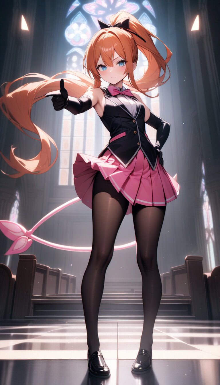 best quality,absurdres,8k,ultra detailed,very aesthetic, haneoka meimi, long hair, blue eyes, very long hair, hair ribbon, ponytail, orange hair, high ponytail, saint tail, 1girl, elbow gloves, skirt, pantyhose, bow, ribbon, bare shoulders, pleated skirt, sleeveless, black gloves, bowtie, black pantyhose, magical girl, pink skirt, church, full body, finger gun, hand on hip, masterpiece, ultra detailed,