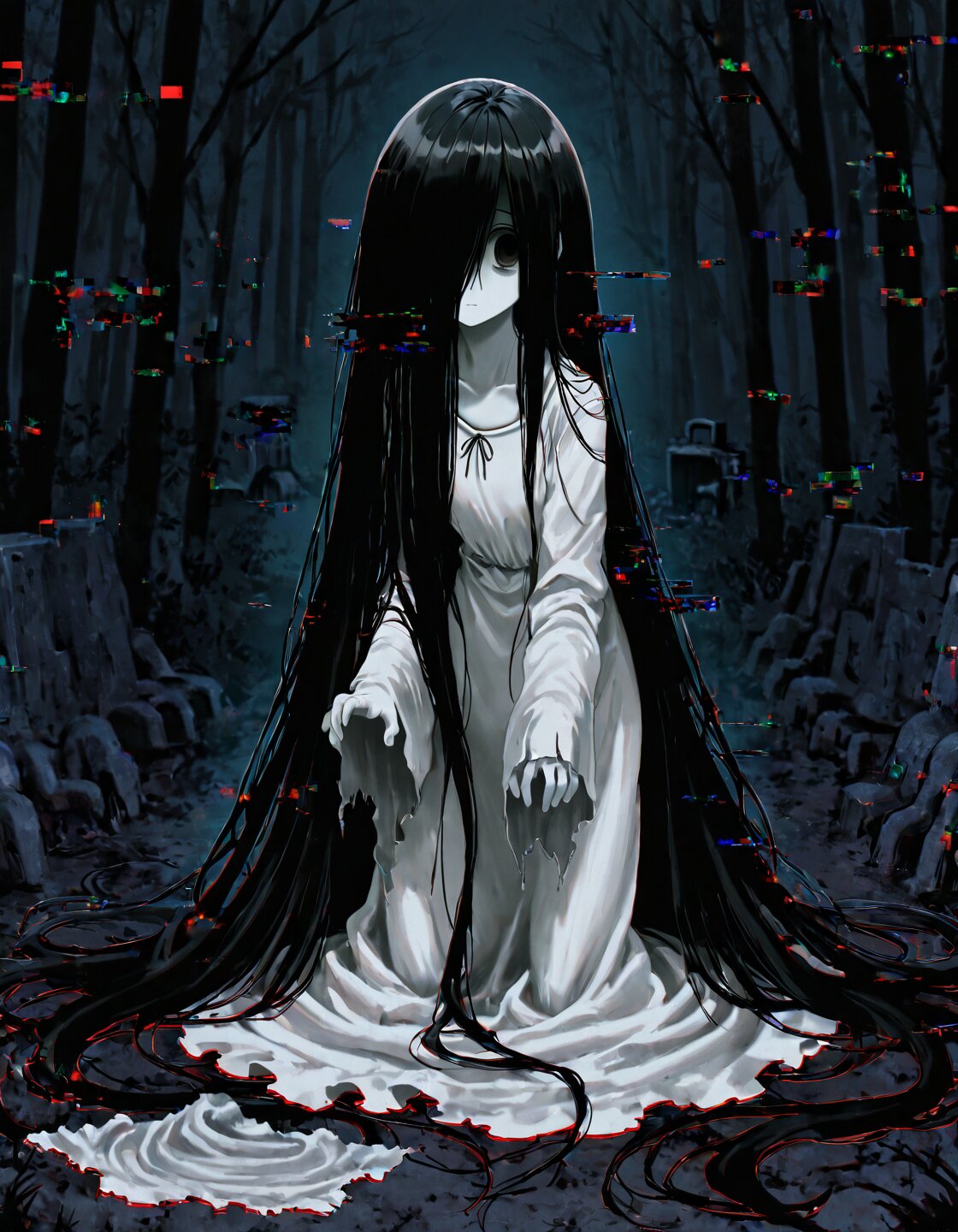 long hair,straight hair,blonde,forehead,center parted bangs,hair ornament,(very long black hair:1.5),Expressionless,(white dress:1.5),(messy cloth:1.3),downturned eye,reaching,horror,realistic,old stone well,in the dark,night forest,Enveloped in Shadows,Nocturnal Silence,Eerie Nightfall,Glimmers of Darkness,Shrouded in Mystery,Inky Blackness,Shadowed Whispers,best quality,masterpiece,exquisite,beautiful,8K,fear,sad,expressionless,absurdly long hair,irisless eyes,upturned eyes,pale skin,scrawny,japanese,outside,at midnight,mysterious atmosphere,in a dark and gloomy world,traumacore,darkness,cold lighting,(glitch-noise:1.8),(sadako:2.0),(hair over one eye:1.5)