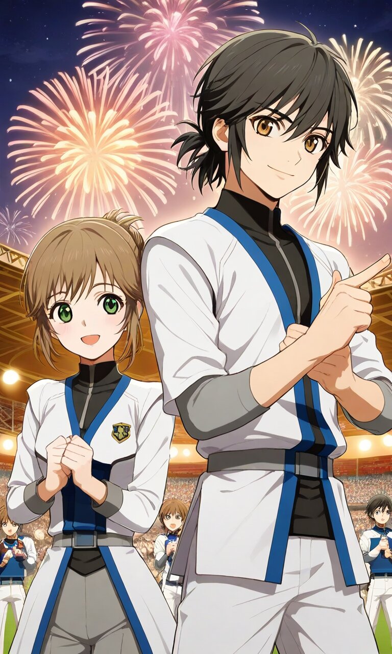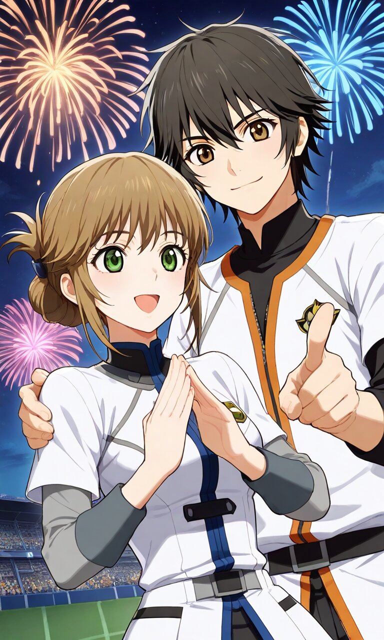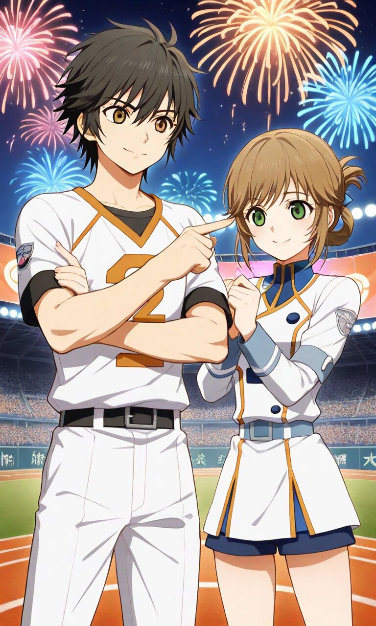 Couple, boy and girl, two people only,absurdres, ultra-detailed, master piece, high resolution, 8k, Boy, girl, couple,masterpiece, best quality, extremely detailed, baseball player man rounding third base, joyful smile, white Fighters uniform glowing under stadium lights, lover woman in stands pointing excitedly with both hands, Esko Field crowd erupting, fireworks beginning in sky, night game celebration, perfect anatomy BREAK the boy(Jude Matisse, black hair,brown eyes,) BREAK the girl(leiax2, brown hair, green eyes, tied hair, sidelocks, short hair, )
