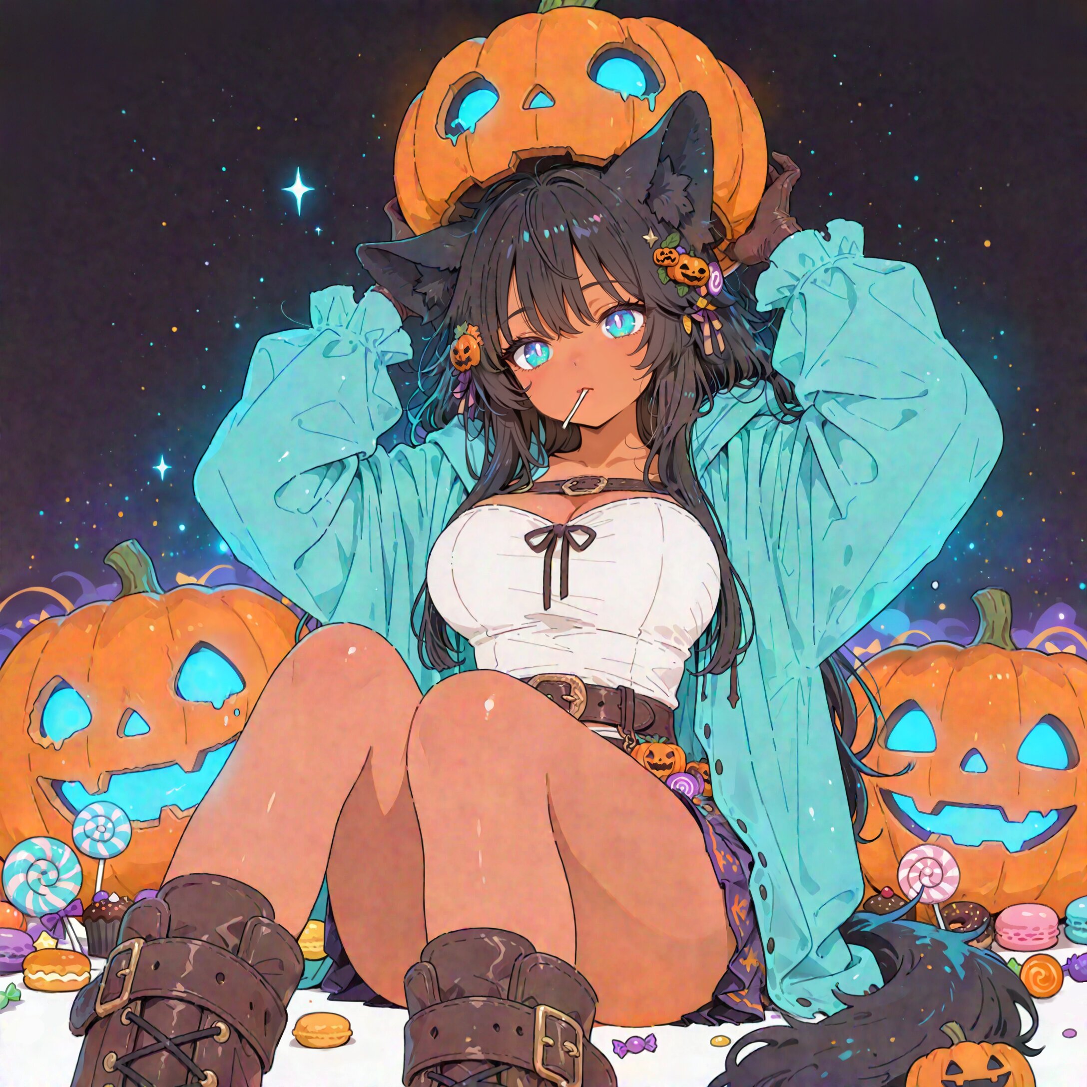 foreshortening, (portrait:1.2) , 1girl, black wolf ears, dark skin, young beautiful girl, large breasts, tall, wolf tail, (aristocratic features), (Black Hair:1.2) (disheveled long hair over ears:1.3) messy hair ornament flower, (perfect turquoise eyes:1.3) long eyelashes,, wearing turquoise hood down and white tube top leather gloves, lether miniskirt, belt boots, turquoise hoodie, arms up sitting , simple halloween background, halloween bucket medieval fantasy world, halloween, orange and black theme, jack-o'-lantern, halloween costume, pumpkin, ghost costume, lollipop, chocolate, wrapped candy, swirl lollipop, cupcake, donut , sweets, happy halloween , macaron, super fine concept art, hard surface, 8K, unreal engine, newest masterpiece, best quality, amazing quality, very aesthetic, absurdres professional art lots of details, , overexposure, shiny-glistening, (watercolor style:1.0), (pastel color style:0.5) 4ur4_illu,shiny, glowing, glowing particles, glowing light particles, light particles, , <lora:noline (1):-0.5> <lora:sdxl2-flat2-512b:0.0> <lora:facelightup_xl_v10:0.5> <lora:V2_yakumo_alchemy:0.5> <lora:Aura_illu:0.1>
