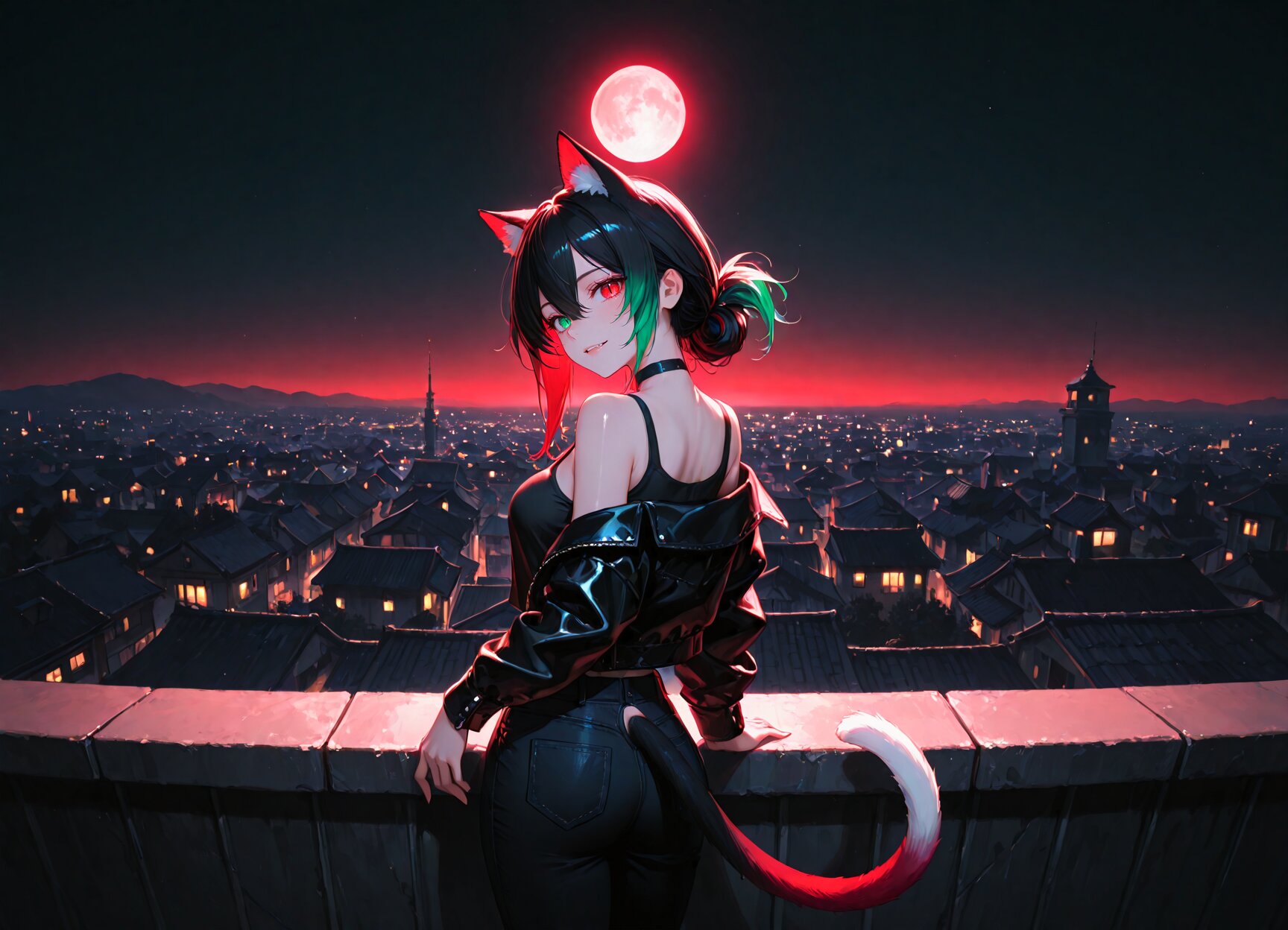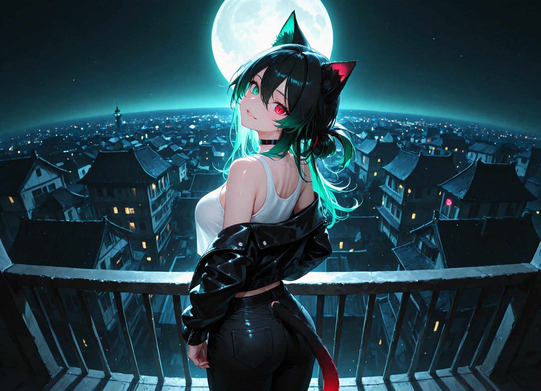 rooftop of a building,at night,darkness,full moon,neon light, 1girl,solo,standing,from behind,cowboy shot,looking back,head tilt,looking at viewer,light smile,parted lips, ((magnificent panorama view)),horizon,360� view,wide shot, BREAK 1 girl,20-year-old,hair between eyes,long hair tied back,multicolored hair|black hair|white gradient hair,white dip-dye hair,body,medium breasts,heterochromia,green left eye,red right eyes,slit pupils,narrow eyes,cool-face,fang,fair skin,shiny skin,shiny hair,cat ears,(black cat tail, multicolored tail, white gradient tail),choker,tank-top shirt,leather jacket,black pants,black jacket,long sleeves,open jacket,black denim pants, BREAK, appropriate posture,appropriate configuration,ideal ratio body proportions,perfect anatomy, <lora:Fixhands_anime_bdsqlsz_V1:1>, masterpiece,best quality,newest,absurdres,highres,ultra high res,8K UHD,hyper-detailed,
