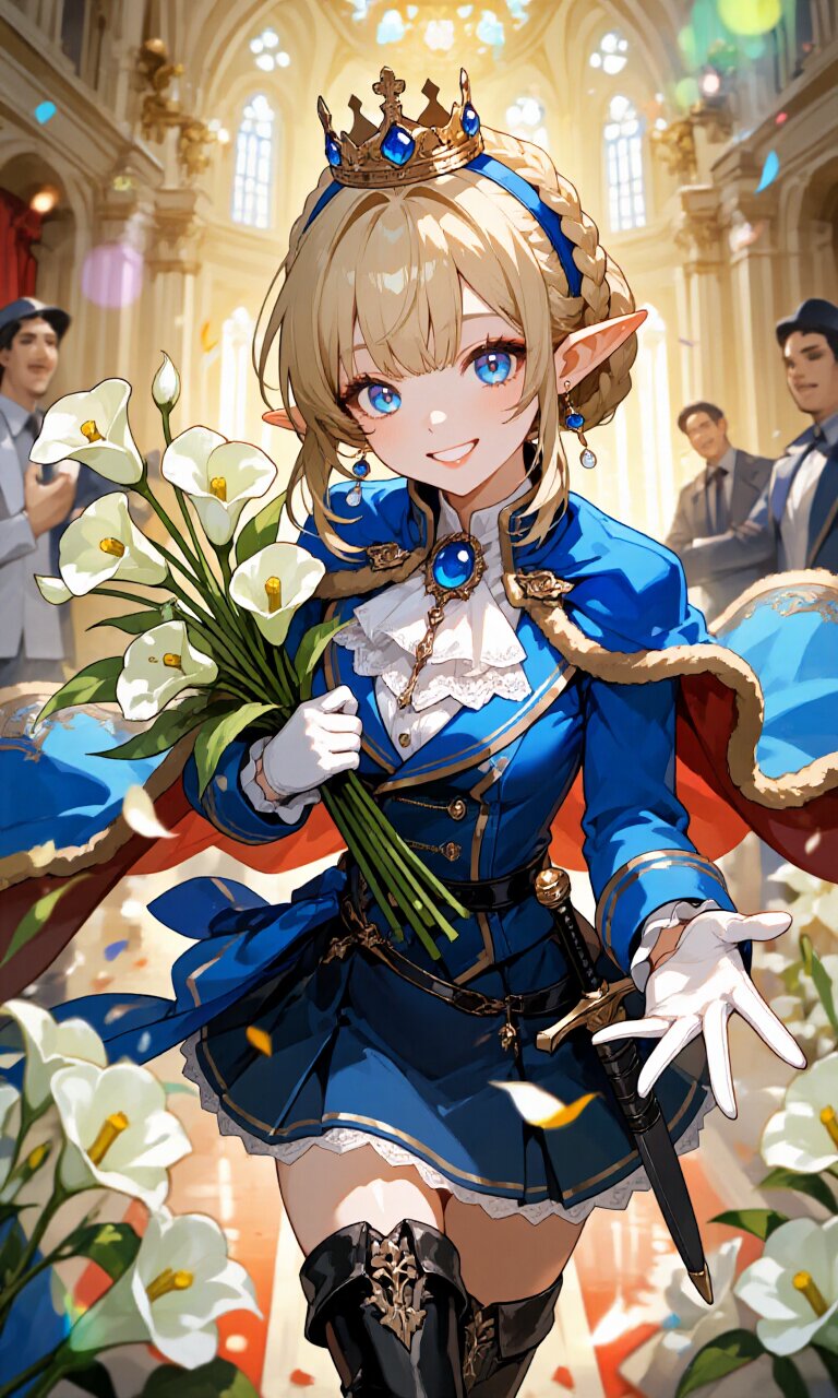 1girl, solo, an elf girl with (sparkling blue eyes:1.1) and (deep blonde hair:1.3) styled in an intricate french braid, adorned with a (thick Vermeer-blue hairband:1.3) and (with pearl earrings:1.3). Her face is exquisitely detailed, with ultra-detailed lips, a cute expression, and a grin smile. She wears a (Vermeer-blue Prince costume:1.5) with long sleeves, a white lace jabot fastened with a lapis lazuli brooch, and a (darkgoldenrod luxurious cape:1.3) draped over her shoulders. Her outfit includes a (luxurious mini skirt:1.3) and (darkgoldenrod luxurious boots:1.3), with a (dagger on waist:1.3) and a (crown:1.3) atop her head. She also wears (white gloves:1.2) and holds a (Calla lily bouquet in hand:1.5). The scene is set in a grand Palace ballroom with baroque architecture, (surrounded by friends:1.8), celebrating a birthday with a light and dreamy atmosphere. The room is filled with lots of flowers, lens flare, and bloom effects, creating a romantic academia ambiance. The image is a masterpiece with insanely detailed skin, hair, and clothes, rendered in 16k quality.