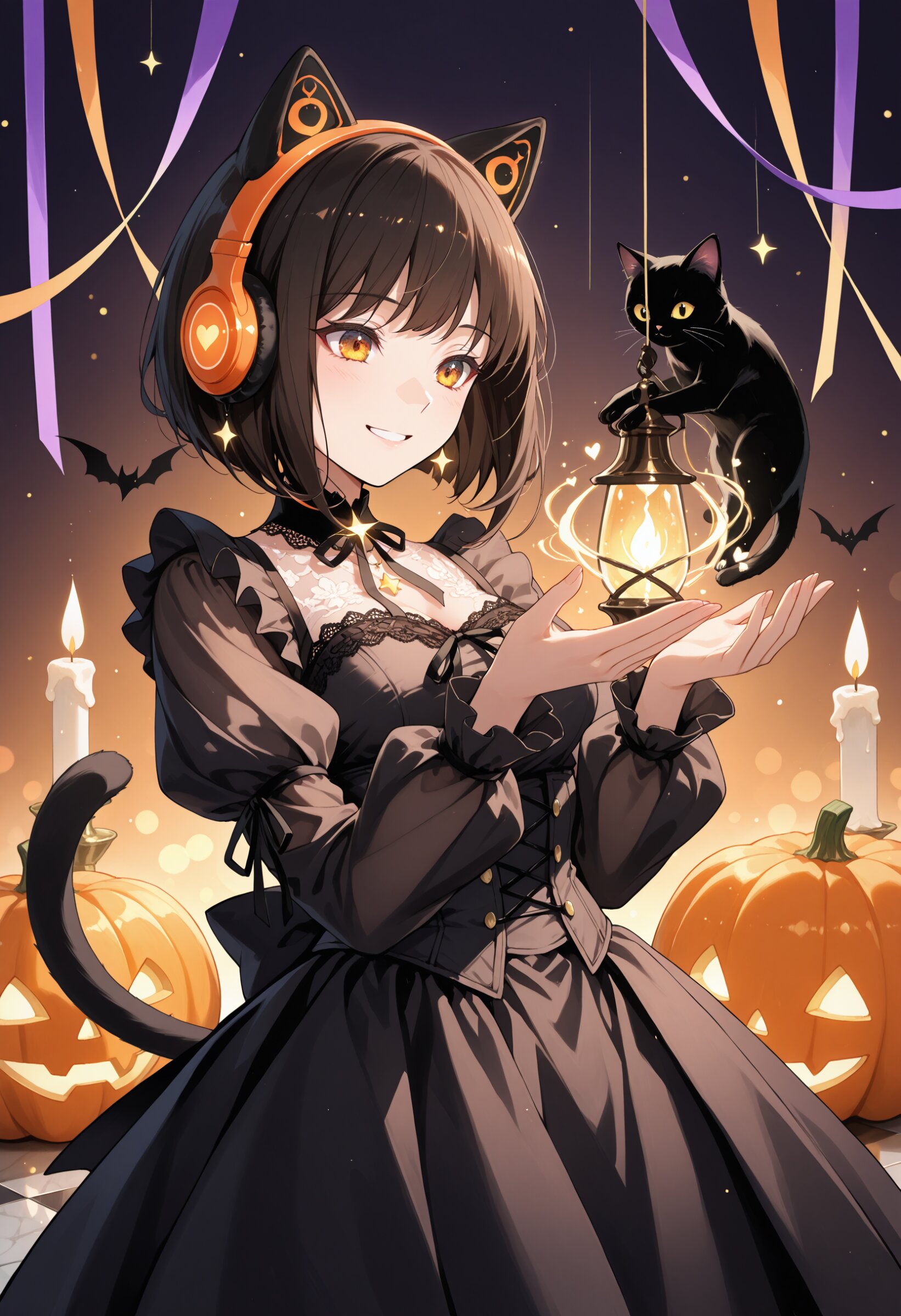 Zena, a Japanese idol with a soft orange bob haircut and futuristic orange headphones, attends the Magic Academy Halloween Festival dressed as a charming black cat. Her outfit is girly and elegant — a frilled black dress layered with lace and ribbons, a corset-style bodice with delicate embroidery, and puffed sleeves that shimmer under candlelight. A silky black tail and lace-trimmed cat ears complete her enchanting look. Tiny moon and star charms glimmer in her hair as she moves gracefully through the festive hall. Beside her, a small black cat companion walks elegantly, its golden eyes glowing with a mysterious light, as if sharing Zena’s magical aura. The cat’s fur sparkles faintly, touched by the soft magic in the air. Together, they embody a perfect harmony of mystery and cuteness. The academy’s dining hall is decorated for the Halloween festival — glowing pumpkins carved with smiling and spooky faces, floating candles, pastel-colored cobwebs, bat-shaped streamers, and shimmering ribbons hanging from the ceiling. The atmosphere is both pop and slightly eerie, blending whimsy with a hint of haunted charm. Shadows dance playfully across the marble floor, while gentle magical lights swirl around, creating a surreal dreamlike glow. Zena stands in the center of the scene, smiling with a soft yet mischievous expression — a little devilish, yet filled with warmth and grace. Her amber eyes glimmer like starlight as she poses with one hand resting near her cheek, surrounded by fluttering magic particles shaped like tiny cats and hearts. Captured by a professional photographer in cinematic style — ultra-detailed 8K high-resolution, perfect focus, natural light with soft diffusion, delicate depth of field, warm glowing tones, and a gentle bokeh background. The texture of lace, frills, and hair strands is vividly detailed. The image expresses a blend of beauty, innocence, and fantasy — the essence of a magical girl who dances between light and shadow.