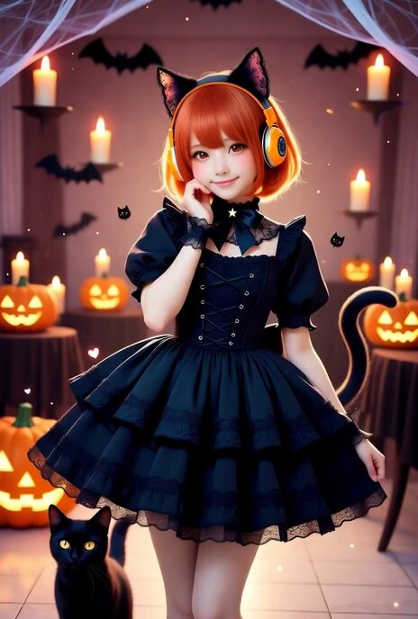 Zena, a Japanese idol with a soft orange bob haircut and futuristic orange headphones, attends the Magic Academy Halloween Festival dressed as a charming black cat. Her outfit is girly and elegant — a frilled black dress layered with lace and ribbons, a corset-style bodice with delicate embroidery, and puffed sleeves that shimmer under candlelight. A silky black tail and lace-trimmed cat ears complete her enchanting look. Tiny moon and star charms glimmer in her hair as she moves gracefully through the festive hall. Beside her, a small black cat companion walks elegantly, its golden eyes glowing with a mysterious light, as if sharing Zena’s magical aura. The cat’s fur sparkles faintly, touched by the soft magic in the air. Together, they embody a perfect harmony of mystery and cuteness. The academy’s dining hall is decorated for the Halloween festival — glowing pumpkins carved with smiling and spooky faces, floating candles, pastel-colored cobwebs, bat-shaped streamers, and shimmering ribbons hanging from the ceiling. The atmosphere is both pop and slightly eerie, blending whimsy with a hint of haunted charm. Shadows dance playfully across the marble floor, while gentle magical lights swirl around, creating a surreal dreamlike glow. Zena stands in the center of the scene, smiling with a soft yet mischievous expression — a little devilish, yet filled with warmth and grace. Her amber eyes glimmer like starlight as she poses with one hand resting near her cheek, surrounded by fluttering magic particles shaped like tiny cats and hearts. Captured by a professional photographer in cinematic style — ultra-detailed 8K high-resolution, perfect focus, natural light with soft diffusion, delicate depth of field, warm glowing tones, and a gentle bokeh background. The texture of lace, frills, and hair strands is vividly detailed. The image expresses a blend of beauty, innocence, and fantasy — the essence of a magical girl who dances between light and shadow.