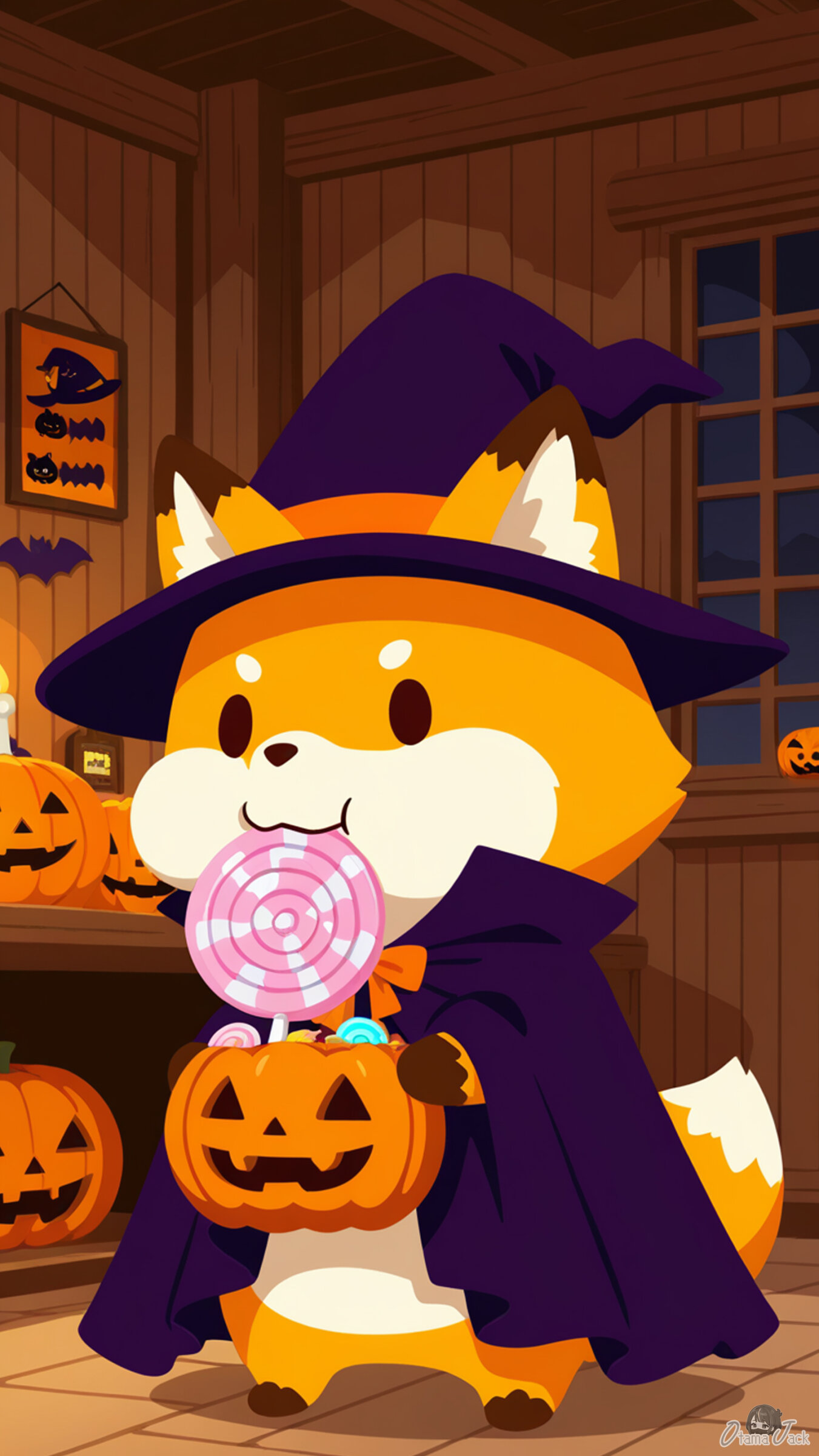 chibi, 1 furry, solo ,(fox:1.1), (no human:1.6),huge Lollipop, food, puffy-cheeks, puffy cheeks, eating, no lineart,no outline, Halloween, Jack-o'-lantern, witch hat, cloak, Halloween party, room, fantasy bar,