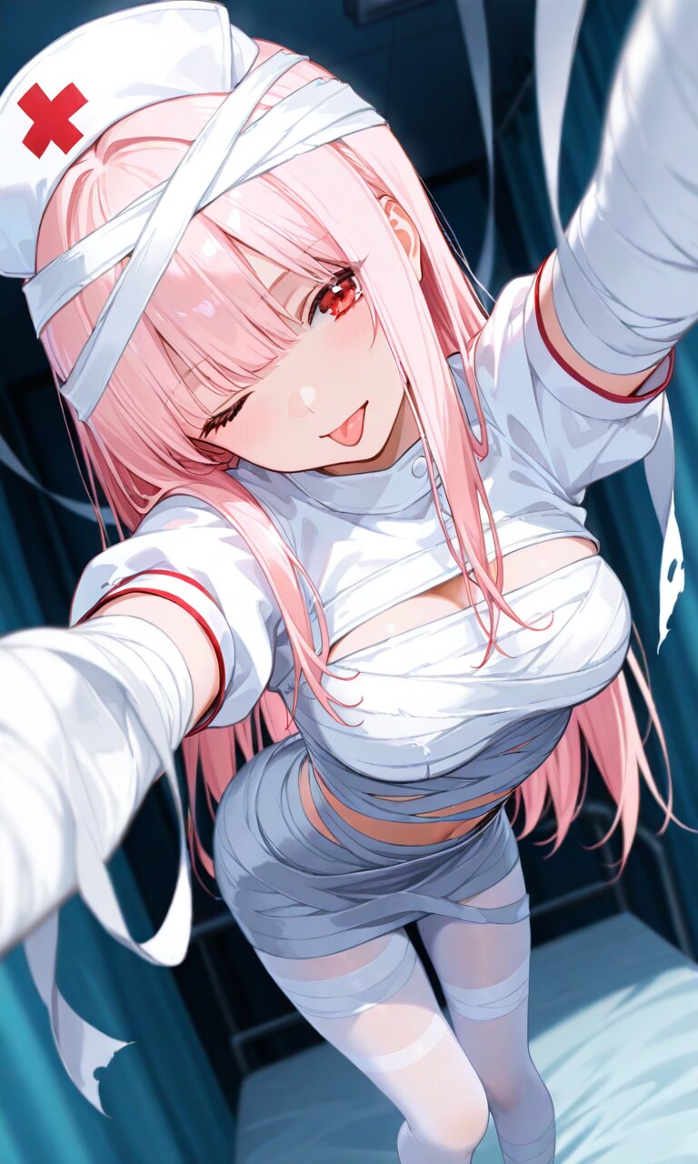 one character,depth of field,looking viewer,dynamic angle,detailed eyes,nurse,mummy costume,white tights,light pink hair,straight hair,long hair,red eyes,tongue out,one eye closed,posing