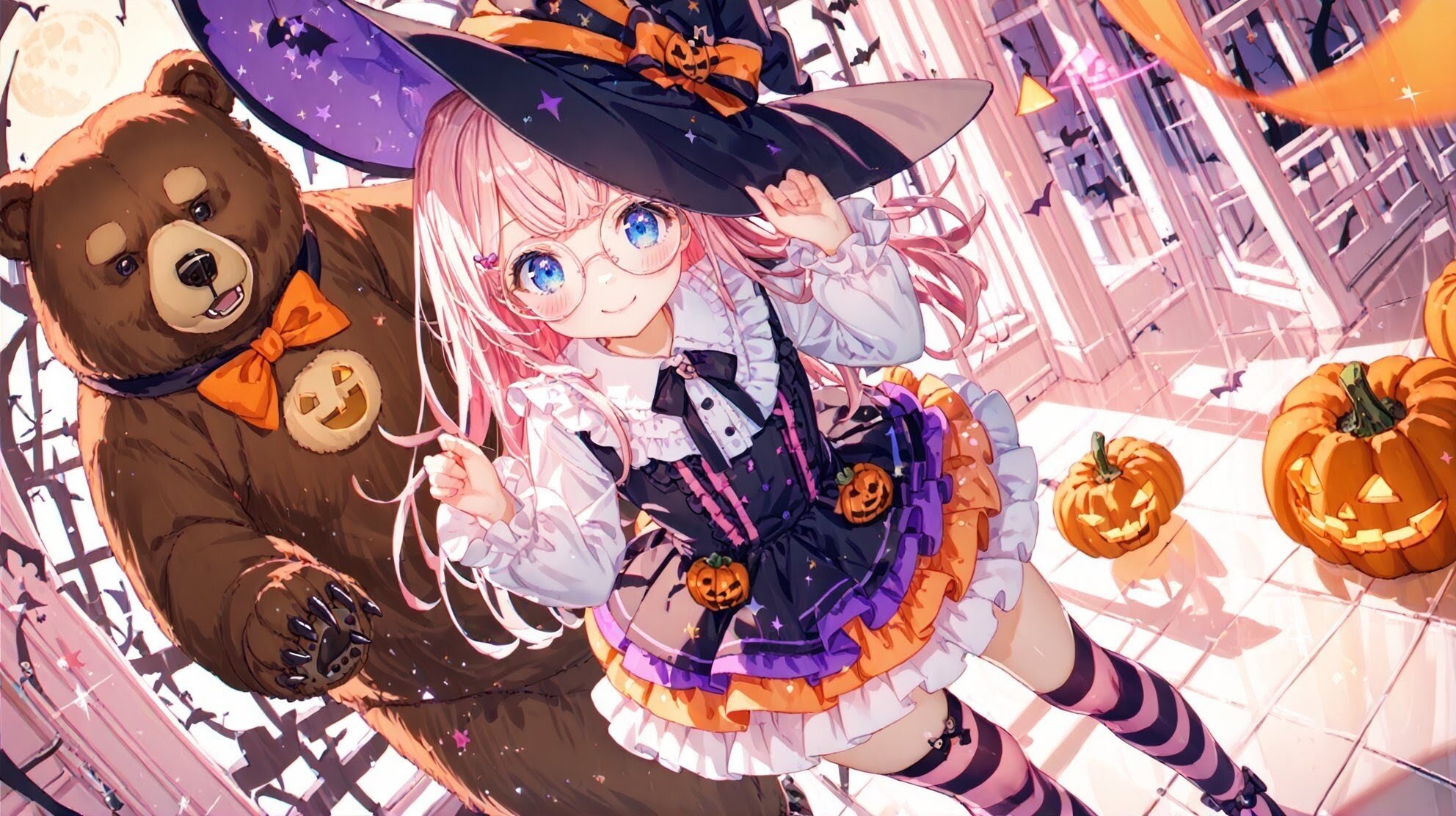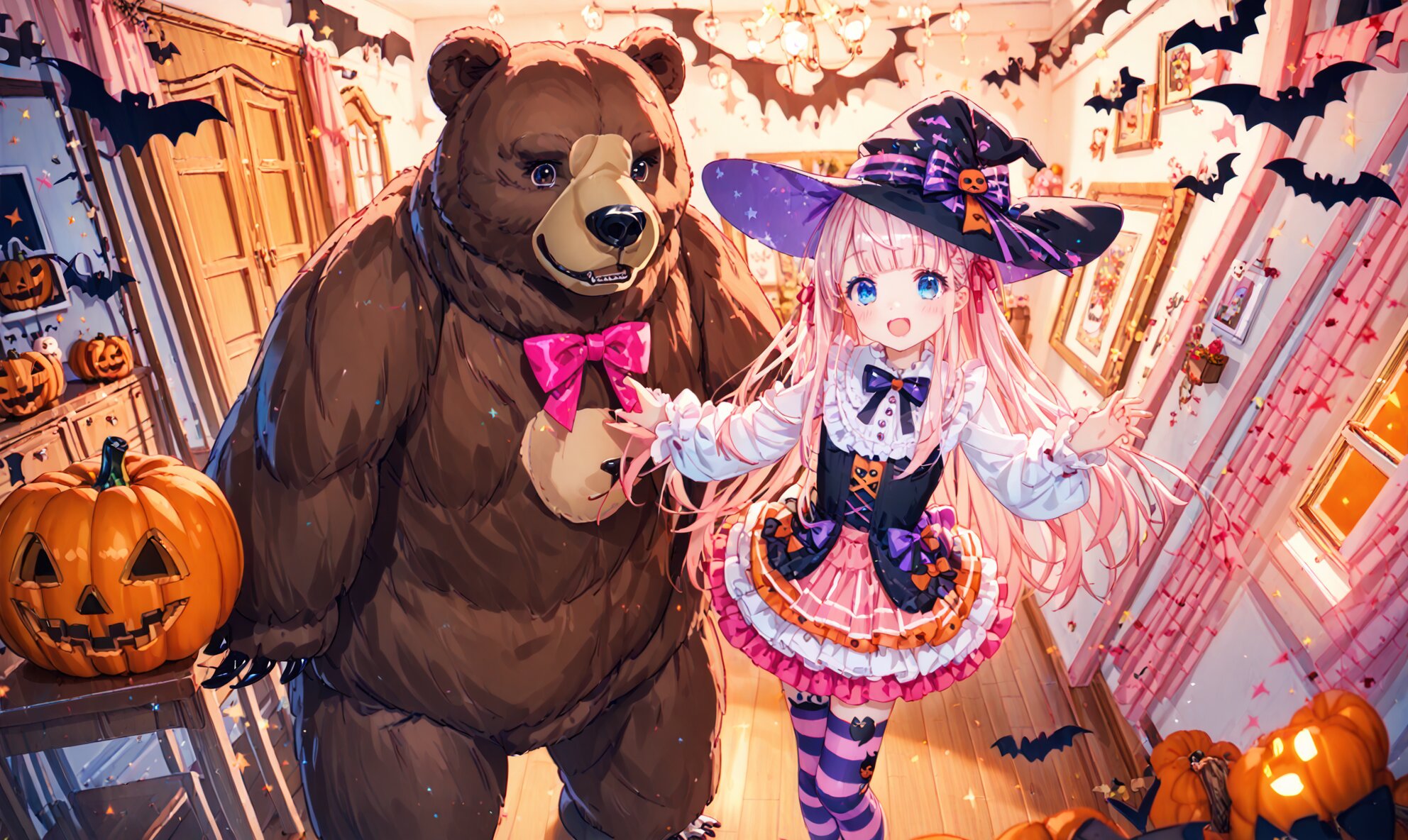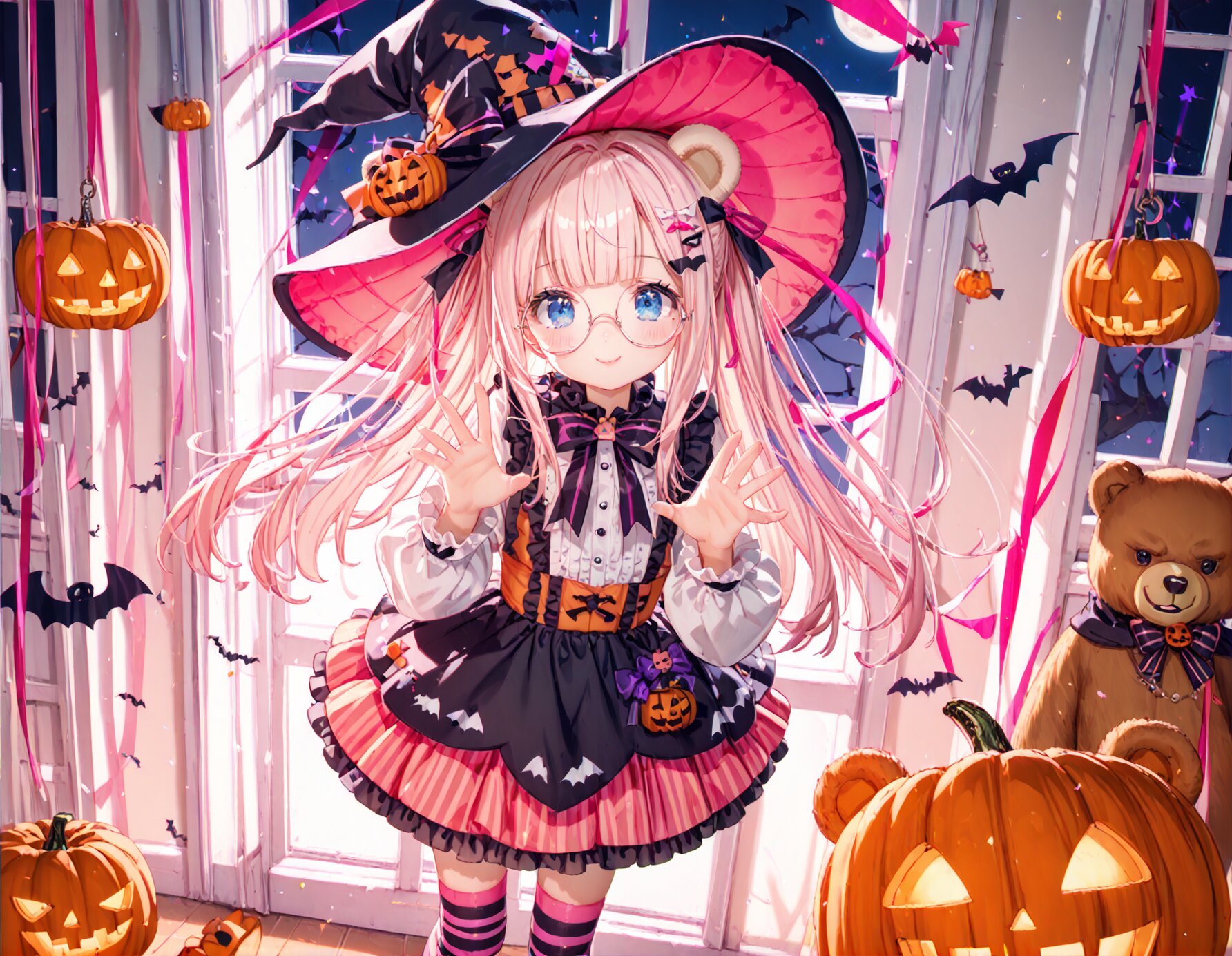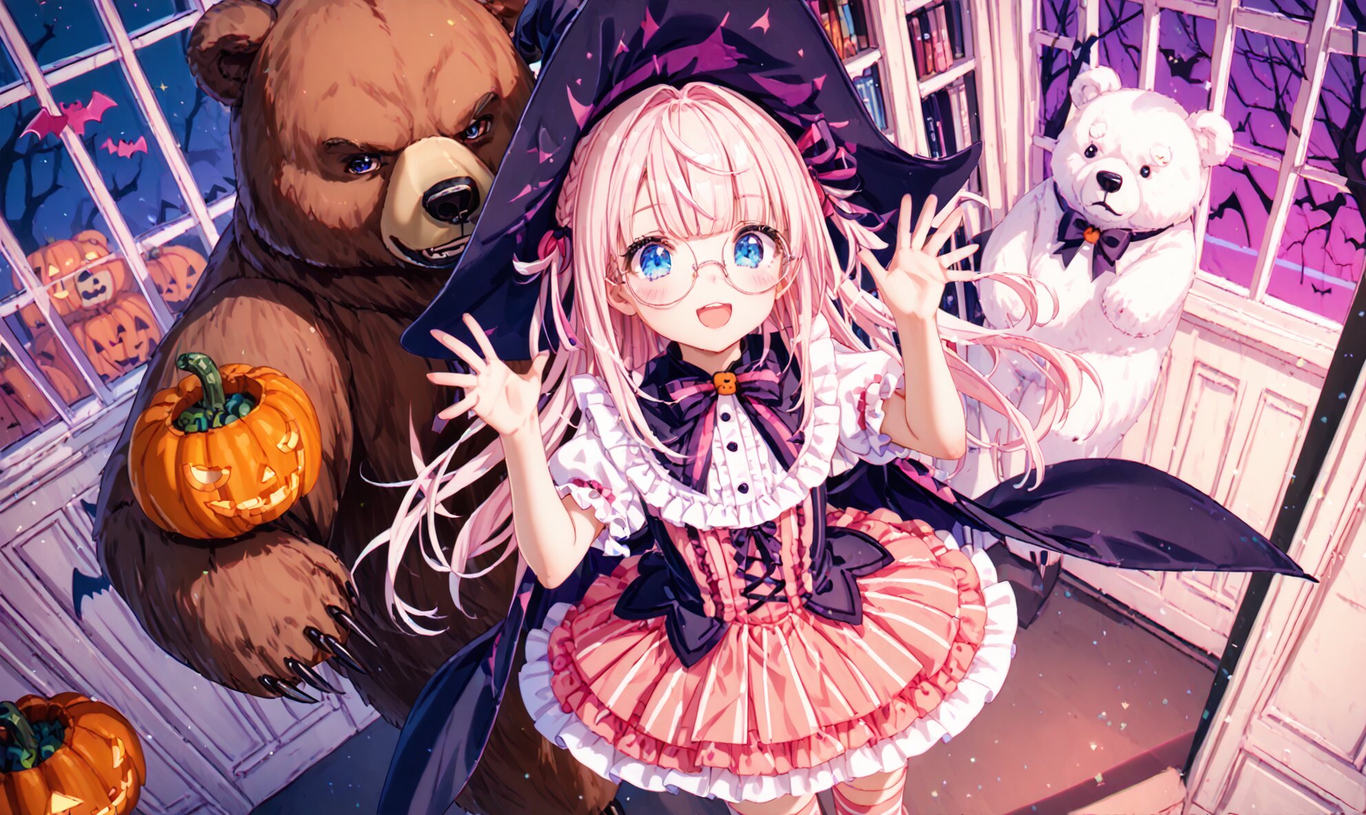 a cute girl and a big bear, score_9, score_8_up, score_7_up, score_6_up, score_5_up, score_4_up, rating_safe, masterpiece, best quality, high quality, highres:1.0, ultra detailed, incredibly absurdres:1.0, textuer:1.0, source_anime:1.0, resized, vivid colors, perfect composition, (perfect anatomy:1.3), five fingers, beautiful detailed skin, extremely detailed clothes, detailed prism eye, (Halloween Theme:1.3), (dynamic angle:1.2), cowboy shot, (a big bear:2), Short white eyebrows, maromayu, standing near the girl, a cute loli girl, detailed face, (shinny light pink hair:1.2), cute girly hairstyle, blue eyes, Glossy pink Lips, hair ribbon, big round glasses, witch hat, witch costume, witch girl, (orange and pink theme:1.2), lolita fashion, frilly dress, mini skirt, (frilly shirt:1.2), (pink colored culottes skirt:1.2), (orange and pink striped thighhighs:1), (zettai ryouiki:1), high heels, (The hem of her short skirt, and the top of the socks fits snugly around her thighs). cute smile, blush, look at viewer, hands up, Jack-o'-lanterns, flying bats, (night time), moon lighting, (indoor:1.2), (in the Decorated classroom:1.2), <lora:flat_sdxl:-1> <lora:Fixhands_anime_bdsqlsz_V1:1>