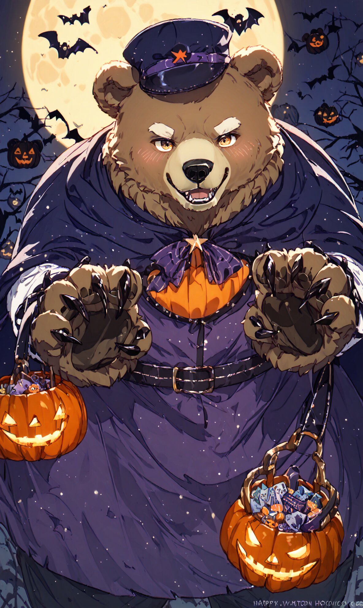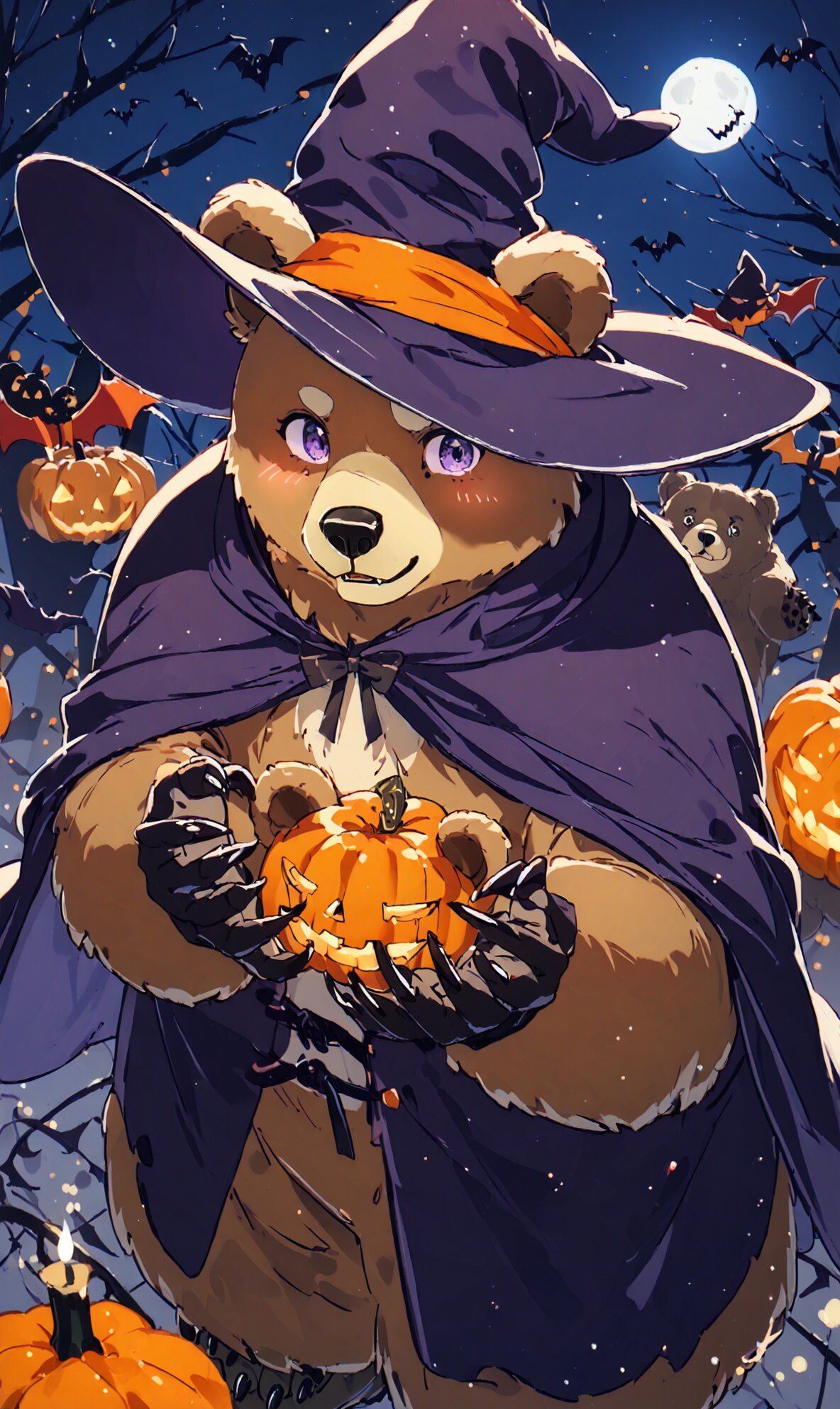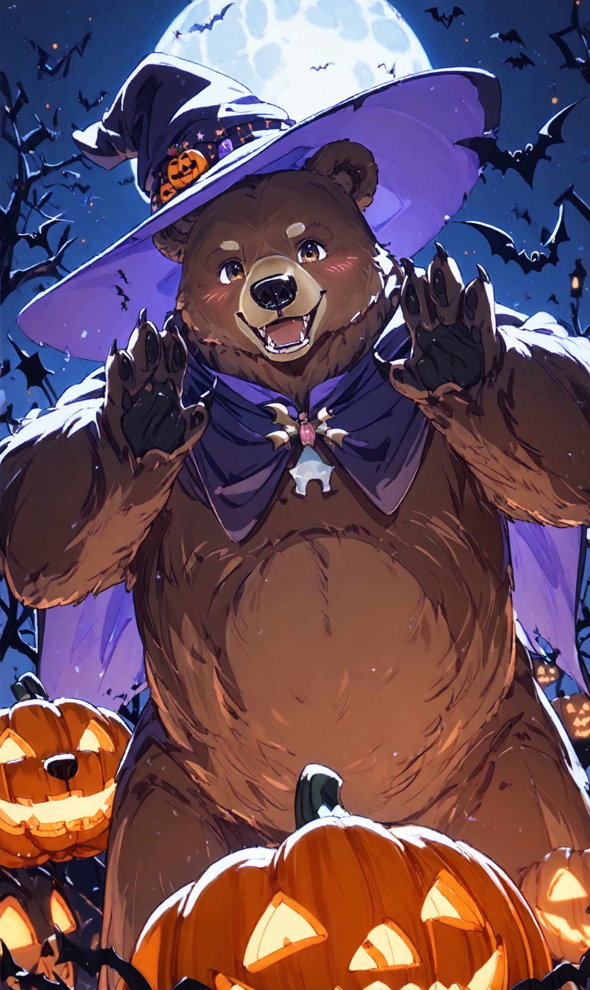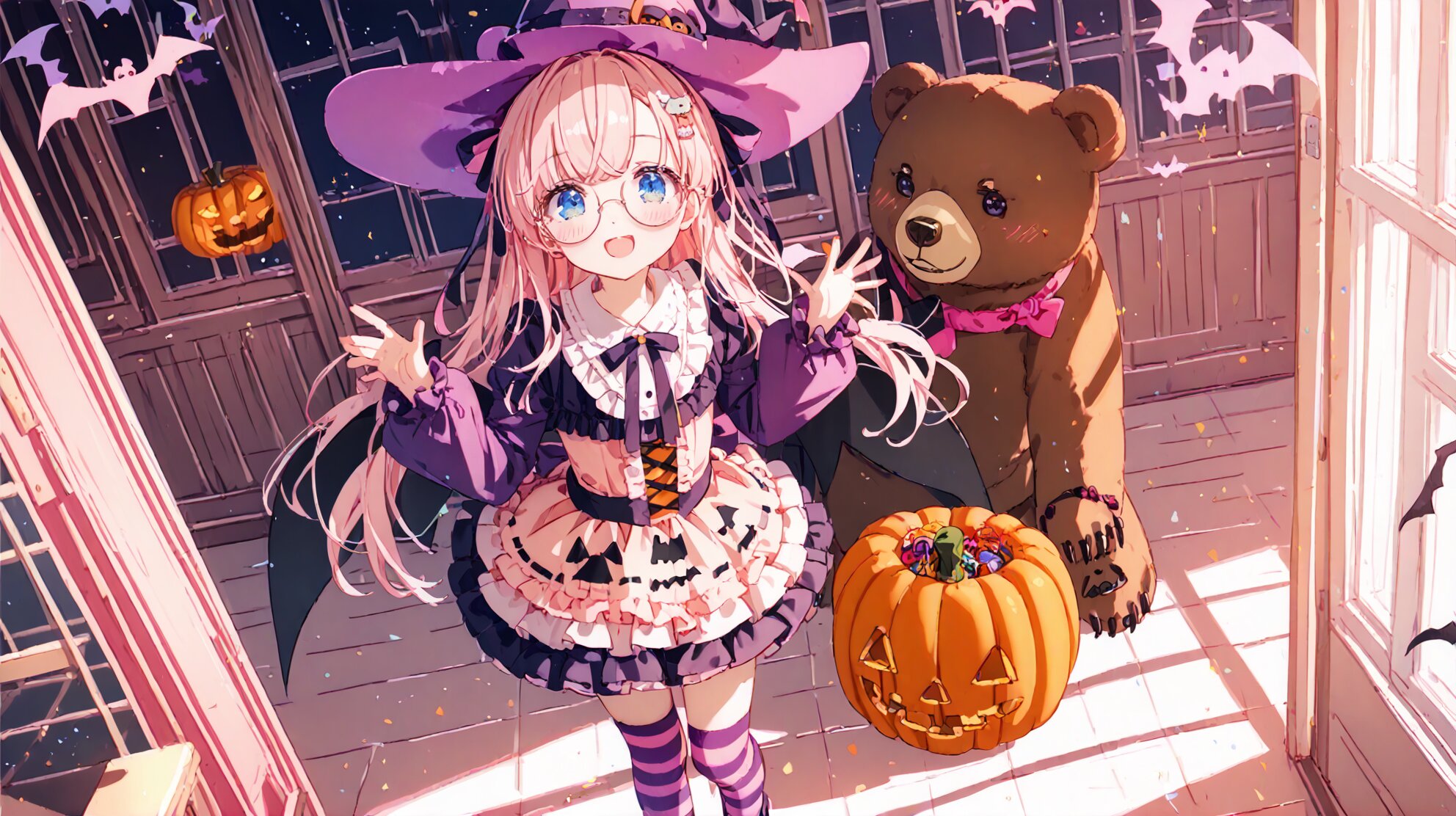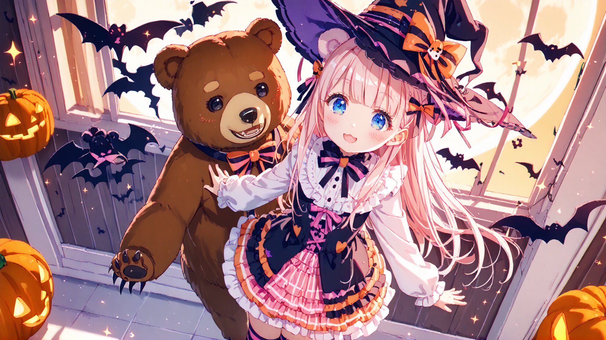 a cute girl and a big bear, score_9, score_8_up, score_7_up, score_6_up, score_5_up, score_4_up, rating_safe, masterpiece, best quality, high quality, highres:1.0, ultra detailed, incredibly absurdres:1.0, textuer:1.0, source_anime:1.0, resized, vivid colors, perfect composition, (perfect anatomy:1.3), five fingers, beautiful detailed skin, extremely detailed clothes, detailed prism eye, (Halloween Theme:1.3), (dynamic angle:1.2), cowboy shot, (a big bear:2), Short white eyebrows, maromayu, standing near the girl, a cute loli girl, detailed face, (shinny light pink hair:1.2), cute girly hairstyle, blue eyes, Glossy pink Lips, hair ribbon, big round glasses, witch hat, witch costume, witch girl, (orange and pink theme:1.2), lolita fashion, frilly dress, mini skirt, (frilly shirt:1.2), (pink colored culottes skirt:1.2), (orange and pink striped thighhighs:1), (zettai ryouiki:1), high heels, (The hem of her short skirt, and the top of the socks fits snugly around her thighs). cute smile, blush, look at viewer, hands up, Jack-o'-lanterns, flying bats, (night time), moon lighting, (indoor:1.2), (in the Decorated classroom:1.2), <lora:flat_sdxl:-1> <lora:Fixhands_anime_bdsqlsz_V1:1>
