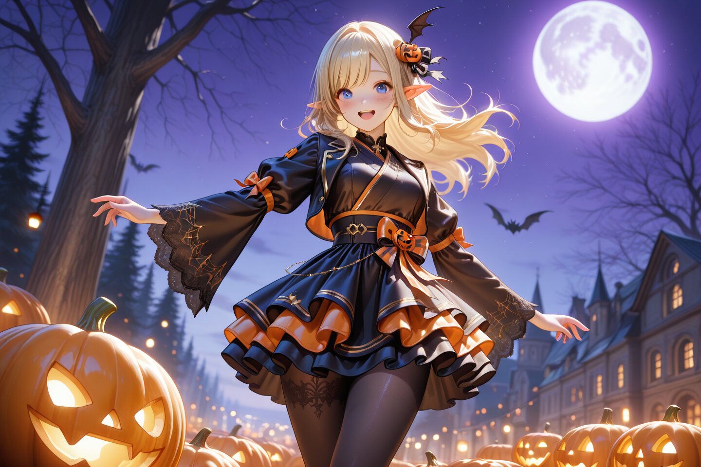 (official illustration, soft lighting, idol outfit, stage style, solo, standing pose), cheerful expression, modern idol costume with Halloween decorations, short skirt, fitted jacket, pumpkin motifs, candy ornaments, spiderweb lace, ribbon belt like obi, inspired Japanese kimono. Halloween pattern black pantyhose, idol short boots, slightly flared sleeves, stylish silhouette, balance of western and japanese elements, black, orange, purple, and gold color scheme, glossy satin fabric, sheer organza overlay, jack-o'-lantern hair accessory, high detail in costume texture print clothing, Halloween print, glowing print, theme is Halloween night. background is downtown area in Halloween decoration. (On a midnight, fullmoon, the girl singing and big step dancing, gaze at viewer with an Embarrassed, open mouth happy smile face), outdoors, 1girl, solo, moon, dynamic composition, dynamic angle, cowboy shot, ultra detailed lips, ultra detailed face and hair, beautiful eyes, kawaii, adorable, cute, elf girl, (apatite eyes with CGI Effect), (deep blonde hair:1.2), medium breasts, wide hip, volumetric lighting,,, <lora:elf-san_alpha1(AnimagineV31):0.7> <lora:Elf-san_alpha7(IL2.0):0.7>, anime style, anime color,, masterpiece, amazing quality, very aesthetic, high resolution, ultra-detailed, absolute, newest, 2d, semi-realistic, moe heroine, sharp focus,