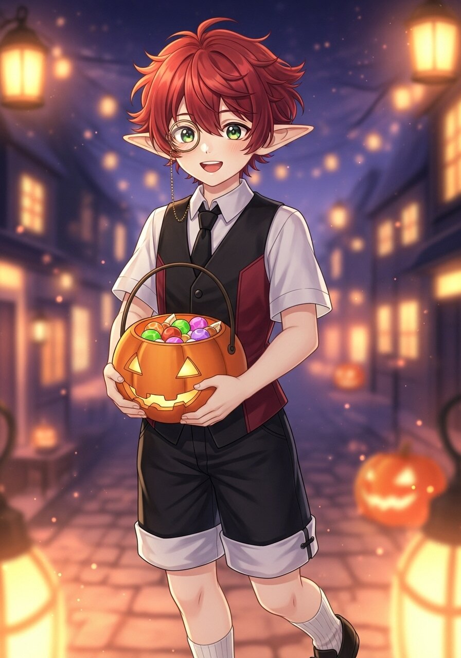 A young, elf-eared boy with fluffy, vibrant red hair styled similarly to Ragatha from “The Amazing Digital Circus.” His left eye is covered with a monocle. He has gentle green eyes and a bright, innocent smile. He wears a short-sleeved white shirt with a black necktie, and a fitted vest with a black front panel and dark red (maroon) side panels. He also wears black shorts with rolled cuffs revealing white lining, white socks, and black shoes. He holds a pumpkin-shaped candy bucket filled with colorful sweets with both hands, his expression full of pure joy and curiosity. The background depicts a softly glowing Halloween town illuminated by lanterns and gentle lights, filled with a warm orange and violet atmosphere. The scene feels magical, nostalgic, and slightly surreal. The art style is semi-realistic anime, with delicate lighting, smooth shading, and a serene, dreamlike ambience.