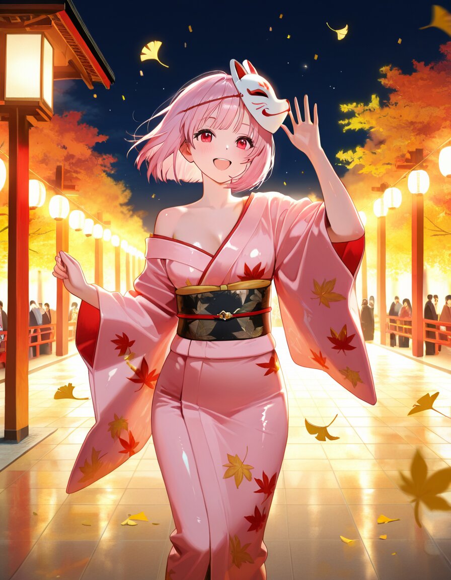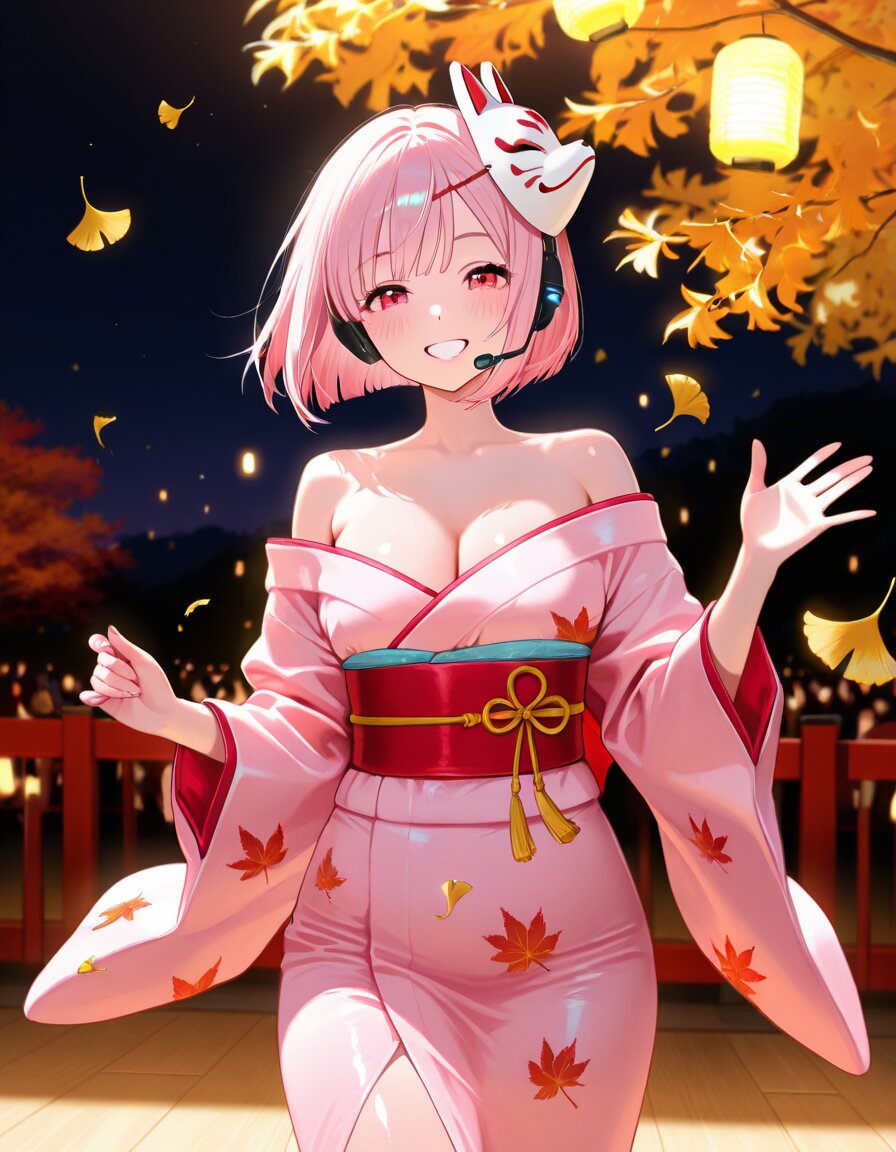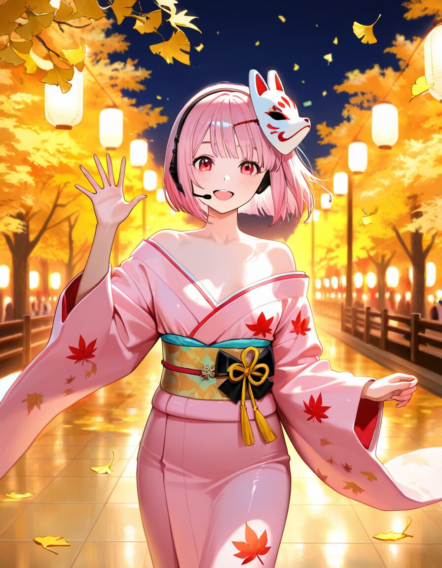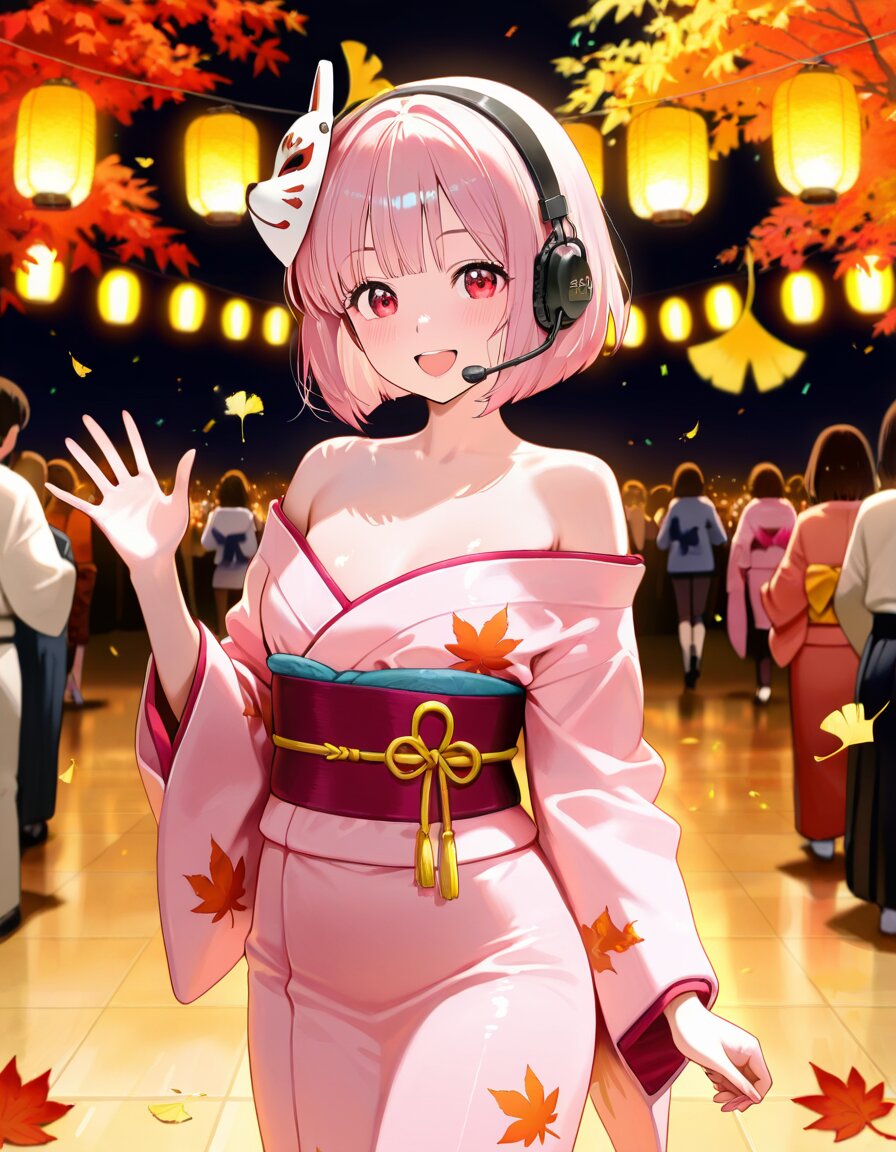 (1 cute girl:1.2),detailed face,bright cheerful smile,(light pink hair:1.3),(short bob hair:1.5),bangs,(deep red eyes:1.3),(A fox mask is attached to the side of her head:1.3),(cute pink kimono with autumn leaf patterns:1.4),(pattern of ginkgo, maple, and momiji leaves in soft pastel tones:1.4),(gold and cream accents:1.2),(off shoulder:1.5),wearing a microphone headset,standing on a brightly lit festival stage at night,waving her hand to the audience while singing joyfully,lively autumn festival atmosphere,glowing paper lanterns and colorful light decorations,warm lighting from stalls,wind blowing her hair and kimono playfully,fluttering ribbons,dynamic stage lighting,confetti floating in the air,cheering crowd silhouettes,poplar trees glowing in the background,falling autumn leaves,glossy reflections on the stage floor,cute and energetic vibe,cinematic composition,depth of field,(masterpiece:1.3),(best quality:1.3),(beautiful lighting:1.3),(motion feeling:1.3), (best quality,masterpiece:1.3),(8k,raw,photo realstic:1.36),shiny skin,finely,detailed face,japaneese idol