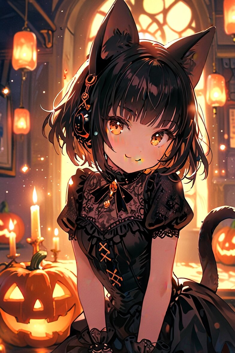 Zena, a Japanese idol with a soft orange bob haircut and futuristic orange headphones, attends the Magic Academy Halloween Festival dressed as a charming black cat. Her outfit is girly and elegant — a frilled black dress layered with lace and ribbons, a corset-style bodice with delicate embroidery, and puffed sleeves that shimmer under candlelight. A silky black tail and lace-trimmed cat ears complete her enchanting look. Tiny moon and star charms glimmer in her hair as she moves gracefully through the festive hall. Beside her, a small black cat companion walks elegantly, its golden eyes glowing with a mysterious light, as if sharing Zena’s magical aura. The cat’s fur sparkles faintly, touched by the soft magic in the air. Together, they embody a perfect harmony of mystery and cuteness. The academy’s dining hall is decorated for the Halloween festival — glowing pumpkins carved with smiling and spooky faces, floating candles, pastel-colored cobwebs, bat-shaped streamers, and shimmering ribbons hanging from the ceiling. The atmosphere is both pop and slightly eerie, blending whimsy with a hint of haunted charm. Shadows dance playfully across the marble floor, while gentle magical lights swirl around, creating a surreal dreamlike glow. Zena stands in the center of the scene, smiling with a soft yet mischievous expression — a little devilish, yet filled with warmth and grace. Her amber eyes glimmer like starlight as she poses with one hand resting near her cheek, surrounded by fluttering magic particles shaped like tiny cats and hearts. Captured by a professional photographer in cinematic style — ultra-detailed 8K high-resolution, perfect focus, natural light with soft diffusion, delicate depth of field, warm glowing tones, and a gentle bokeh background. The texture of lace, frills, and hair strands is vividly detailed. The image expresses a blend of beauty, innocence, and fantasy — the essence of a magical girl who dances between light and shadow.