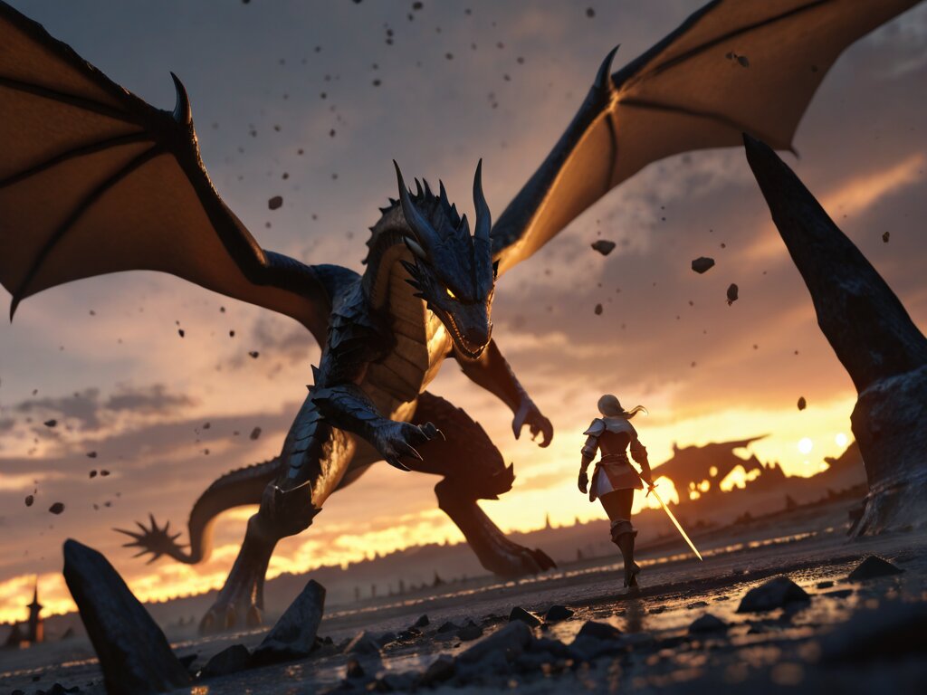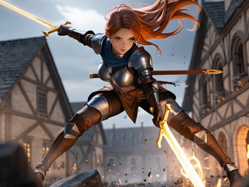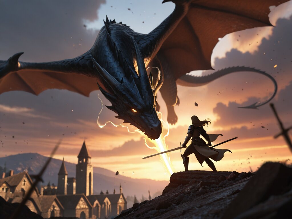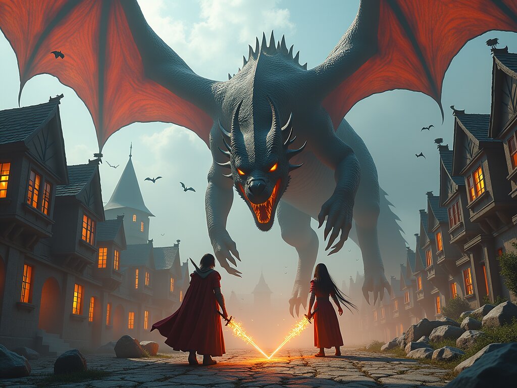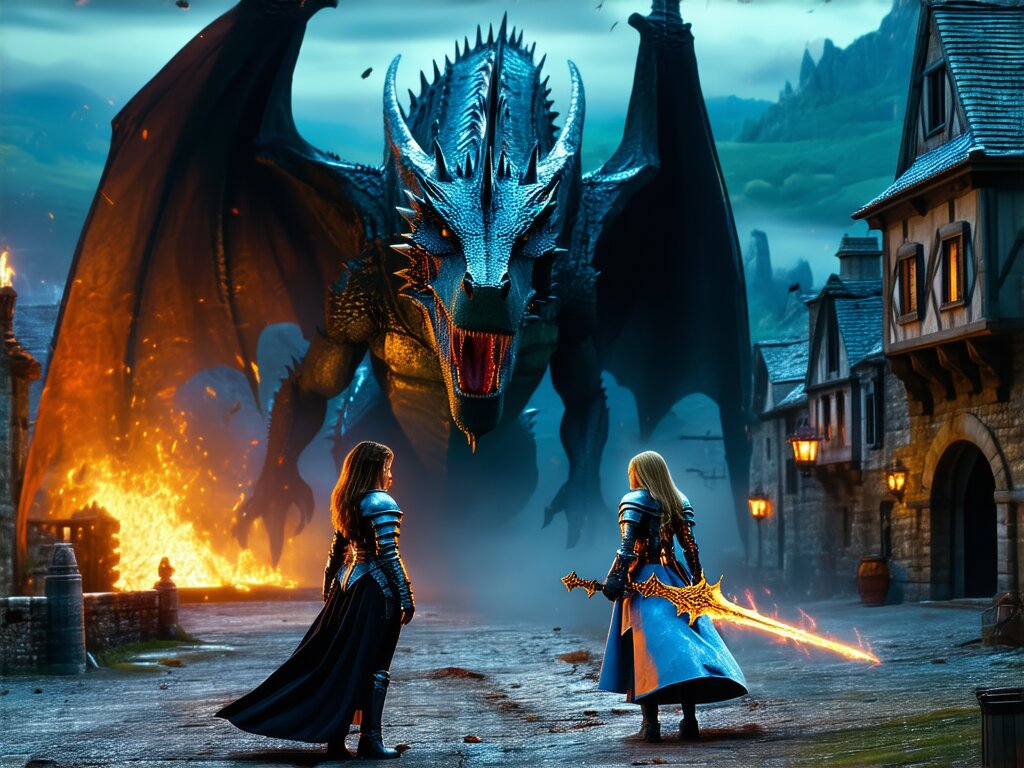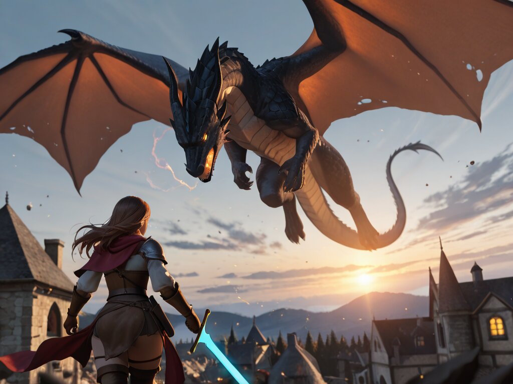 Masterpiece, Best Quality, Amazing Quality, Very Aesthetic, High Resolution, Ultra-Detailed, Absurdres, Newest, Scenery, 3D, Rendered, 1Girl, Warrior_Female, 1Girl, Magic_Female, Giant Dragon, Battle, Medieval Fantasy, Glowing Swords, Magical Spells, Flying Debris, World Filled, Fantasy Elements, Medieval_Town, Dramatic, Highly Detailed Depictions, Cinematic_Lighting, BREAK, Depth_of_Field, Volumetric_Lighting,