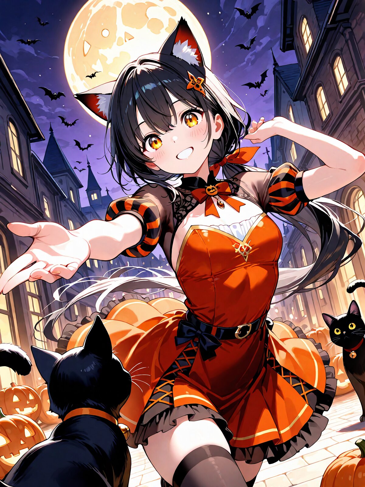 gold amber eyes, low ponytail, black hair, cat ears, black cat, red Halloween costume, Halloween night, illumination, grin, dynamic angle, dancing, happy,