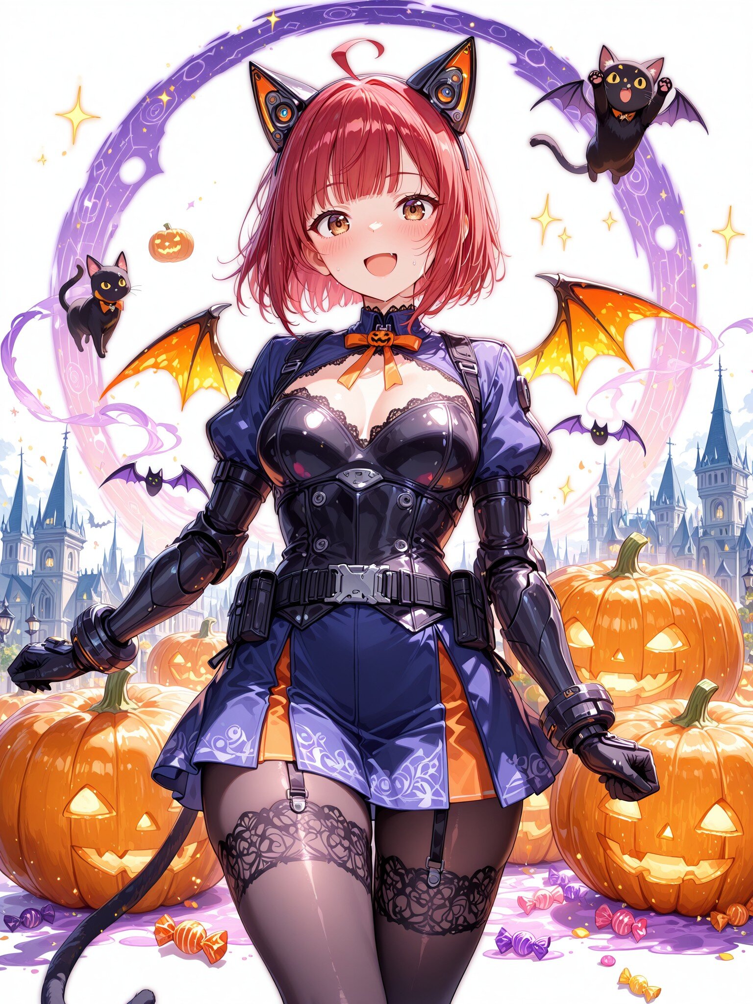 a futuristic female performer on stage wearing a black cyber suit with neon orange and violet lights, high-neck armored bodice, and glowing circuitry lines. translucent sleeves with LED veins and a small pumpkin emblem at her waist, short holographic skirt and thigh-high tights with hex patterns, long glowing ribbons flow behind her as she faces a cheering crowd, background: neon-lit Halloween city, digital bats and hologram pumpkins floating above the audience,