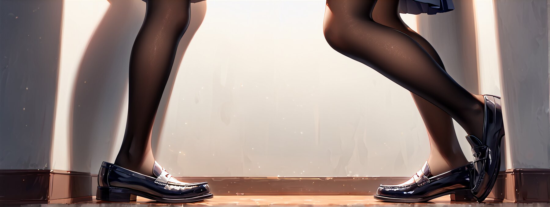 ((extremely detailed CG unity 8k wallpaper,delicate facial features, ultra high res, extremely detailed eyes and face, perfect anatomy:1.2,super detailed pantyhose,super fine illustration,cinematic lighting, cinematic shadow,)) (clothes reflecting light, caustics, deep shadows, faint light, strong light,) ((close up,feet focus,from below,)) 2girls, tight ankles, back shot, ((slender,)) lower body, ((closely)) standing, facing each other standing on tiptoe, loafer, by wall, check mini skirt, black thighs,hagging,kabedon,Pushing an opponent against a wall,Put your feet between your legs,wall slam, <lora:legs_detailed_2.0:0.66> detailed_legs, legs, <lora:kabedon_pony_2:0.61> kabedon, <lora:KabedompovPonyXL:0.6> kabedon,