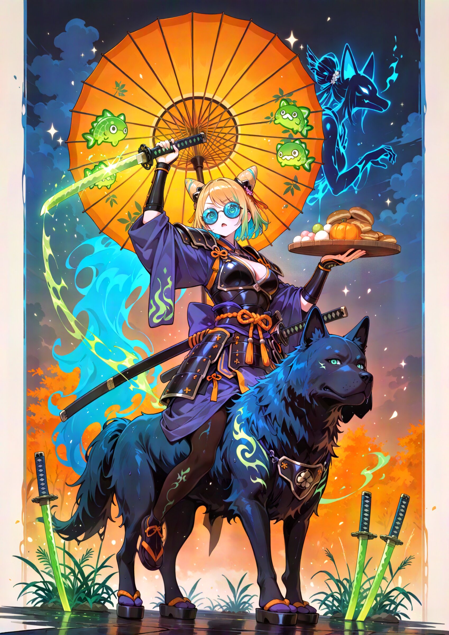 ,viewfinder looking at viewer, (dutch angle:1.2), autumn atmosphere, earthy color, glowing cool colored blue dog energy, cool colored blue silhouette of serious dog guardian, huge dog aura, orange and black theme, pumpkin, wagashi, dango, daifuku, taiyaki, green tea, dorayaki, youkan \(food\) on wooden tray, 1girl, samurai, (muscular female:0.65), yellow hair, darkmagenta colored tips, short hair, cone hair bun, hairpods,swept bangs , soft hair, coke-bottle glasses, beautiful emerald eyes long cleavage long breasts, ,, (holding Japanese lime green sword:1.3), scabbard, (lime green samurai armor, kusazuri,chest protector,kote:1.0), kanzashi, egasumi, sandals dog ears, dog tail, tabi, excited, , oil-paper umbrella, sheathed (swirling ink effects:1.2) jumping, midair, flexing, beautiful metallic luster, sharp katana, ultra detailed cool colored blue katana, silver particles, light trail, The background is a solid, bright cool colored blue, creating a striking contrast with the intricate, multi-colored design of the character, (fighting silhouette:0.0), pop color background, (high saturation:1.2), drop shadow, ink-drenched shadows, solid black shadow blocks, abstract ink swath background, heavy chiaroscuro, high-contrast inky shading, negative space, grunge texture, calligraphic strokes, susuki grass, super fine concept art, unreal engine, graceful eyes, masterpiece, best quality, amazing quality, very aesthetic, absurdres, newest, professional art lots of details, , overexposure, sumie effect style, 4ur4_illu,shiny, glowing, glowing particles, glowing light particles, light particles, vines, <lora:noline (1):-0.5> <lora:sdxl2-flat2-512b:0.0> <lora:facelightup_xl_v10:0.5> <lora:V2_yakumo_alchemy:0.5> <lora:Aura_illu:0.1>