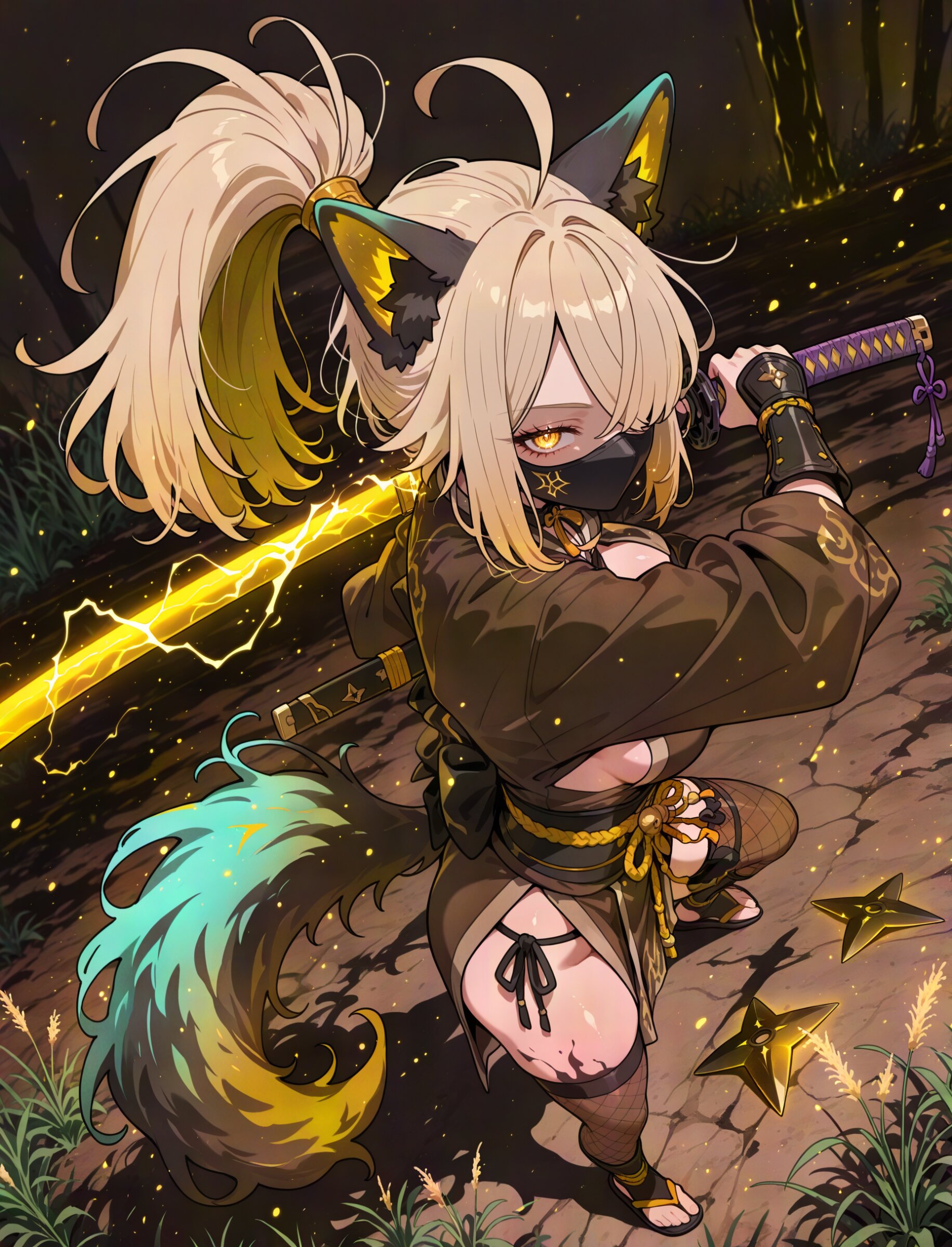 from side, looking at viewer, (portrait:1.0) (from above,looking up:1.0) , (dutch angle:1.2), weapon focus autumn atmosphere, earthy color, glowing gold wolf energy, gold silhouette of serious wolf guardian, huge wolf aura, 1girl, samurai, (muscular female:0.65), blonde hair, ivory colored inner hair, prehensile hair, ponytail hair over one eye ahoge messy hair, ,, beautiful gold eyes framed breasts, ,, ninja cloth, short kimono, obijime, fishnet inner, fishnets, fishnet thighhighs, pelvic curtain, panty straps,,, kote, (ninjutsu:1.1), (wearing big shuriken:1.1) black mask, , sideboob, zouri, , wolf ears, wolf tail, ,, japanese clothes, seductive smile, dynamic pose, kung fu attack, kung fu action, kuji-in, ninjutsu, reverse grip, raijin, lightning (swirling ink effects:1.2) fleeing, beautiful metallic luster, sharp katana, ultra detailed katana, silver particles, light trail, The background is a solid, bright maroon, creating a striking contrast with the intricate, multi-colored design of the character, (a lot of silhouette:0.0), pop color background, (high saturation:1.2), drop shadow, ink-drenched shadows, solid black shadow blocks, abstract ink swath background, heavy chiaroscuro, high-contrast inky shading, negative space, grunge texture, calligraphic strokes, susuki grass, super fine concept art, unreal engine, graceful eyes, masterpiece, best quality, amazing quality, very aesthetic, absurdres, newest, professional art lots of details, , overexposure, sumie effect style, 4ur4_illu,shiny, glowing, glowing particles, glowing light particles, light particles, forked lightning, <lora:noline (1):-0.5> <lora:sdxl2-flat2-512b:0.15> <lora:facelightup_xl_v10:0.5> <lora:V2_yakumo_alchemy:0.5> <lora:Aura_illu:0.1>