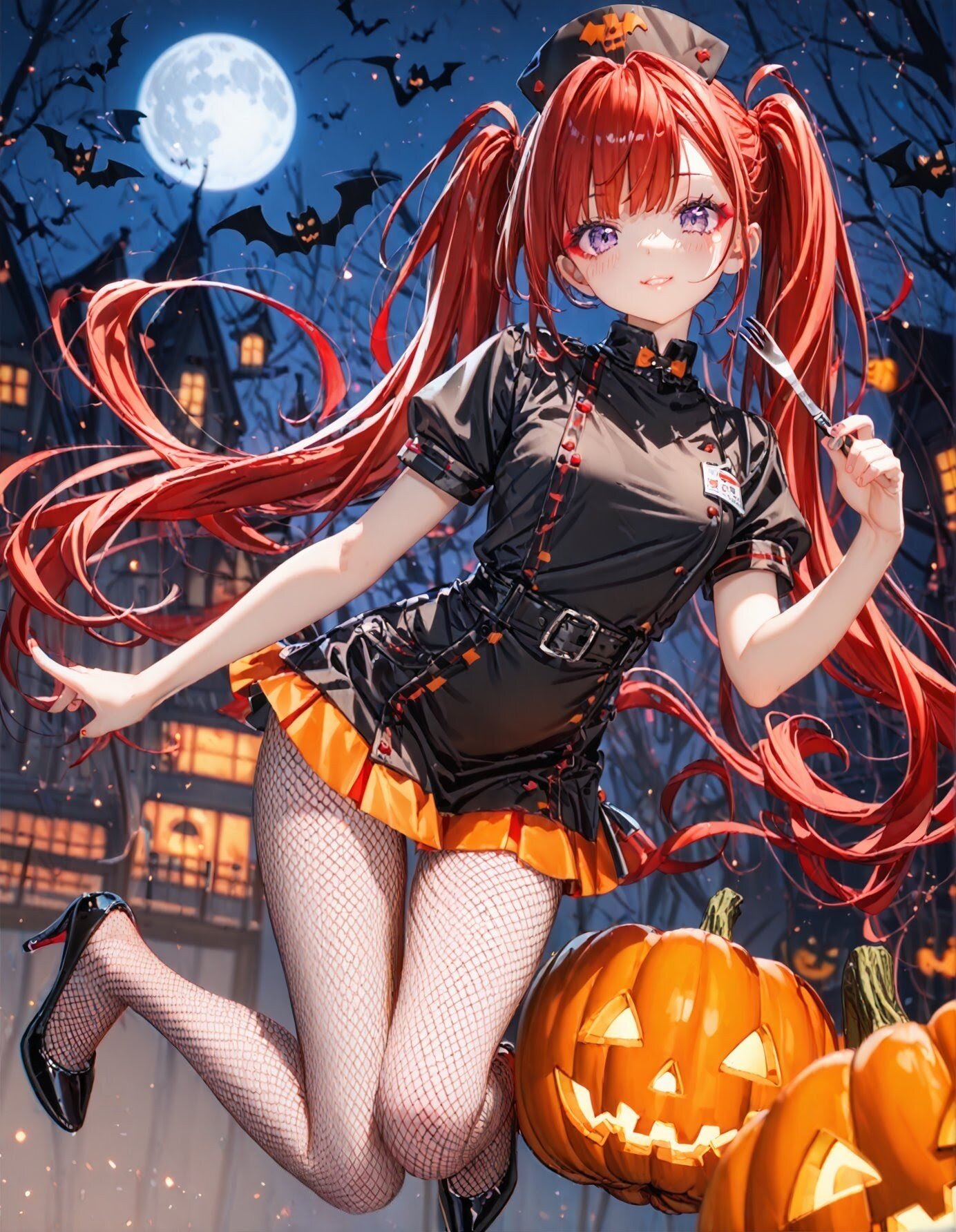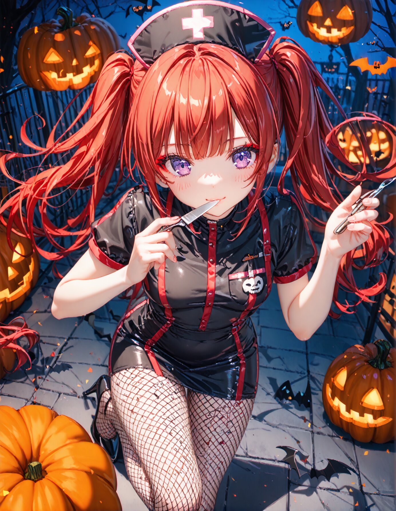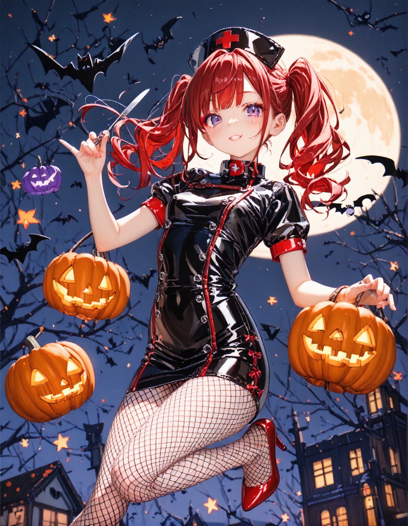 score_9, score_8_up, score_7_up, score_6_up, score_5_up, score_4_up, rating_safe, masterpiece, best quality, high quality, highres:1.0, ultra detailed, incredibly absurdres:1.0, textuer:1.0, source_anime:1.0, resized, vivid colors, perfect composition, (perfect anatomy:1.3), five fingers, beautiful detailed skin, extremely detailed clothes, detailed prism eye, (Halloween Theme:1.3), (dynamic angle:1.2), 1 beautiful girl, purple eyes, (Red eyeshadow,) (red hair), (pigtails), detailed face, detailed mouth, Glossy lips, make up, black nurse outfit, nurse cap, mini skirt, fishnet tights, (zettai ryouiki:1), high heels, (The hem of her short skirt, and the top of the socks fits snugly around her thighs). soft smile, blush, look at viewer, (holding a scalpel), Jack-o'-lanterns, flying bats, night time, moon lighting, <lora:flat_sdxl:-1>