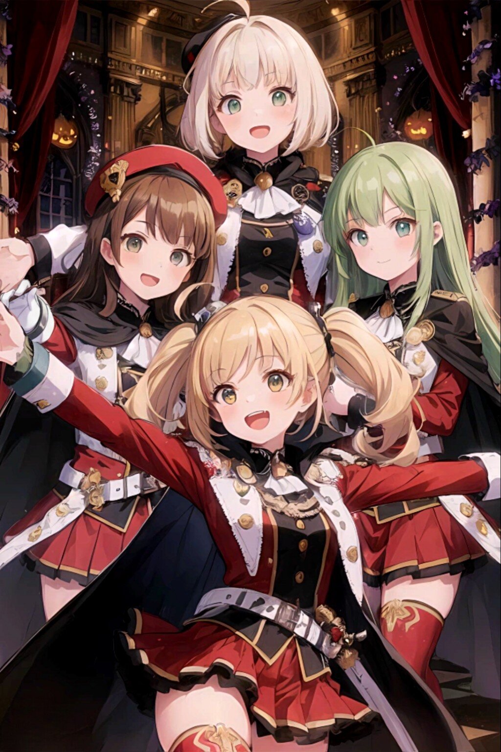 (masterpiece, best quality, ultra-detailed), 4 girls, anime style, One girl with blonde twin-tails, red and black military-style dress, white lace details, golden buttons, cape, Another girl with short blonde hair, similar military uniform, A girl with brown hair and a beret, military uniform, A girl with long green hair, military uniform, All are smiling and happy, arms outstretched or posing, Gothic interior, dim lighting, halloween decorations in the background, pumpkins, chandeliers, dark curtains, Dynamic pose, vibrant colors, soft lighting, sharp focus, looking at camera