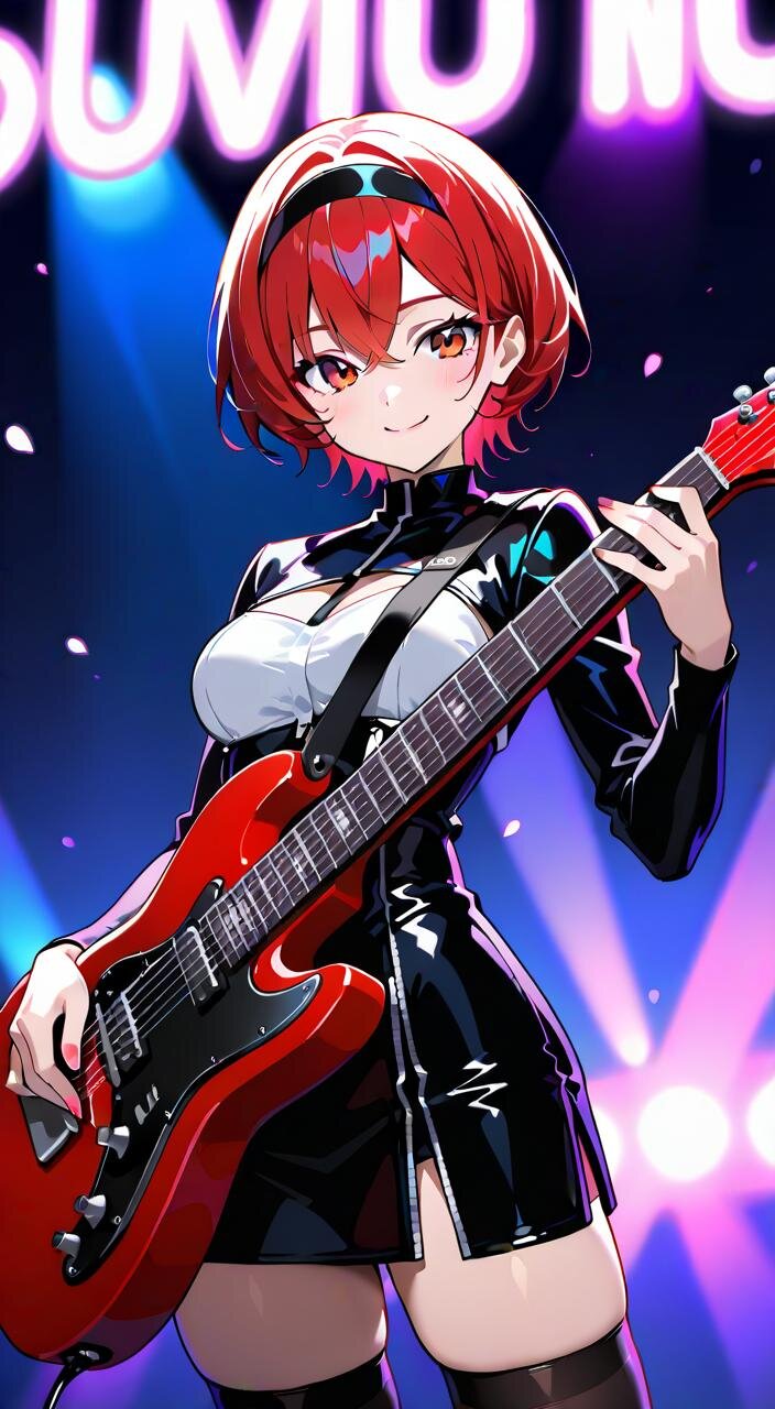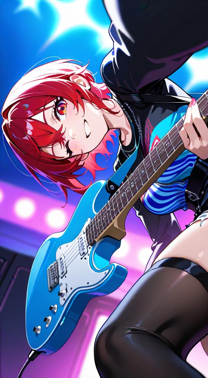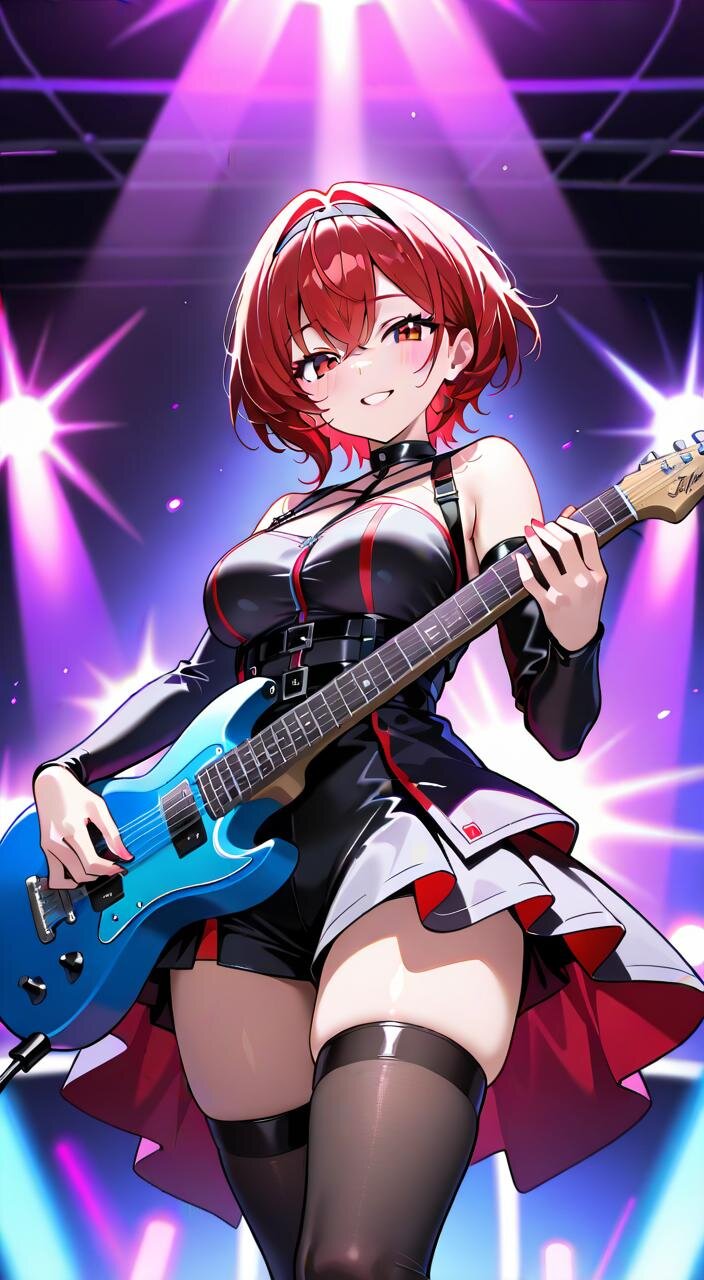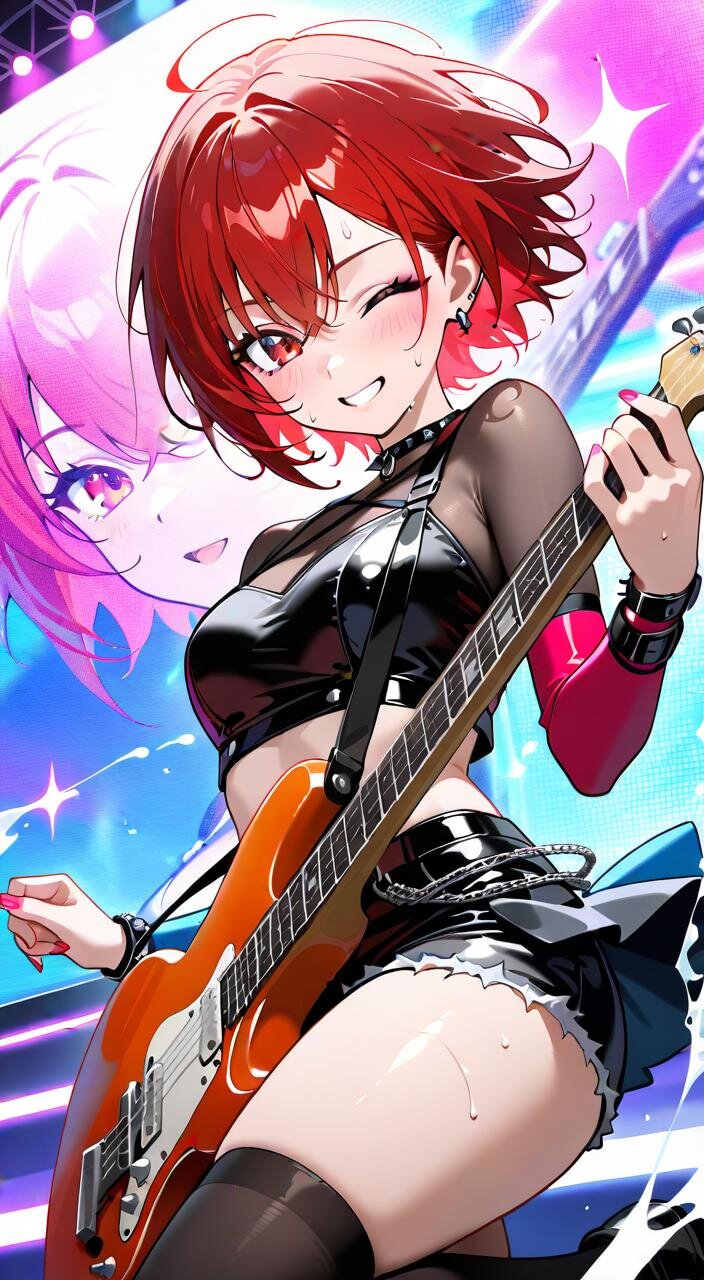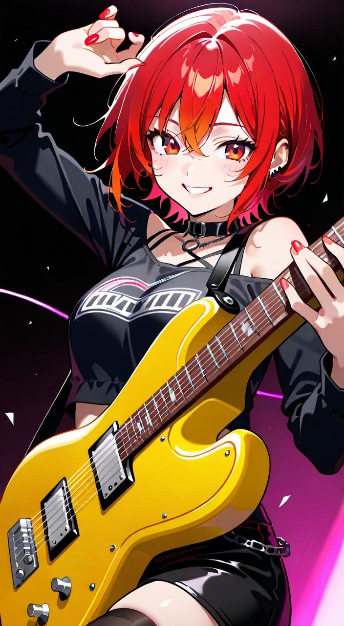 黒のロック衣装に身を包み、ギターを握る姿は、まるで炎のように熱く、そして美しい。