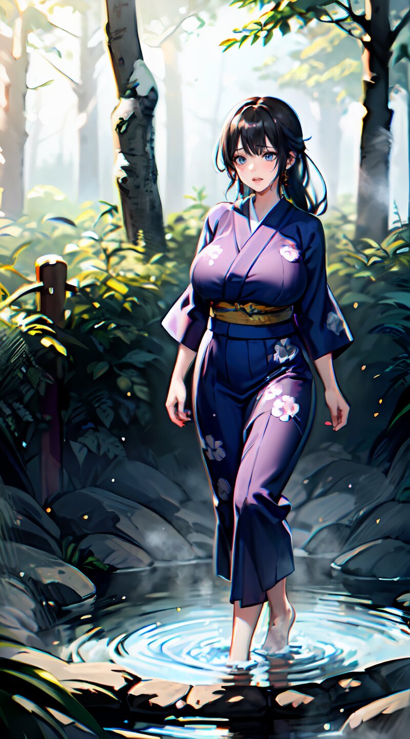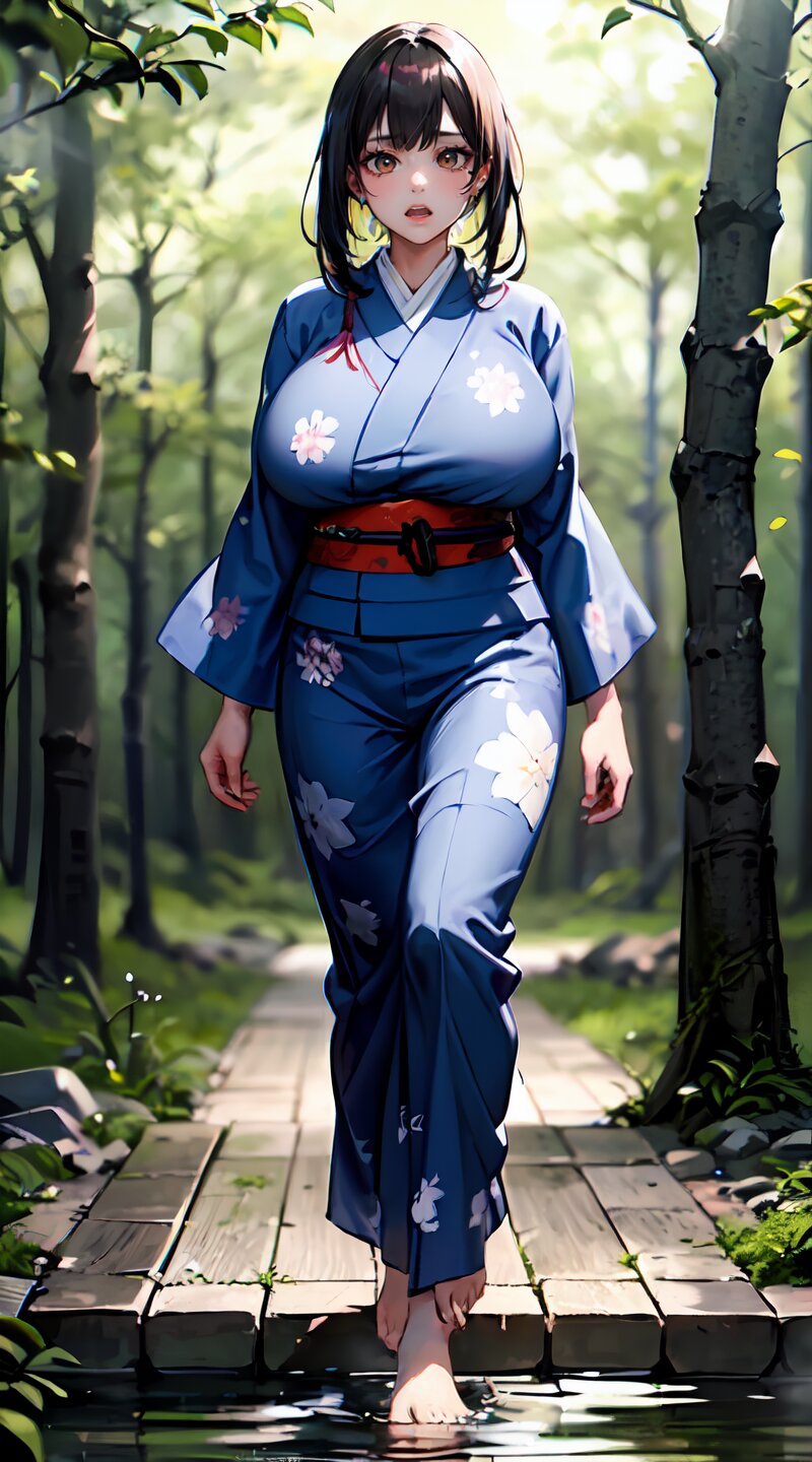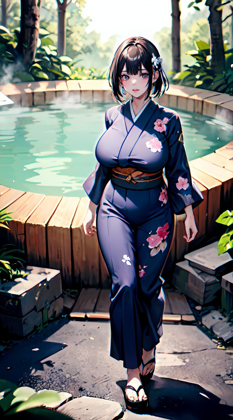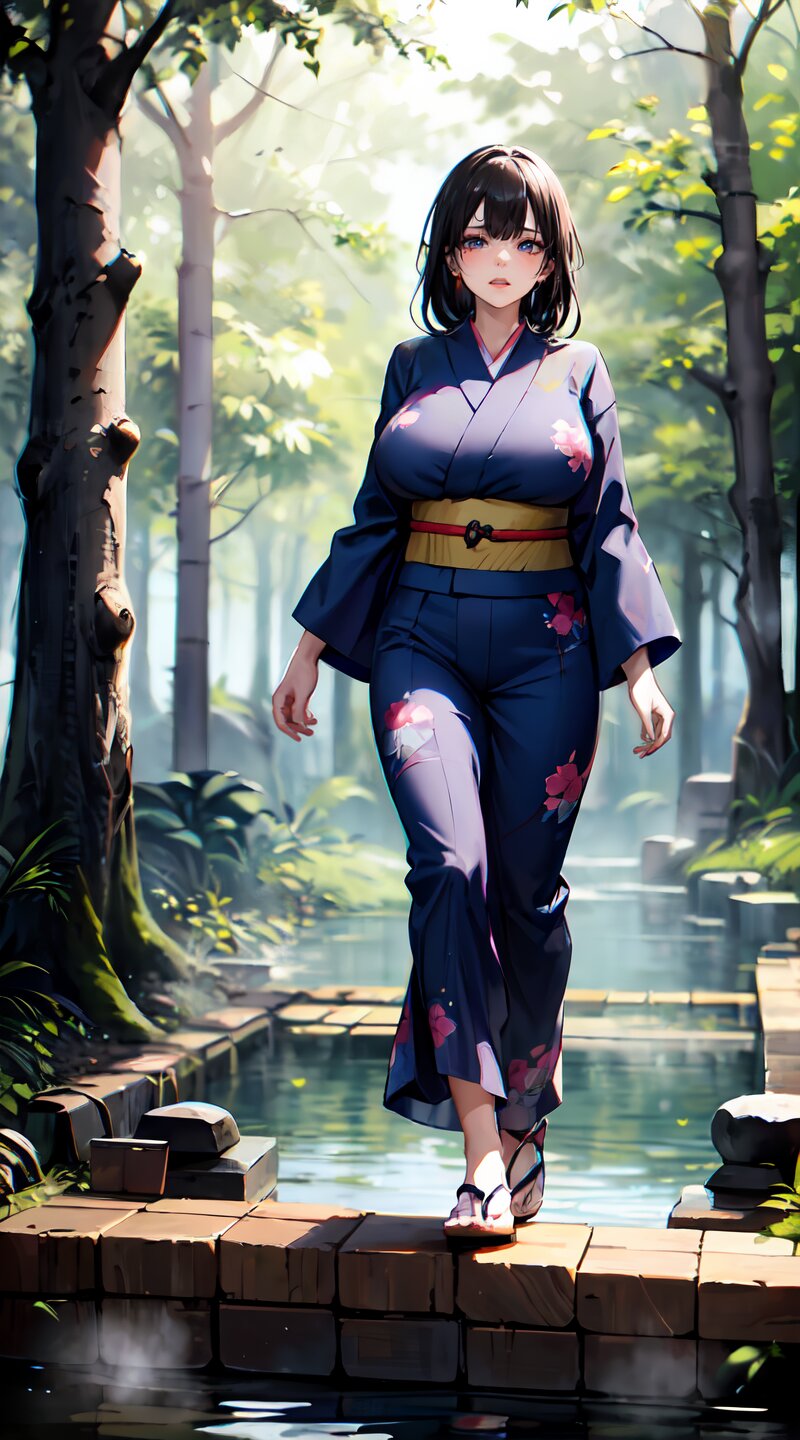 (from front: 1.2), photography, (masterpiece:1.3), (best quality:1.3), (ultra-detailed:1.2), 8K, HDR, (incredibly absurdres:1.2), (vibrant color:1.2), ray tracing, dynamic angle, cinematic angle, blurry background, 1girl with 3boys, 16 years old, (((japanese yukata))), plump, (perfect body), black long hair, (full body: 1.6), (huge breasts: 1.4), open mouth, highly detailed, beautiful detailed glow, detailed light, shiny skin, shiny hair, (walking beside of the hot spring in woods: 1.4), <lora:momojiri v01:1>