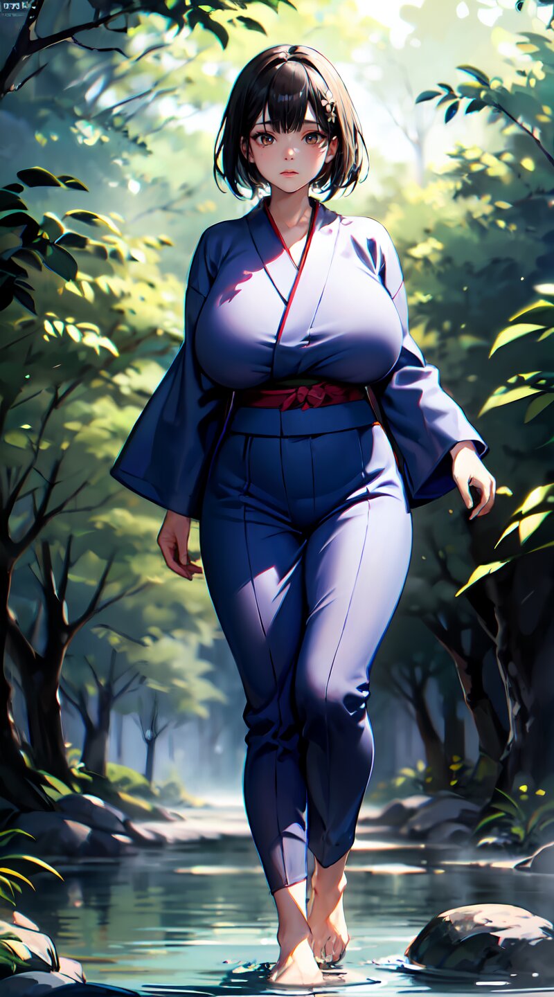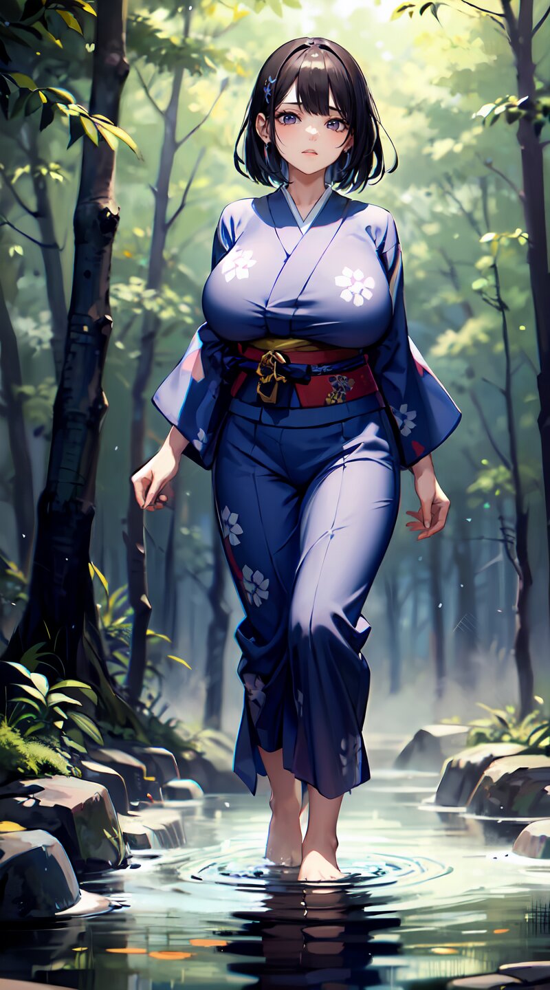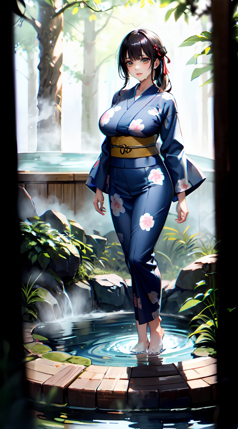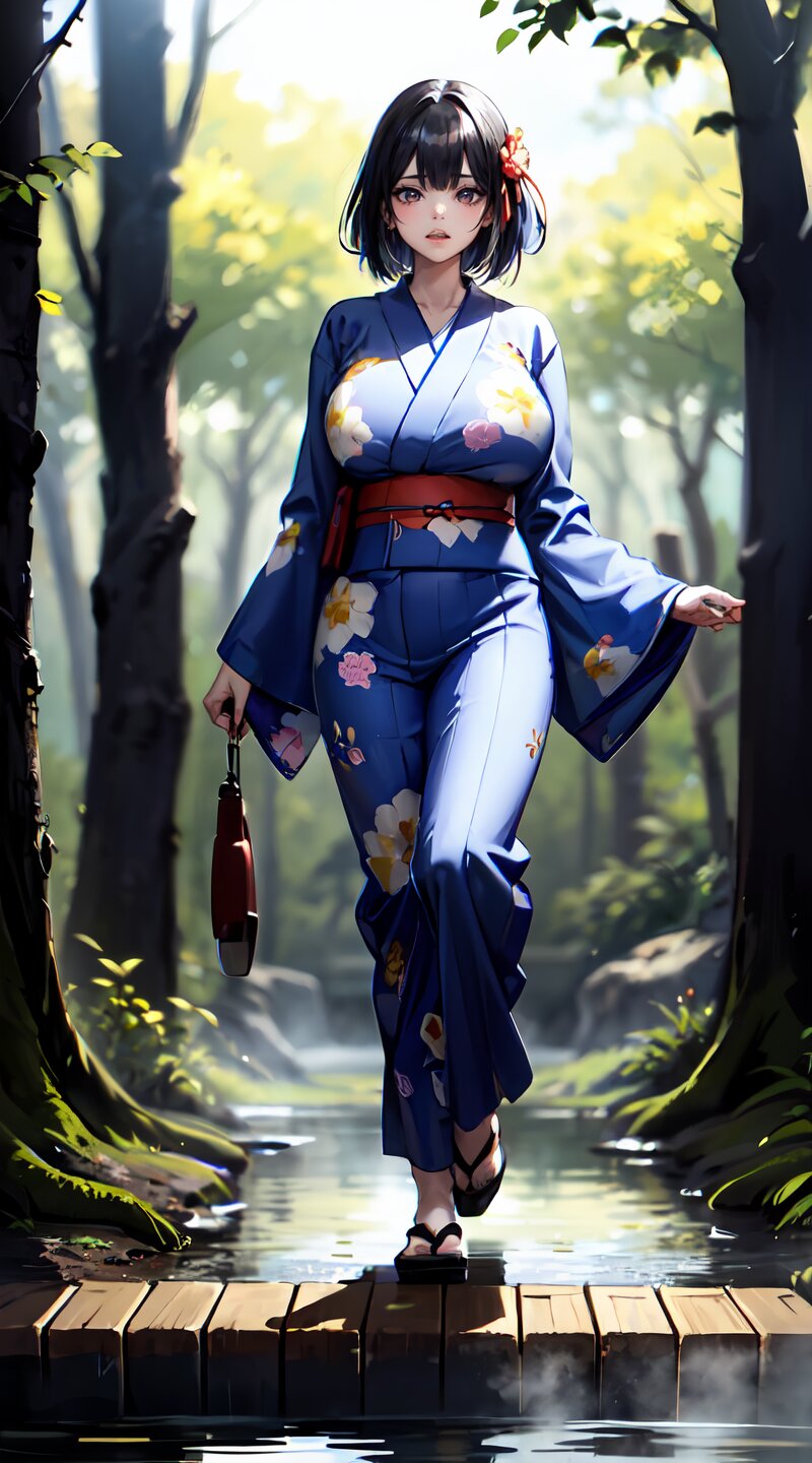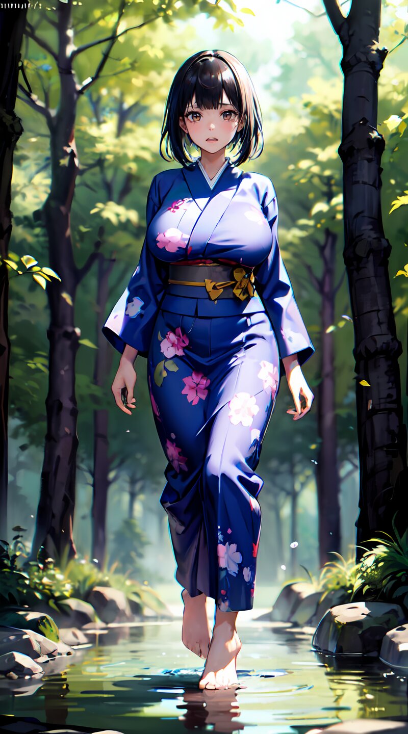 (from front: 1.2), photography, (masterpiece:1.3), (best quality:1.3), (ultra-detailed:1.2), 8K, HDR, (incredibly absurdres:1.2), (vibrant color:1.2), ray tracing, dynamic angle, cinematic angle, blurry background, 1girl with 3boys, 16 years old, (((japanese yukata))), plump, (perfect body), black long hair, (full body: 1.6), (huge breasts: 1.4), open mouth, highly detailed, beautiful detailed glow, detailed light, shiny skin, shiny hair, (walking beside of the hot spring in woods: 1.4), <lora:momojiri v01:1>