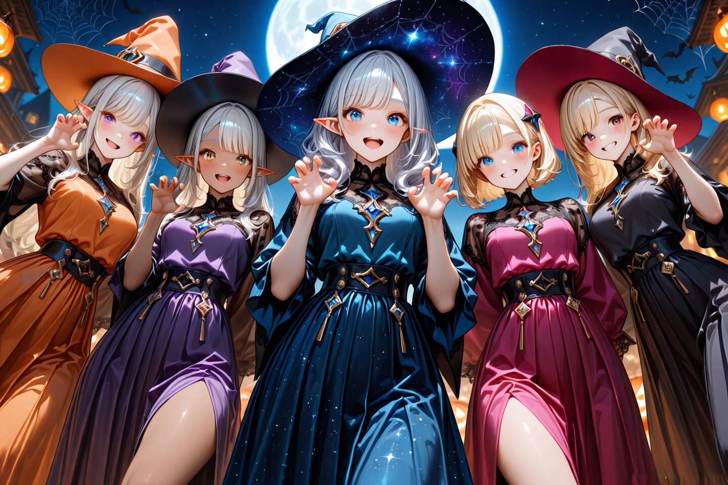 (theme is Halloween night), sfw:1.2. background is Halloween festival, fantasy, fine detail, official art, (background is a large full moon in the night sky), Intricate embroidery and decoration, cowboy shot, open mouth, happy smile, gaze at viewer, close-up eyes, face focus, claw pose, low angle, from below, ultra detailed lips, ultra detailed face and hair, ultra detaild eyes, beautiful eyes, kawaii, adorable, cute, close together, (print clothing, blue print, starry print, The girl is wears is sheer, Women's Mage long dress, cut out detail and wide-brimmed hat, high-heeled shoes, spiderweb lace, bats, The color scheme is mainly orange, black, and purple, with red and white accents. The materials combine glossy satin and matte fabric, designed to stand out on stage. She is posed confidently under dramatic stage lighting, radiating both elegance charm, Orange, purple colored clothes). BREAK, 4 girls, (apatite eyes with CGI Effect), (deep blonde hair:1.2), pointy ears, BREAK, 4girls, golden eyes, Moist eyes, (dark skin:1.4), dark-skinned female:1.4, (shine silver hair:1.3), pointy ears, BREAK, 4girls silver hair, emerald eyes,happy smile, grin, BREAK, 4girls blonde hair, long hair, red eyes, pointy ears, (medium breast), open mouth big smile, (dark skin:1.4), dark-skinned female:1.4, anime style, anime color,, <lora:elf-san_alpha1(AnimagineV31):0.7> <lora:elf-san_alpha4(IL1.0):0.7>, masterpiece, amazing quality, very aesthetic, high resolution, ultra-detailed, absolute, newest, 2d, semi-realistic, moe heroine, sharp focus,