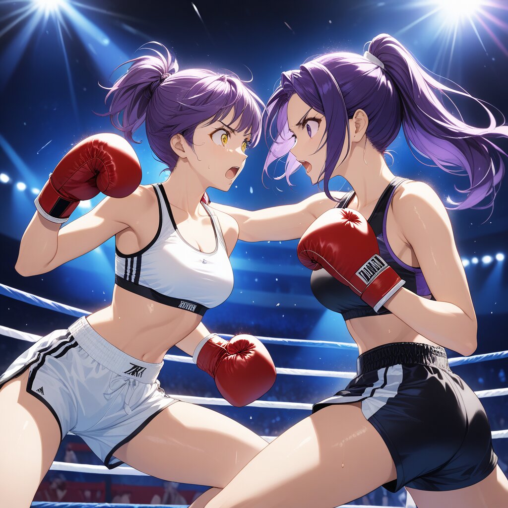 A highly detailed and dynamically rendered anime-style illustration depicting two young women engaged in a boxing match in a brightly lit arena. The character in the foreground has short purple hair and purple eyes, wearing a white sports bra and light shorts with blue boxing gloves, showing a surprised or pained expression as she takes a hit. The character above her has dark purple hair tied in a ponytail and yellow eyes, wearing a black sports bra and dark shorts with red boxing gloves, in the act of delivering a powerful punch. Both characters' skin is glistening with sweat, and their movements are energetic, emphasized by vibrant, colorful light trails and lens flares from the arena lights in the background, creating a dazzling and intense atmosphere. The lighting is sharp and clear, highlighting a strong, lustrous sheen on their skin, clothing, and the boxing gloves, making the entire image pop with exceptional clarity and a sense of fierce action.