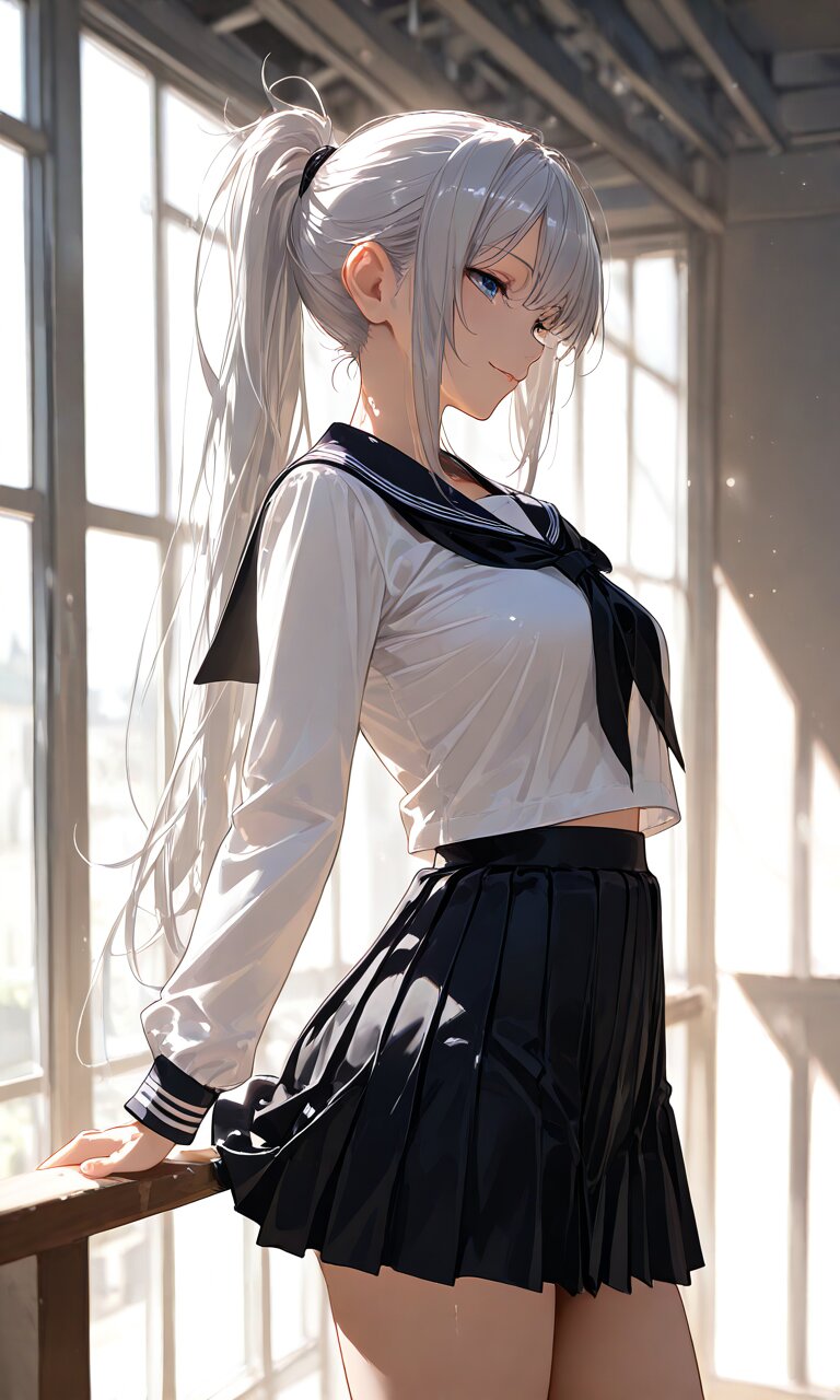 (best quality),(masterpiece),(ultra detailed),1 lady, seductive smile, long ponytail, silver hair, blue eyes, school uniform, (black cloth), side view, cowboy shot, looking away